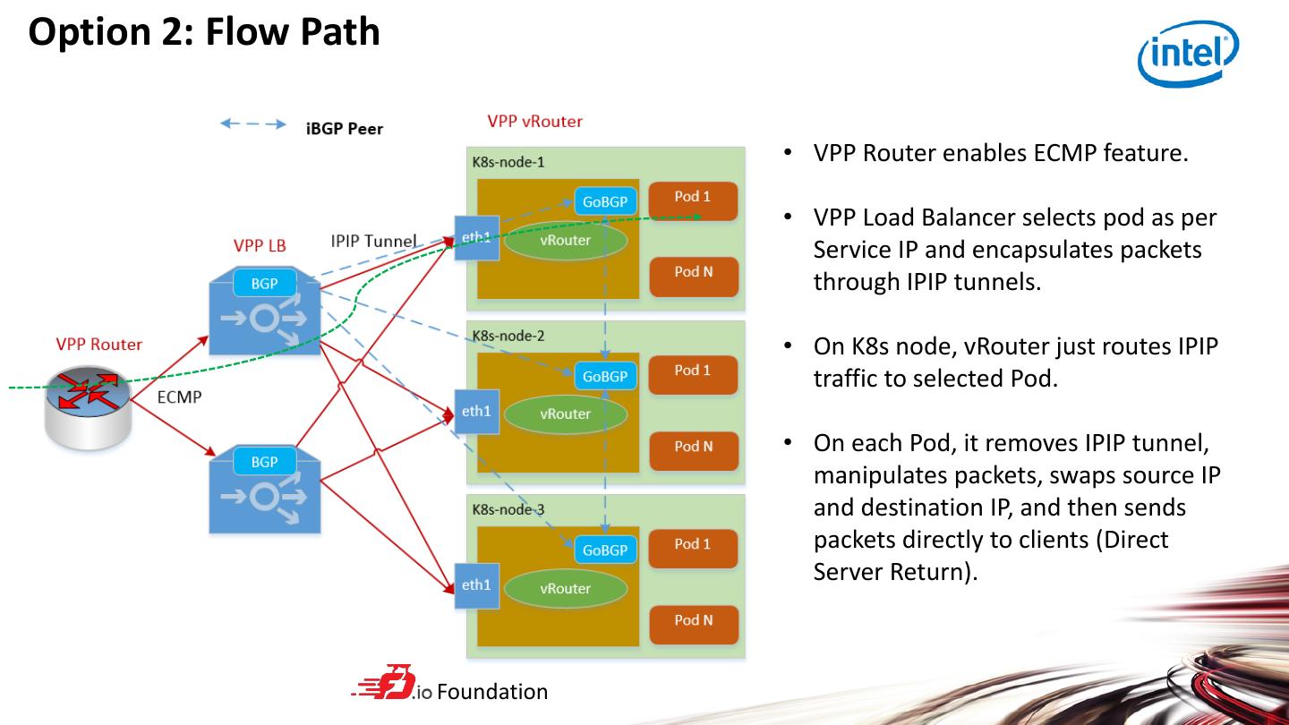 15 .Option 2: Flow Path • VPP Router enables ECMP feature. • VPP Load Balancer selects pod as per Service IP and encapsulates packets through IPIP tunnels. • On K8s node, vRouter just routes IPIP traffic to selected Pod. • On each Pod, it removes IPIP tunnel, manipulates packets, swaps source IP and destination IP, and then sends packets directly to clients (Direct Server Return). Foundation