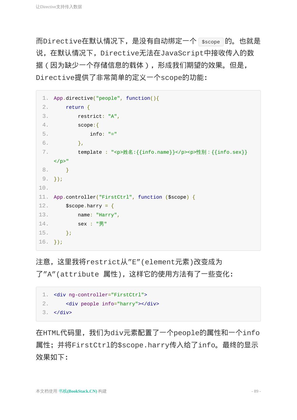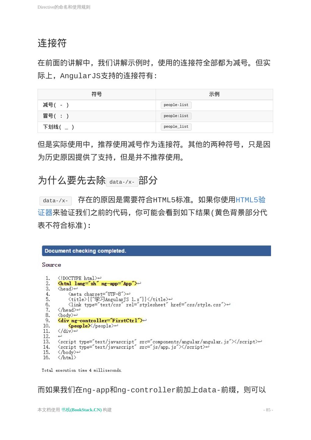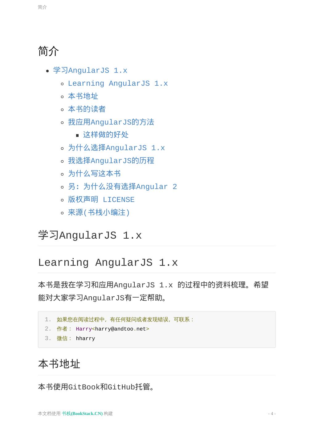 4 .简介 简介 学习AngularJS 1.x Learning AngularJS 1.x 本书地址 本书的读者 我应用AngularJS的方法 这样做的好处 为什么选择AngularJS 1.x 我选择AngularJS的历程 为什么写这本书 另:为什么没有选择Angular 2 版权声明 LICENSE 来源(书栈小编注) 学习AngularJS 1.x Learning AngularJS 1.x 本书是我在学习和应用AngularJS 1.x 的过程中的资料梳理。希望 能对大家学习AngularJS有一定帮助。 1. 如果您在阅读过程中,有任何疑问或者发现错误,可联系: 2. 作者: Harry<harry@andtoo.net> 3. 微信: hharry 本书地址 本书使用GitBook和GitHub托管。 本文档使用 书栈(BookStack.CN) 构建 - 4 -
