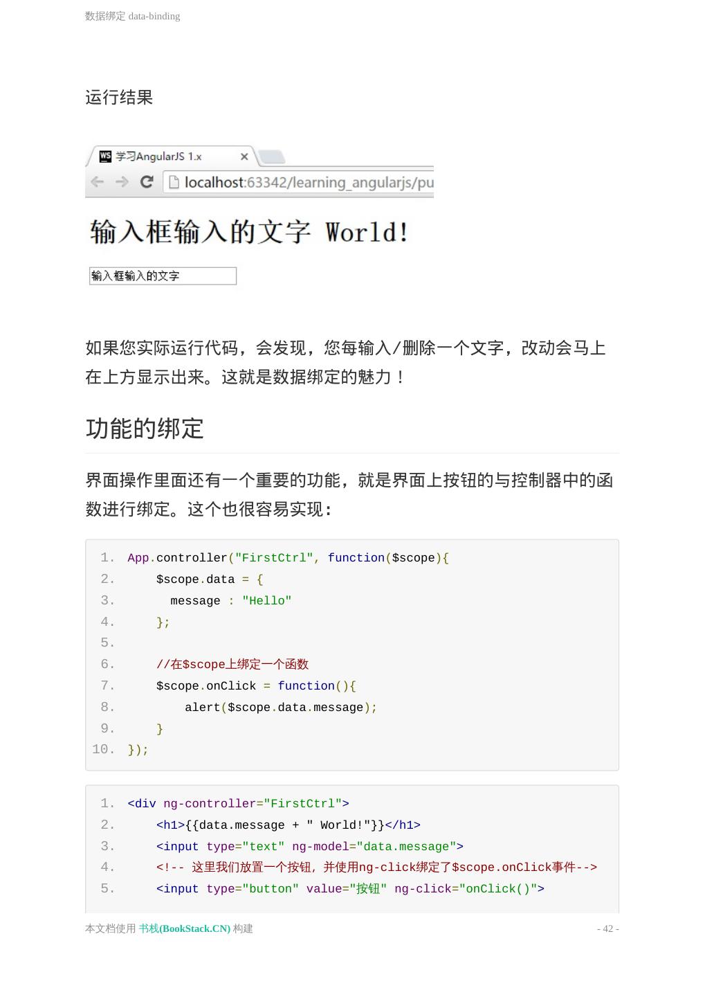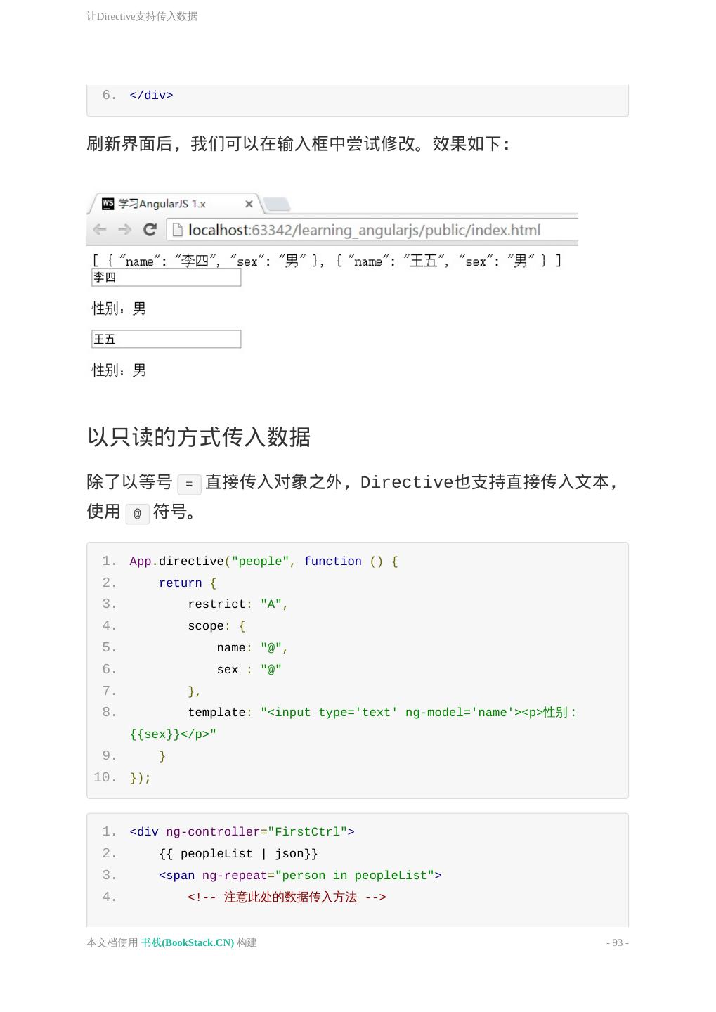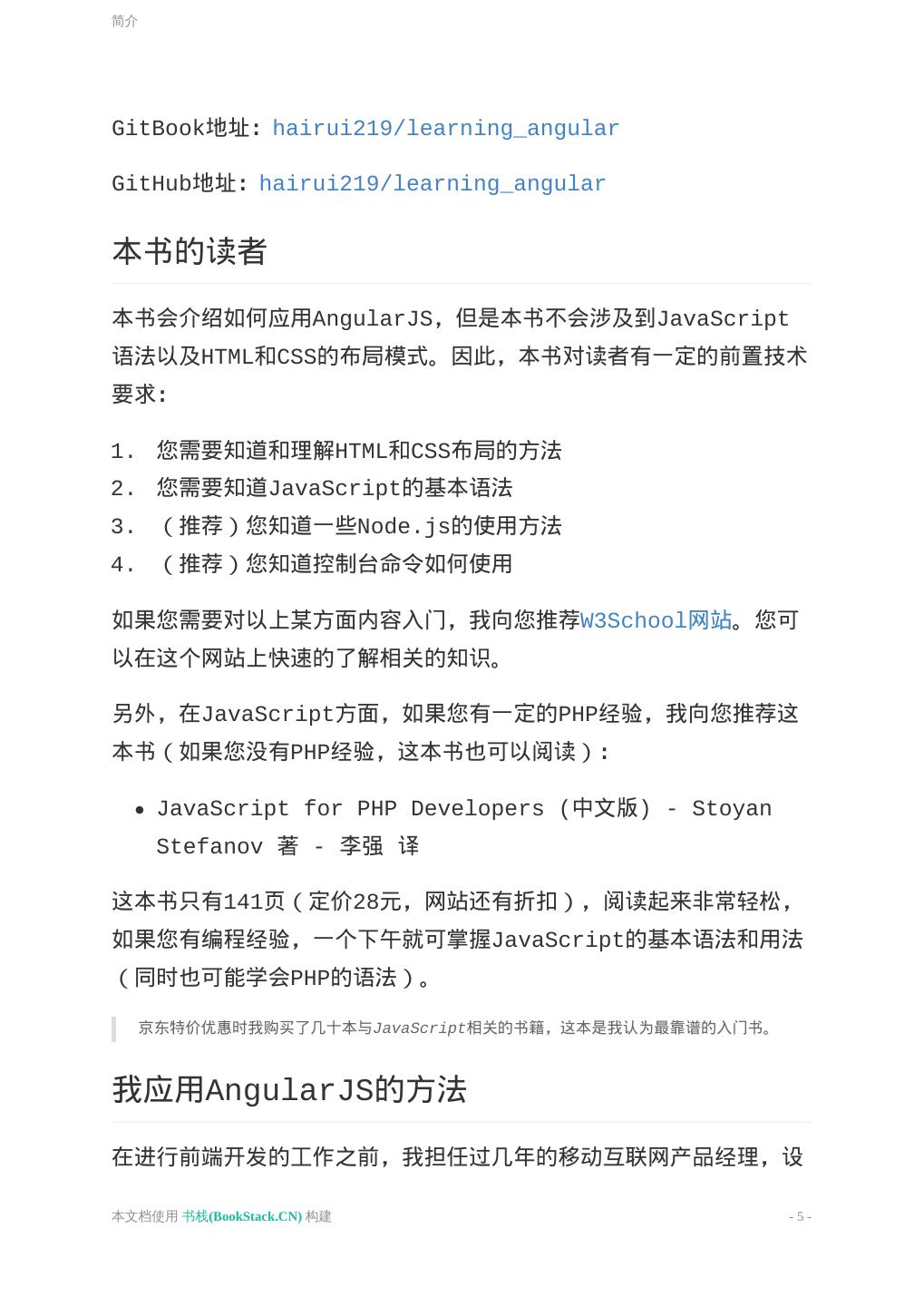 5 .简介 GitBook地址:hairui219/learning_angular GitHub地址:hairui219/learning_angular 本书的读者 本书会介绍如何应用AngularJS,但是本书不会涉及到JavaScript 语法以及HTML和CSS的布局模式。因此,本书对读者有一定的前置技术 要求: 1. 您需要知道和理解HTML和CSS布局的方法 2. 您需要知道JavaScript的基本语法 3. (推荐)您知道一些Node.js的使用方法 4. (推荐)您知道控制台命令如何使用 如果您需要对以上某方面内容入门,我向您推荐W3School网站。您可 以在这个网站上快速的了解相关的知识。 另外,在JavaScript方面,如果您有一定的PHP经验,我向您推荐这 本书(如果您没有PHP经验,这本书也可以阅读): JavaScript for PHP Developers (中文版) - Stoyan Stefanov 著 - 李强 译 这本书只有141页(定价28元,网站还有折扣),阅读起来非常轻松, 如果您有编程经验,一个下午就可掌握JavaScript的基本语法和用法 (同时也可能学会PHP的语法)。 京东特价优惠时我购买了几十本与JavaScript相关的书籍,这本是我认为最靠谱的入门书。 我应用AngularJS的方法 在进行前端开发的工作之前,我担任过几年的移动互联网产品经理,设 本文档使用 书栈(BookStack.CN) 构建 - 5 -