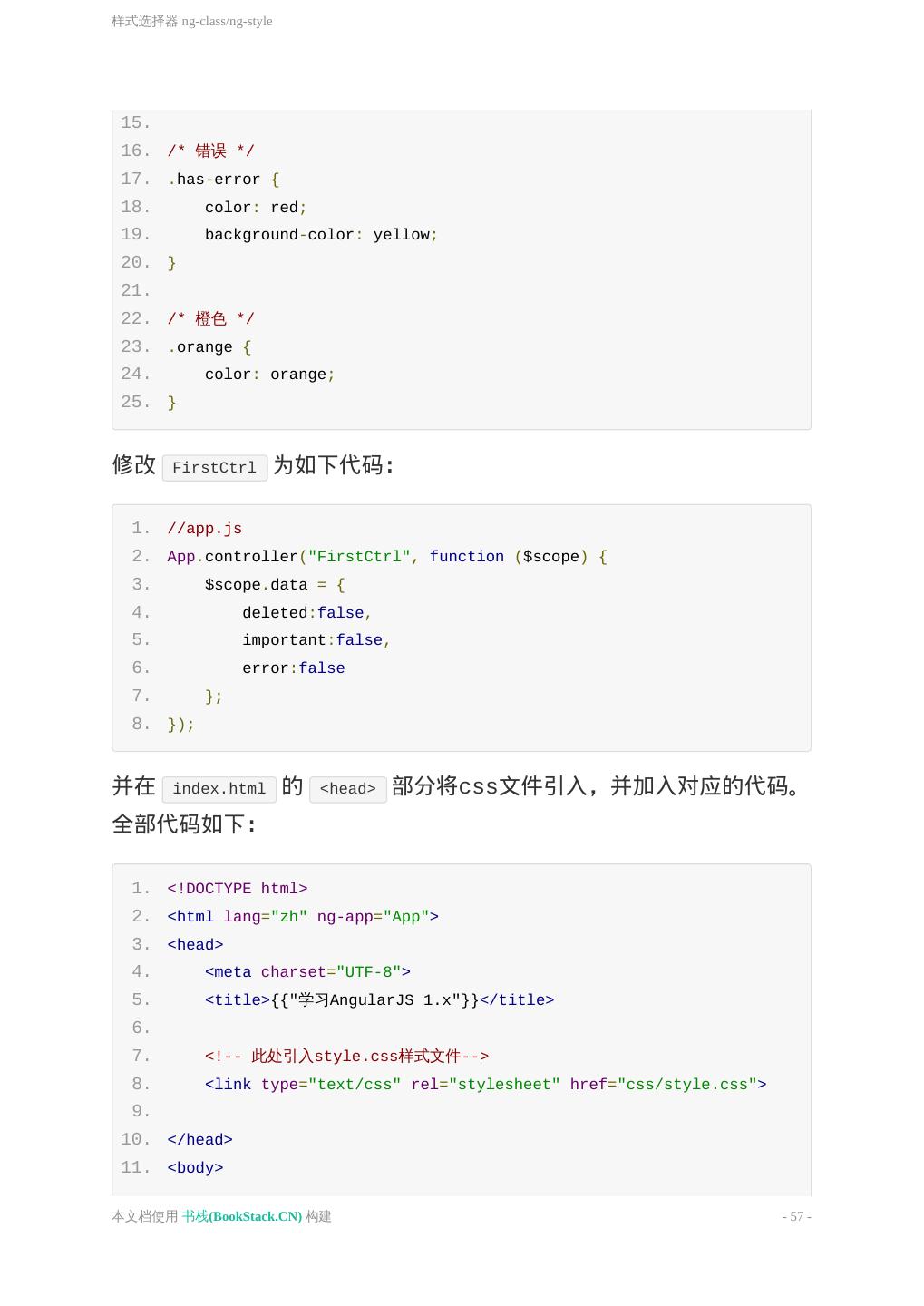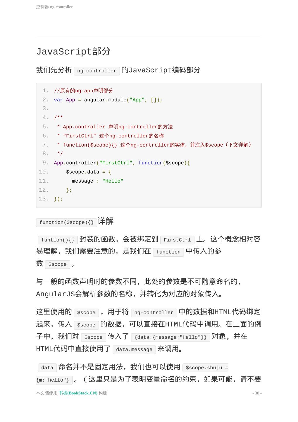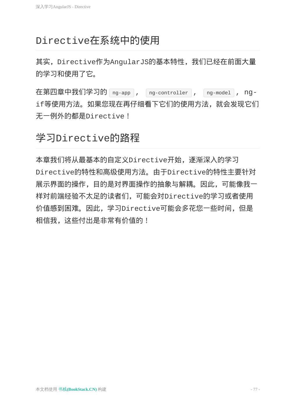 5 .简介 GitBook地址:hairui219/learning_angular GitHub地址:hairui219/learning_angular 本书的读者 本书会介绍如何应用AngularJS,但是本书不会涉及到JavaScript 语法以及HTML和CSS的布局模式。因此,本书对读者有一定的前置技术 要求: 1. 您需要知道和理解HTML和CSS布局的方法 2. 您需要知道JavaScript的基本语法 3. (推荐)您知道一些Node.js的使用方法 4. (推荐)您知道控制台命令如何使用 如果您需要对以上某方面内容入门,我向您推荐W3School网站。您可 以在这个网站上快速的了解相关的知识。 另外,在JavaScript方面,如果您有一定的PHP经验,我向您推荐这 本书(如果您没有PHP经验,这本书也可以阅读): JavaScript for PHP Developers (中文版) - Stoyan Stefanov 著 - 李强 译 这本书只有141页(定价28元,网站还有折扣),阅读起来非常轻松, 如果您有编程经验,一个下午就可掌握JavaScript的基本语法和用法 (同时也可能学会PHP的语法)。 京东特价优惠时我购买了几十本与JavaScript相关的书籍,这本是我认为最靠谱的入门书。 我应用AngularJS的方法 在进行前端开发的工作之前,我担任过几年的移动互联网产品经理,设 本文档使用 书栈(BookStack.CN) 构建 - 5 -