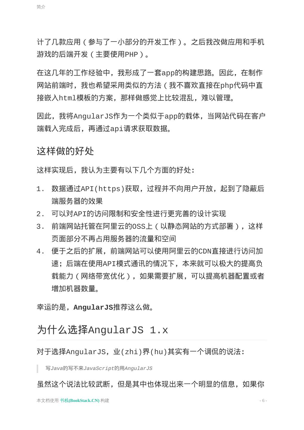 6 .简介 计了几款应用(参与了一小部分的开发工作)。之后我改做应用和手机 游戏的后端开发(主要使用PHP)。 在这几年的工作经验中,我形成了一套app的构建思路。因此,在制作 网站前端时,我也希望采用类似的方法(我不喜欢直接在php代码中直 接嵌入html模板的方案,那样做感觉上比较混乱,难以管理。 因此,我将AngularJS作为一个类似于app的载体,当网站代码在客户 端载入完成后,再通过api请求获取数据。 这样做的好处 这样实现后,我认为主要有以下几个方面的好处: 1. 数据通过API(https)获取,过程并不向用户开放,起到了隐蔽后 端服务器的效果 2. 可以对API的访问限制和安全性进行更完善的设计实现 3. 前端网站托管在阿里云的OSS上(以静态网站的方式部署),这样 页面部分不再占用服务器的流量和空间 4. 便于之后的扩展,前端网站可以使用阿里云的CDN直接进行访问加 速;后端在使用API模式通讯的情况下,本来就可以极大的提高负 载能力(网络带宽优化),如果需要扩展,可以提高机器配置或者 增加机器数量。 幸运的是,AngularJS推荐这么做。 为什么选择AngularJS 1.x 对于选择AngularJS,业(zhi)界(hu)其实有一个调侃的说法: 写Java的写不来JavaScript的用AngularJS 虽然这个说法比较武断,但是其中也体现出来一个明显的信息,如果你 本文档使用 书栈(BookStack.CN) 构建 - 6 -