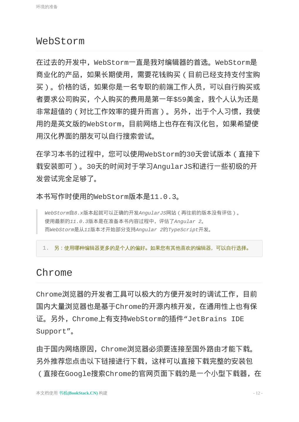 12 .环境的准备 WebStorm 在过去的开发中,WebStorm一直是我对编辑器的首选。WebStorm是 商业化的产品,如果长期使用,需要花钱购买(目前已经支持支付宝购 买)。价格的话,如果你是一名专职的前端工作人员,可以自行购买或 者要求公司购买,个人购买的费用是第一年$59美金,我个人认为还是 非常超值的(对比工作效率的提升而言)。另外,出于个人习惯,我使 用的是英文版的WebStorm,目前网络上也存在有汉化包,如果希望使 用汉化界面的朋友可以自行搜索尝试。 在学习本书的过程中,您可以使用WebStorm的30天尝试版本(直接下 载安装即可)。30天的时间对于学习AngularJS和进行一些初级的开 发尝试完全足够了。 本书写作时使用的WebStorm版本是11.0.3。 WebStorm自8.x版本起就可以正确的开发AngularJS网站(再往前的版本没有评估)。 使用最新的11.0.3版本是在准备本书内容过程中,评估了Angular 2。 而WebStorm是从11版本才开始部分支持Angular 2的TypeScript开发。 1. 另:使用哪种编辑器更多的是个人的偏好。如果您有其他喜欢的编辑器,可以自行选择。 Chrome Chrome浏览器的开发者工具可以极大的方便开发时的调试工作,目前 国内大量浏览器也是基于Chrome的开源内核开发,在通用性上也有保 证。另外,Chrome上有支持WebStorm的插件“JetBrains IDE Support”。 由于国内网络原因,Chrome浏览器必须要连接至国外路由才能下载。 另外推荐您点击以下链接进行下载,这样可以直接下载完整的安装包 (直接在Google搜索Chrome的官网页面下载的是一个小型下载器,在 本文档使用 书栈(BookStack.CN) 构建 - 12 -