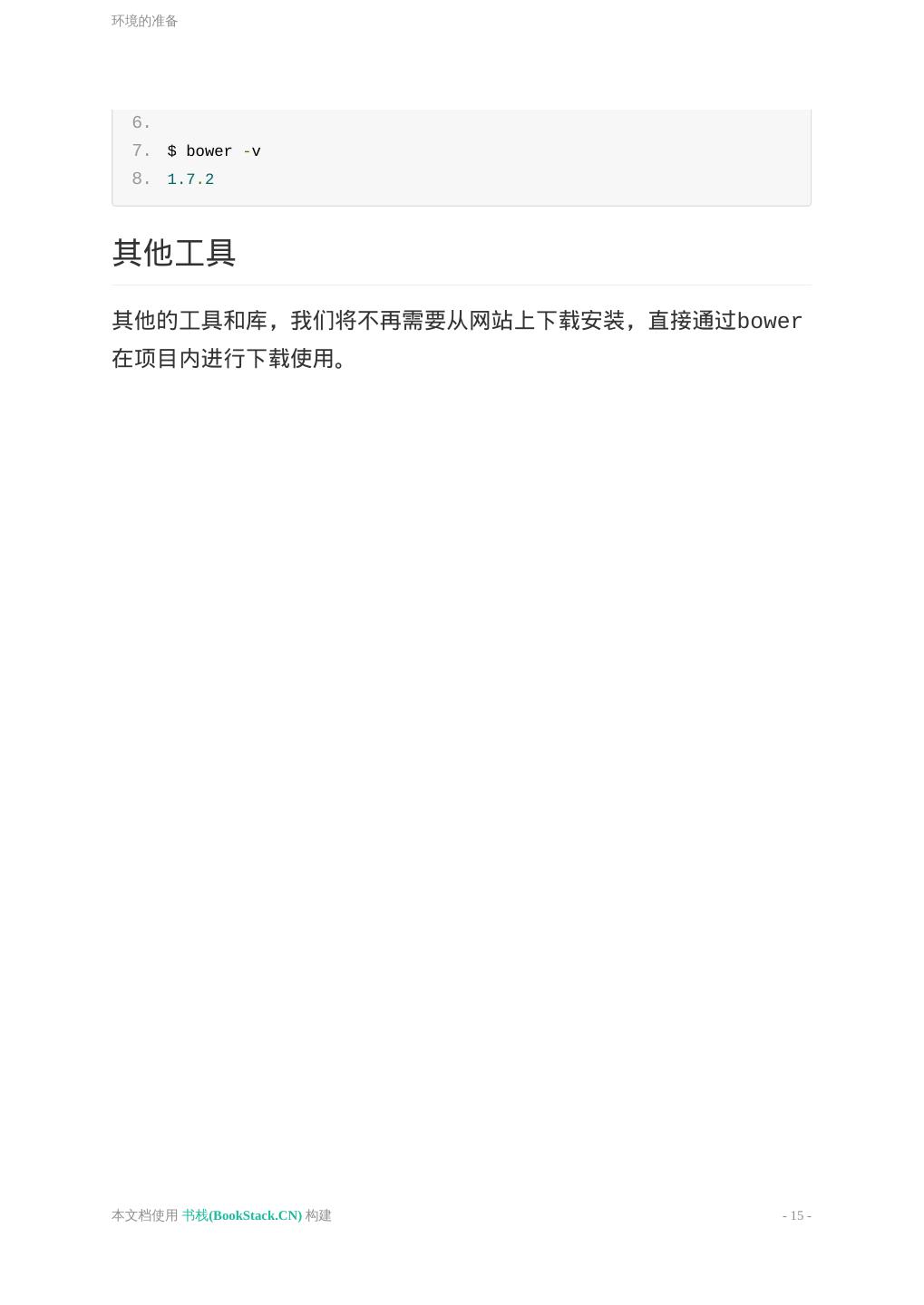 15 .环境的准备 6. 7. $ bower -v 8. 1.7.2 其他工具 其他的工具和库,我们将不再需要从网站上下载安装,直接通过bower 在项目内进行下载使用。 本文档使用 书栈(BookStack.CN) 构建 - 15 -