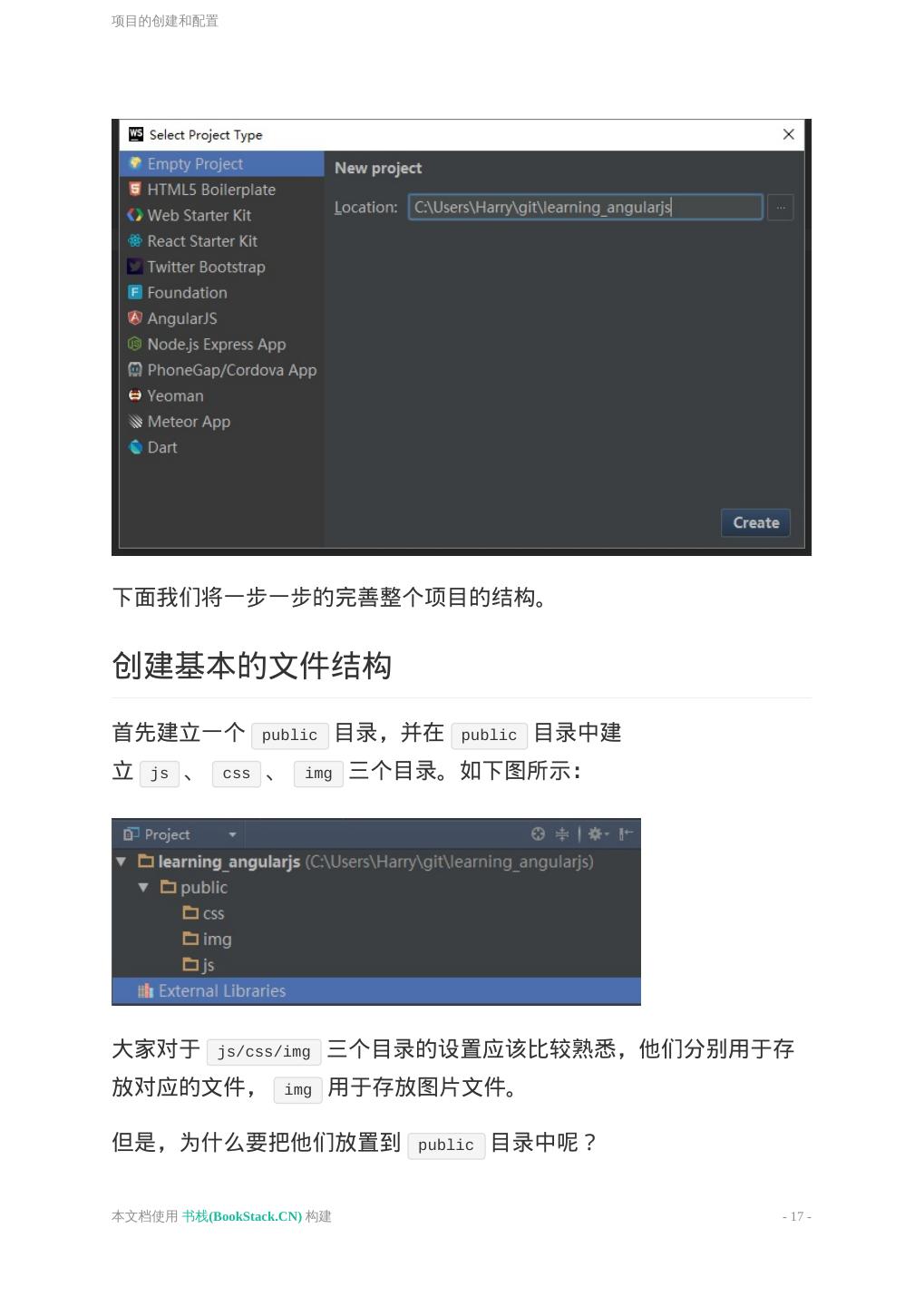 16 .项目的创建和配置 项目的创建和配置 项目的创建和配置 创建基本的文件结构 public 目录设置的意义 配置并初始化bower 打开命令行工具 初始化bower .bowerrc 配置文件 配置完成 项目的创建和配置 使用WebStorm可以直接创建AngularJS项目,且会自动帮助你配置好 项目并自动下载AngularJS等库。但是我们这里将创建一个新的空项 目(Empty Project),然后一步一步的将各个需要的内容填充进 来,这样我们会对使用AngularJS开发有一个更好的了解。 在WebStorm中,选择 File > New Project ,然后选择Empty Project,在右边的Location设置好项目的位置,然后点击界面右下 角的Create即可。 本文档使用 书栈(BookStack.CN) 构建 - 16 -