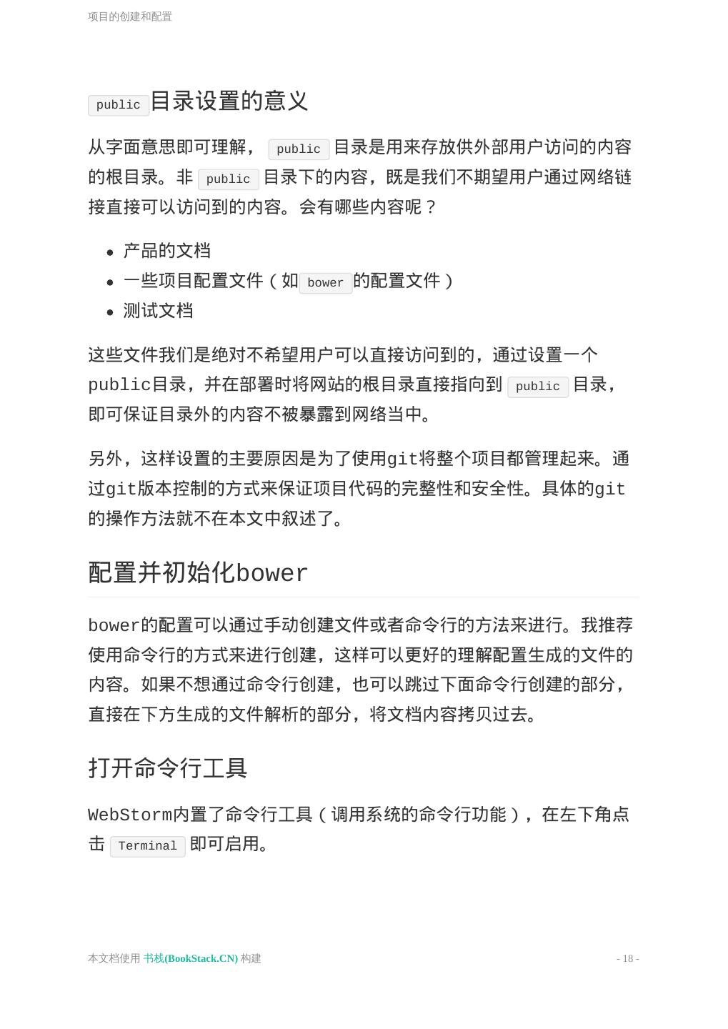 18 .项目的创建和配置 public 目录设置的意义 从字面意思即可理解, public 目录是用来存放供外部用户访问的内容 的根目录。非 public 目录下的内容,既是我们不期望用户通过网络链 接直接可以访问到的内容。会有哪些内容呢? 产品的文档 一些项目配置文件(如 bower 的配置文件) 测试文档 这些文件我们是绝对不希望用户可以直接访问到的,通过设置一个 public目录,并在部署时将网站的根目录直接指向到 public 目录, 即可保证目录外的内容不被暴露到网络当中。 另外,这样设置的主要原因是为了使用git将整个项目都管理起来。通 过git版本控制的方式来保证项目代码的完整性和安全性。具体的git 的操作方法就不在本文中叙述了。 配置并初始化bower bower的配置可以通过手动创建文件或者命令行的方法来进行。我推荐 使用命令行的方式来进行创建,这样可以更好的理解配置生成的文件的 内容。如果不想通过命令行创建,也可以跳过下面命令行创建的部分, 直接在下方生成的文件解析的部分,将文档内容拷贝过去。 打开命令行工具 WebStorm内置了命令行工具(调用系统的命令行功能),在左下角点 击 Terminal 即可启用。 本文档使用 书栈(BookStack.CN) 构建 - 18 -