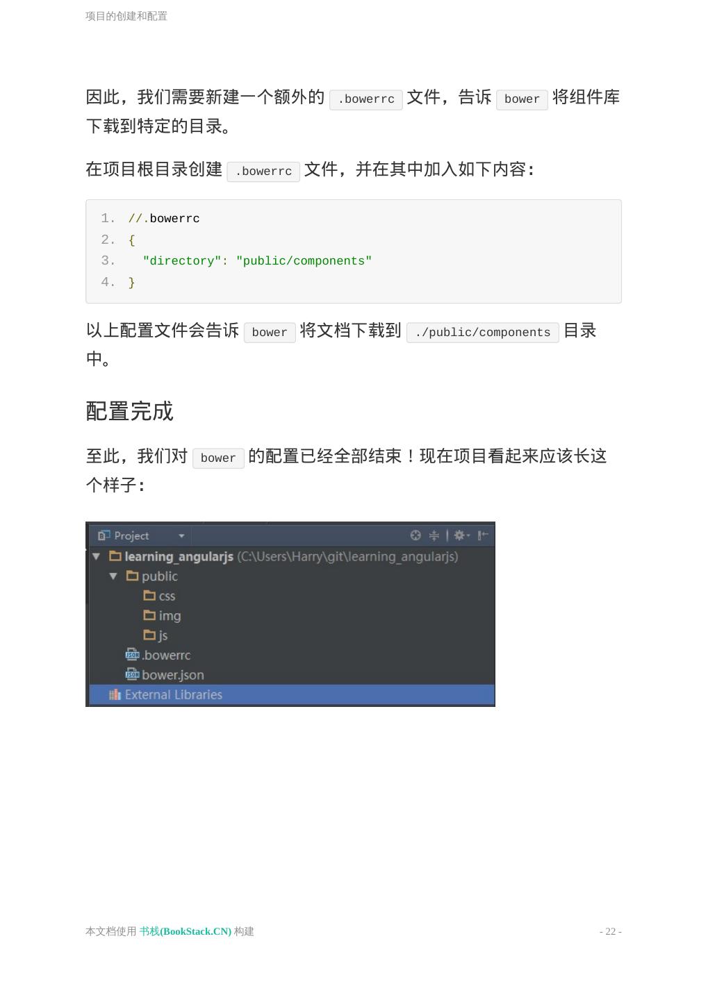 21 .项目的创建和配置 1. //bower.json 2. { 3. "name": "learning_angularjs", 4. "authors": [ 5. "Harry <harry@andtoo.net>" 6. ], 7. "description": "", 8. "main": "", 9. "moduleType": [ 10. ], 11. "license": "MIT", 12. "homepage": "", 13. "private": true, 14. "ignore": [ 15. "**/.*", 16. "node_modules", 17. "bower_components", 18. "test", 19. "tests" 20. ] 21. } 如果您不希望bower配置文件这么复杂,那么可以手工最简化的创 建 bower.json 。 1. //最简化bower.json 2. { 3. "name": "learning_angularjs" 4. } 只需要一个 name 字段即可让bower好好工作了。 .bowerrc 配置文件 由于我们建立了 public 目录,并且项目的根目录与网站根目录不同, 本文档使用 书栈(BookStack.CN) 构建 - 21 -