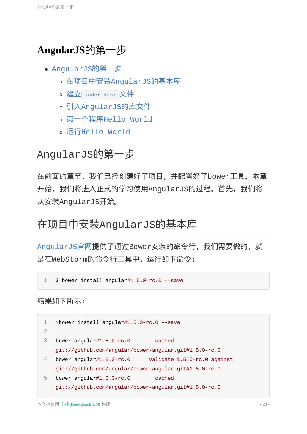 23 .AngularJS的第一步 AngularJS的第一步 AngularJS的第一步 在项目中安装AngularJS的基本库 建立 index.html 文件 引入AngularJS的库文件 第一个程序Hello World 运行Hello World AngularJS的第一步 在前面的章节,我们已经创建好了项目,并配置好了bower工具。本章 开始,我们将进入正式的学习使用AngularJS的过程。首先,我们将 从安装AngularJS开始。 在项目中安装AngularJS的基本库 AngularJS官网提供了通过Bower安装的命令行,我们需要做的,就 是在WebStorm的命令行工具中,运行如下命令: 1. $ bower install angular#1.5.0-rc.0 --save 结果如下所示: 1. >bower install angular#1.5.0-rc.0 --save 2. 3. bower angular#1.5.0-rc.0 cached git://github.com/angular/bower-angular.git#1.5.0-rc.0 4. bower angular#1.5.0-rc.0 validate 1.5.0-rc.0 against git://github.com/angular/bower-angular.git#1.5.0-rc.0 5. bower angular#1.5.0-rc.0 cached git://github.com/angular/bower-angular.git#1.5.0-rc.0 本文档使用 书栈(BookStack.CN) 构建 - 23 -