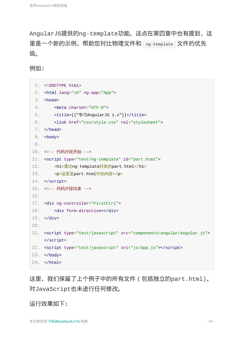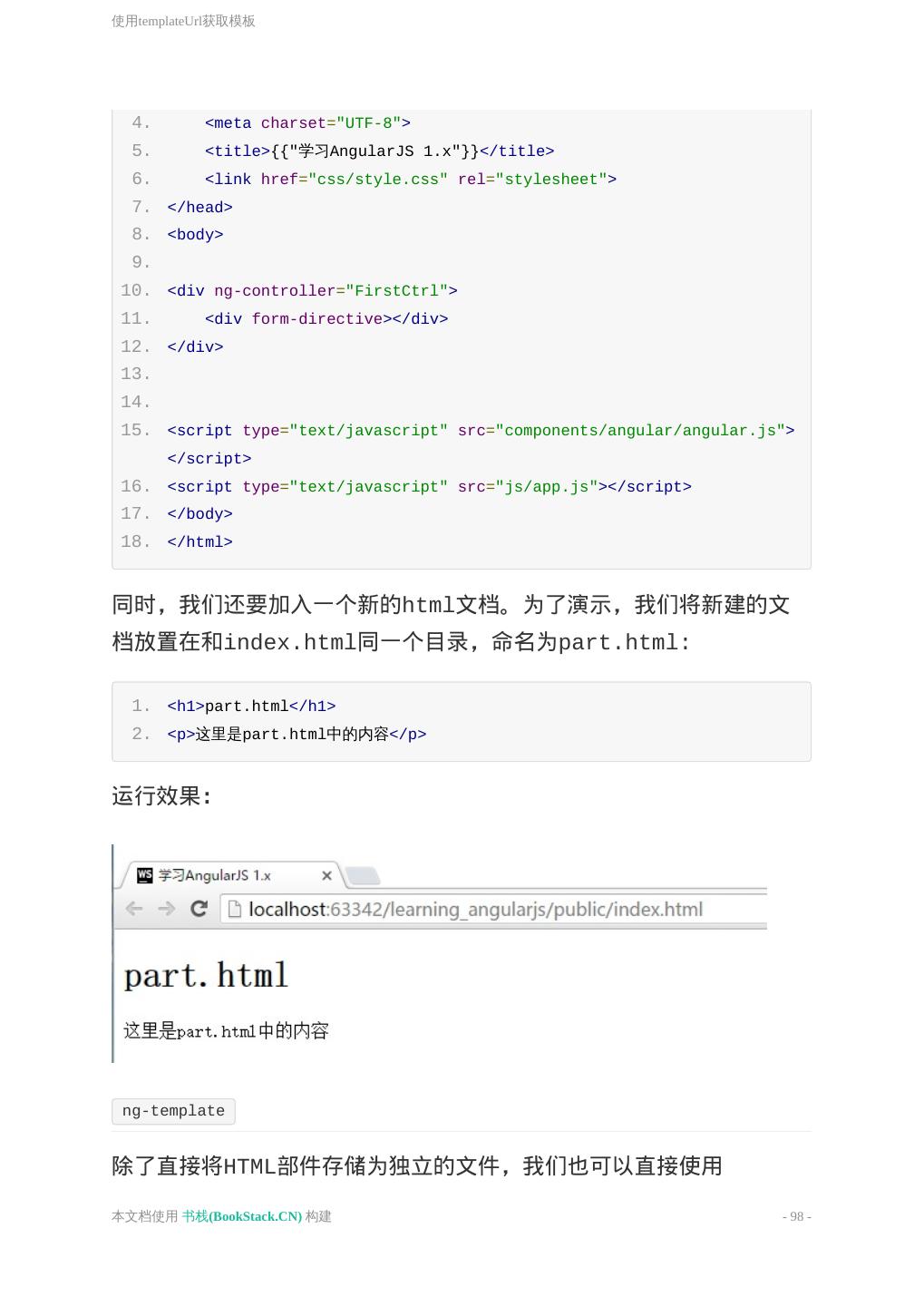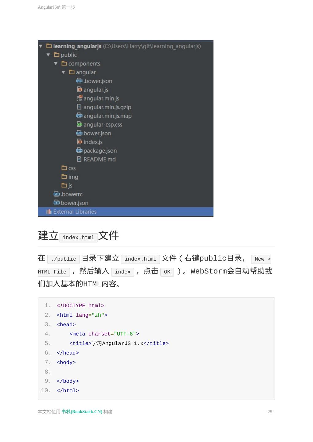 25 .AngularJS的第一步 建立 index.html 文件 在 ./public 目录下建立 index.html 文件(右键public目录, New > HTML File ,然后输入 index ,点击 OK )。WebStorm会自动帮助我 们加入基本的HTML内容。 1. <!DOCTYPE html> 2. <html lang="zh"> 3. <head> 4. <meta charset="UTF-8"> 5. <title>学习AngularJS 1.x</title> 6. </head> 7. <body> 8. 9. </body> 10. </html> 本文档使用 书栈(BookStack.CN) 构建 - 25 -