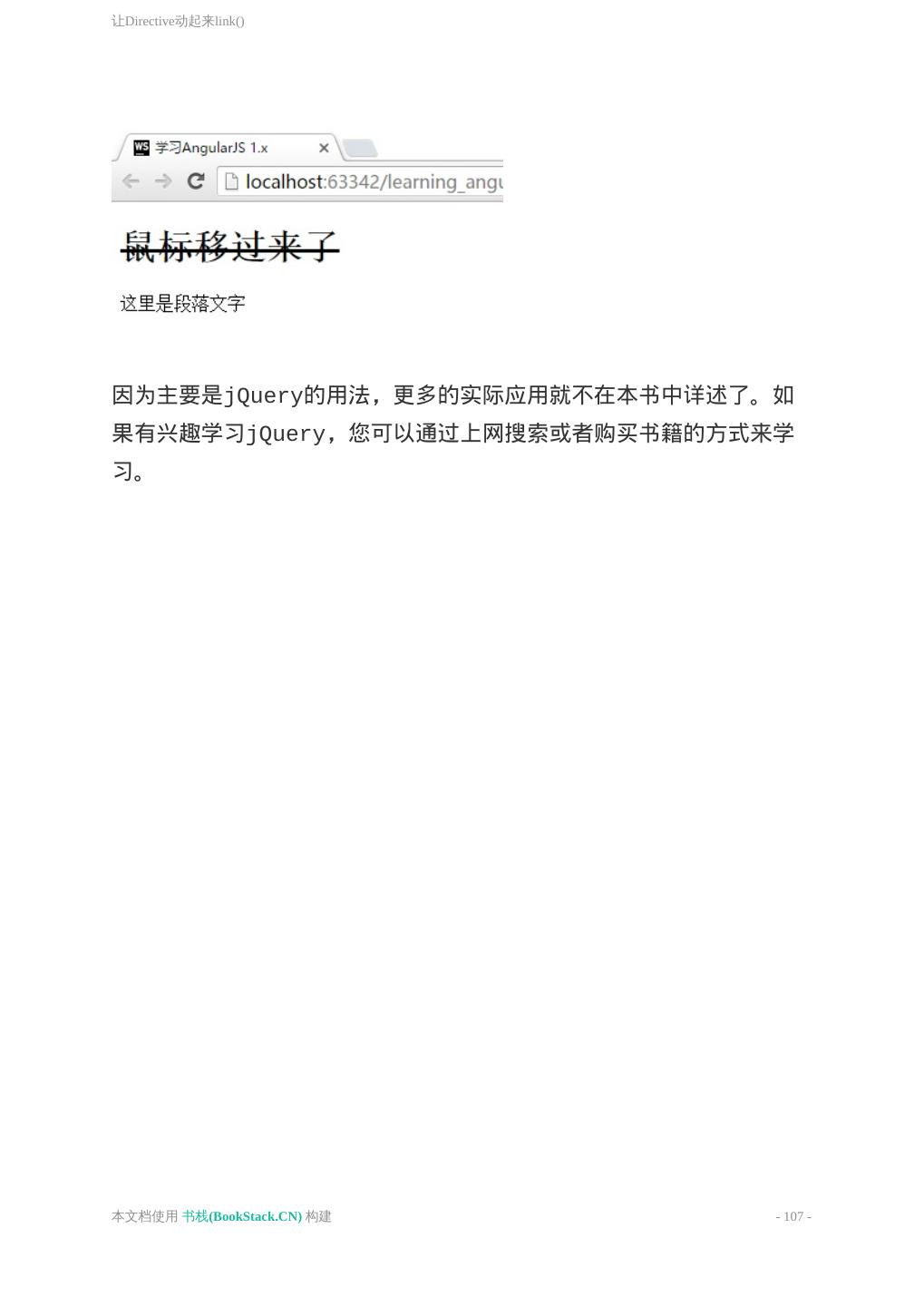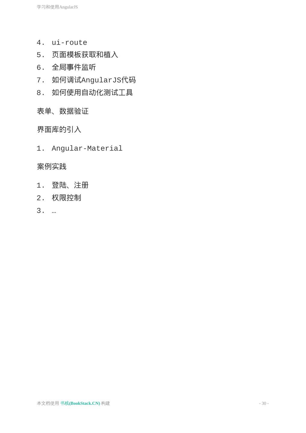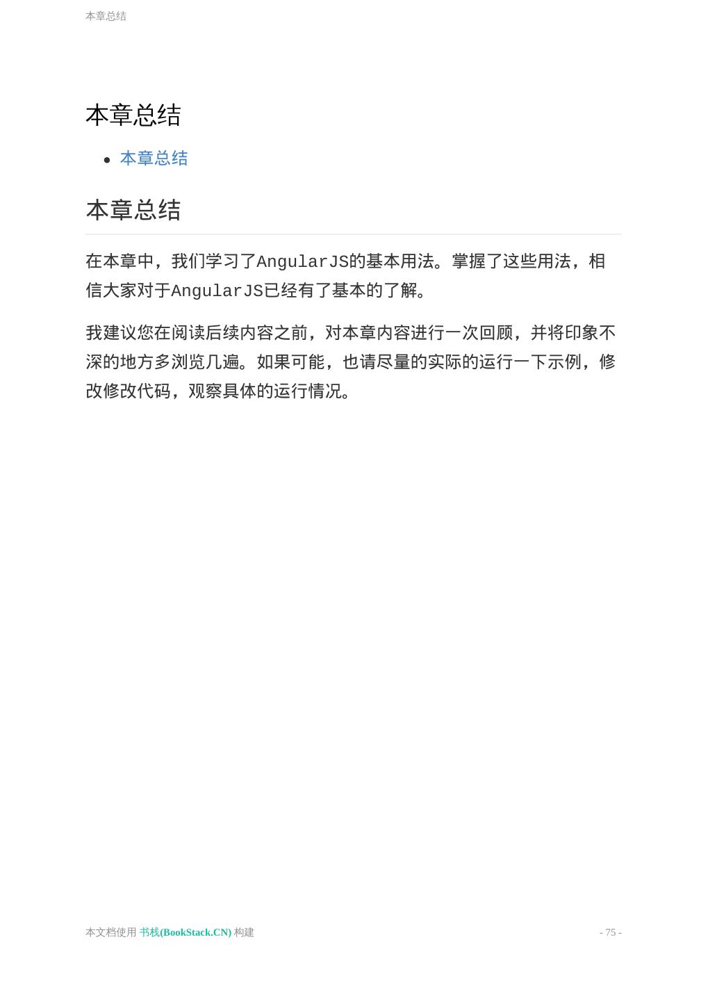 2 .致谢 致谢 当前文档 《学习AngularJS 1.x》 由 进击的皇虫 使用 书栈 (BookStack.CN) 进行构建,生成于 2018-04-18。 书栈(BookStack.CN) 仅提供文档编写、整理、归类等功能,以 及对文档内容的生成和导出工具。 文档内容由网友们编写和整理,书栈(BookStack.CN) 难以确认 文档内容知识点是否错漏。如果您在阅读文档获取知识的时候,发现文 档内容有不恰当的地方,请向我们反馈,让我们共同携手,将知识准 确、高效且有效地传递给每一个人。 同时,如果您在日常生活、工作和学习中遇到有价值有营养的知识 文档,欢迎分享到 书栈(BookStack.CN) ,为知识的传承献上您的 一份力量! 如果当前文档生成时间太久,请到 书栈(BookStack.CN) 获取 最新的文档,以跟上知识更新换代的步伐。 文档地 址:http://www.bookstack.cn/books/learning_angular 书栈官网:http://www.bookstack.cn 书栈开源:https://github.com/TruthHun 分享,让知识传承更久远! 感谢知识的创造者,感谢知识的分享 者,也感谢每一位阅读到此处的读者,因为我们都将成为知识的传承 者。 本文档使用 书栈(BookStack.CN) 构建 - 2 -