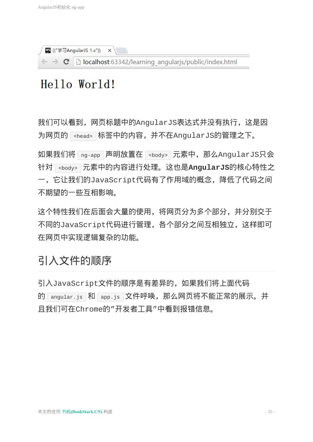 28 .AngularJS的第一步 运行效果如下图所示: 看不到 {{ 和 }} ,就说明AngularJS已经成功运行起来了! 如果AngularJS没有成功运行,那么您看到的应该是如下内容: 1. {{"Hello World!"}} 如果出现以上结果,请您按书的前面内容仔细检查您的代码。 Hello World到此结束,下面我们将进入AngularJS的世界,学习 它,理解它,使用它! 本文档使用 书栈(BookStack.CN) 构建 - 28 -
