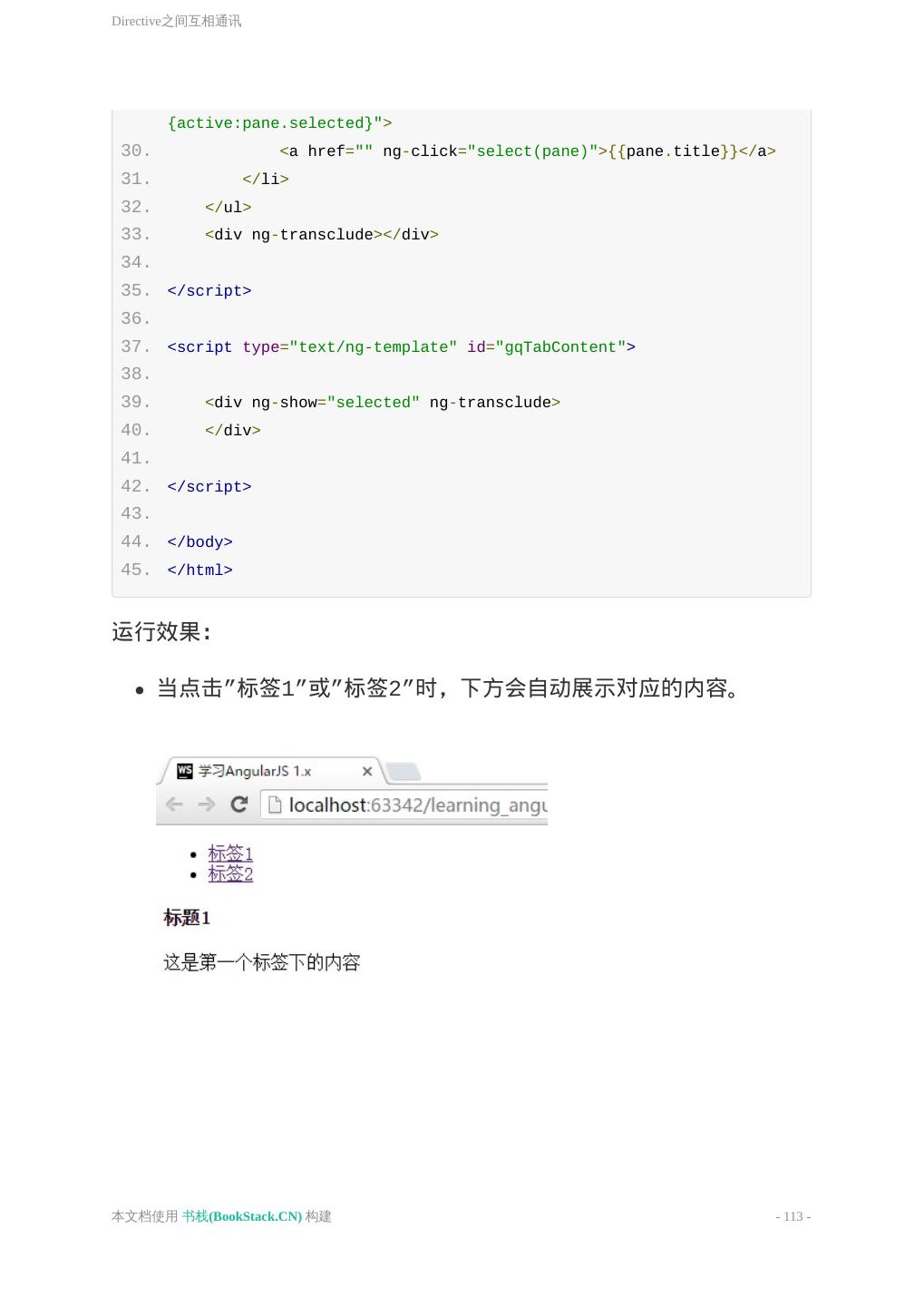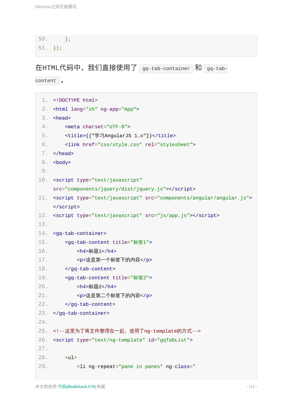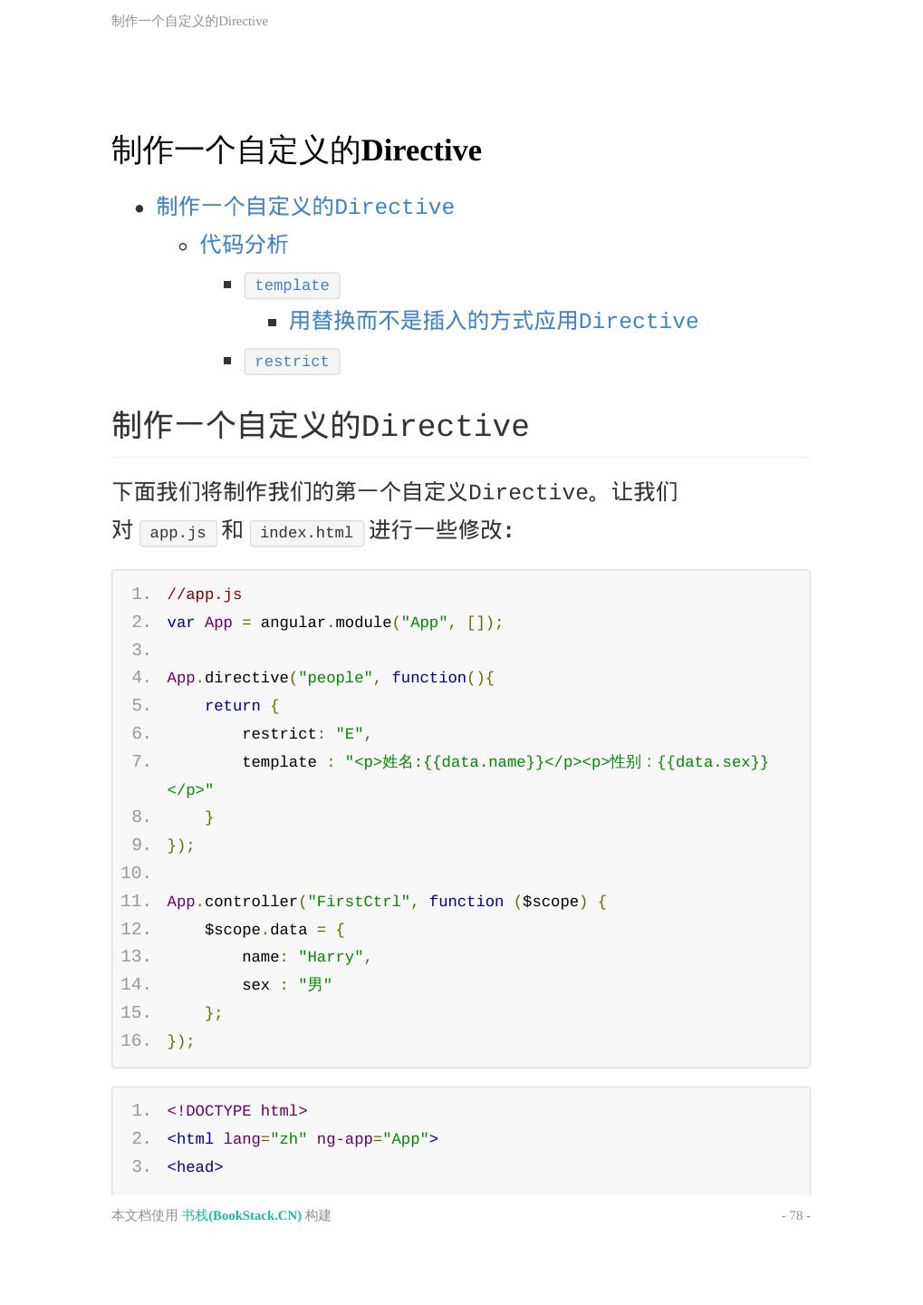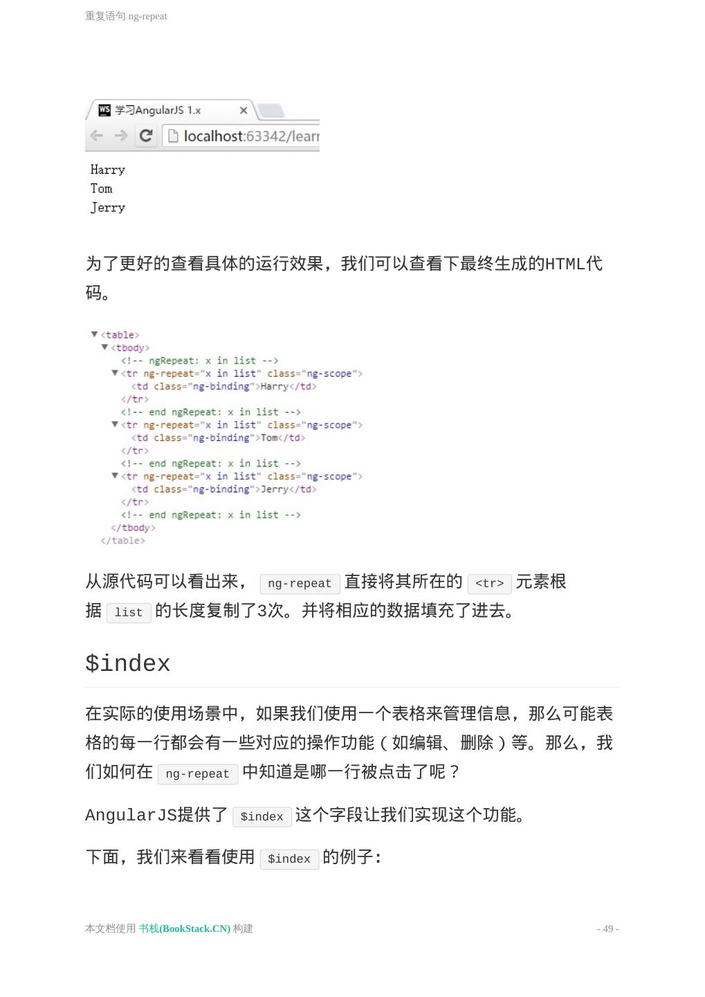 1 . 目 录 致谢 简介 环境的准备 项目的创建和配置 AngularJS的第一步 学习和使用AngularJS 基本表达式 AngularJS初始化 ng-app 控制器 ng-controller 数据绑定 data-binding 条件判断 ng-if / ng-show / ng-hide 重复语句 ng-repeat 过滤器 filter 样式选择器 ng-class/ng-style 下拉列表选项 ng-options 引入ng-include和模板ng-template 本章总结 深入学习AngularJS - Directive 制作一个自定义的Directive Directive的命名和使用规则 让Directive支持传入数据 使用templateUrl获取模板 让Directive动起来link() 把Directive变为一个容器transclude Directive之间互相通讯 本章总结 本文档使用 书栈(BookStack.CN) 构建 - 1 -