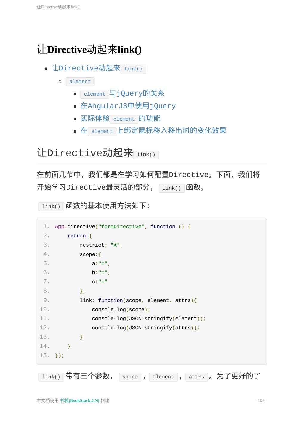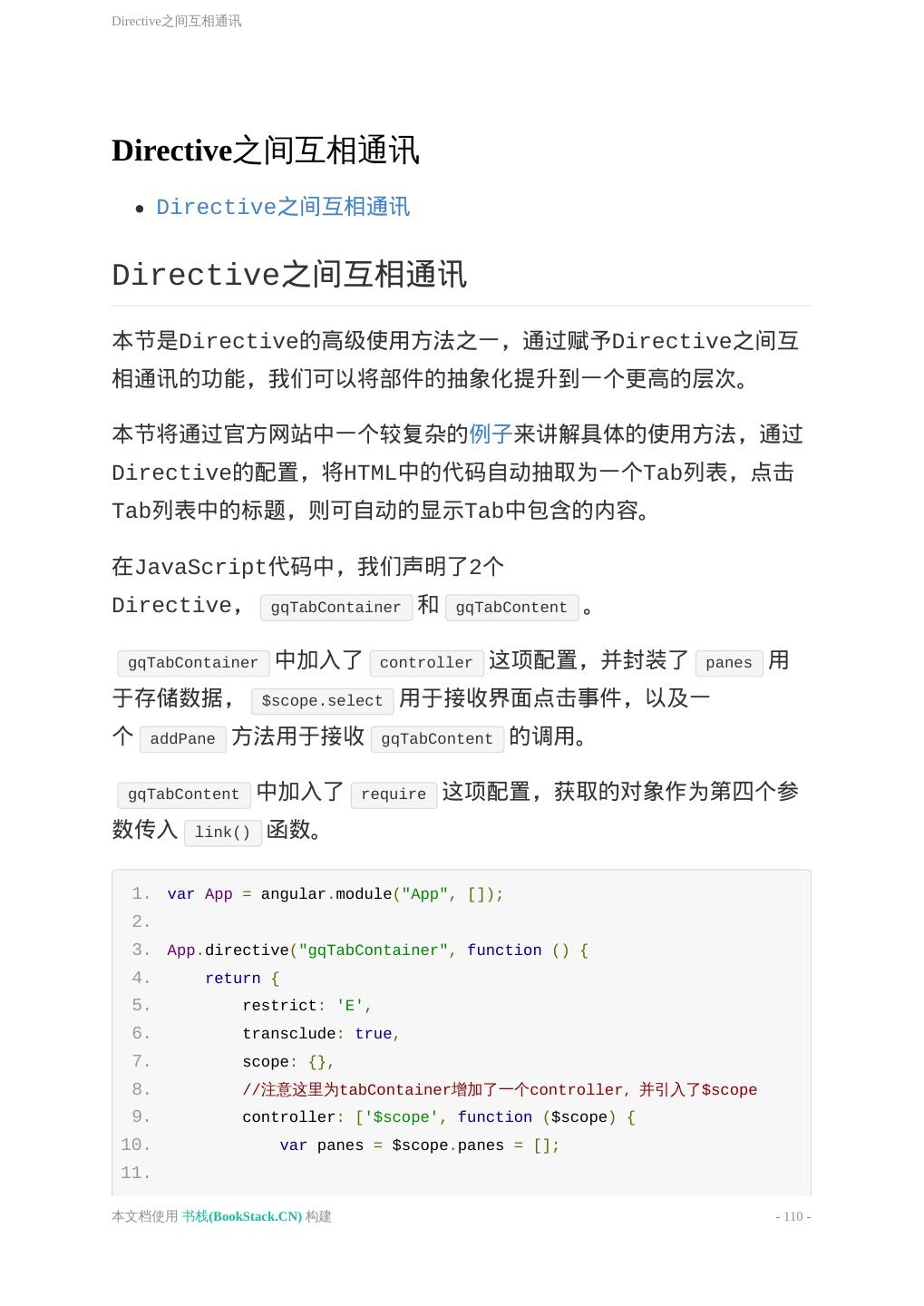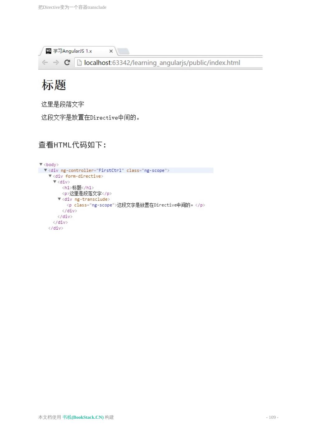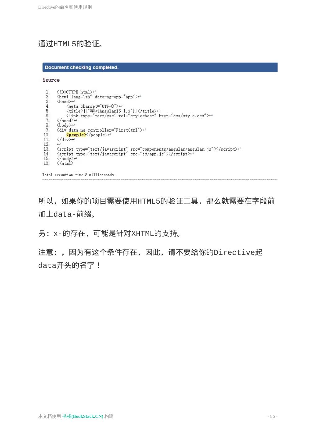 1 . 目 录 致谢 简介 环境的准备 项目的创建和配置 AngularJS的第一步 学习和使用AngularJS 基本表达式 AngularJS初始化 ng-app 控制器 ng-controller 数据绑定 data-binding 条件判断 ng-if / ng-show / ng-hide 重复语句 ng-repeat 过滤器 filter 样式选择器 ng-class/ng-style 下拉列表选项 ng-options 引入ng-include和模板ng-template 本章总结 深入学习AngularJS - Directive 制作一个自定义的Directive Directive的命名和使用规则 让Directive支持传入数据 使用templateUrl获取模板 让Directive动起来link() 把Directive变为一个容器transclude Directive之间互相通讯 本章总结 本文档使用 书栈(BookStack.CN) 构建 - 1 -