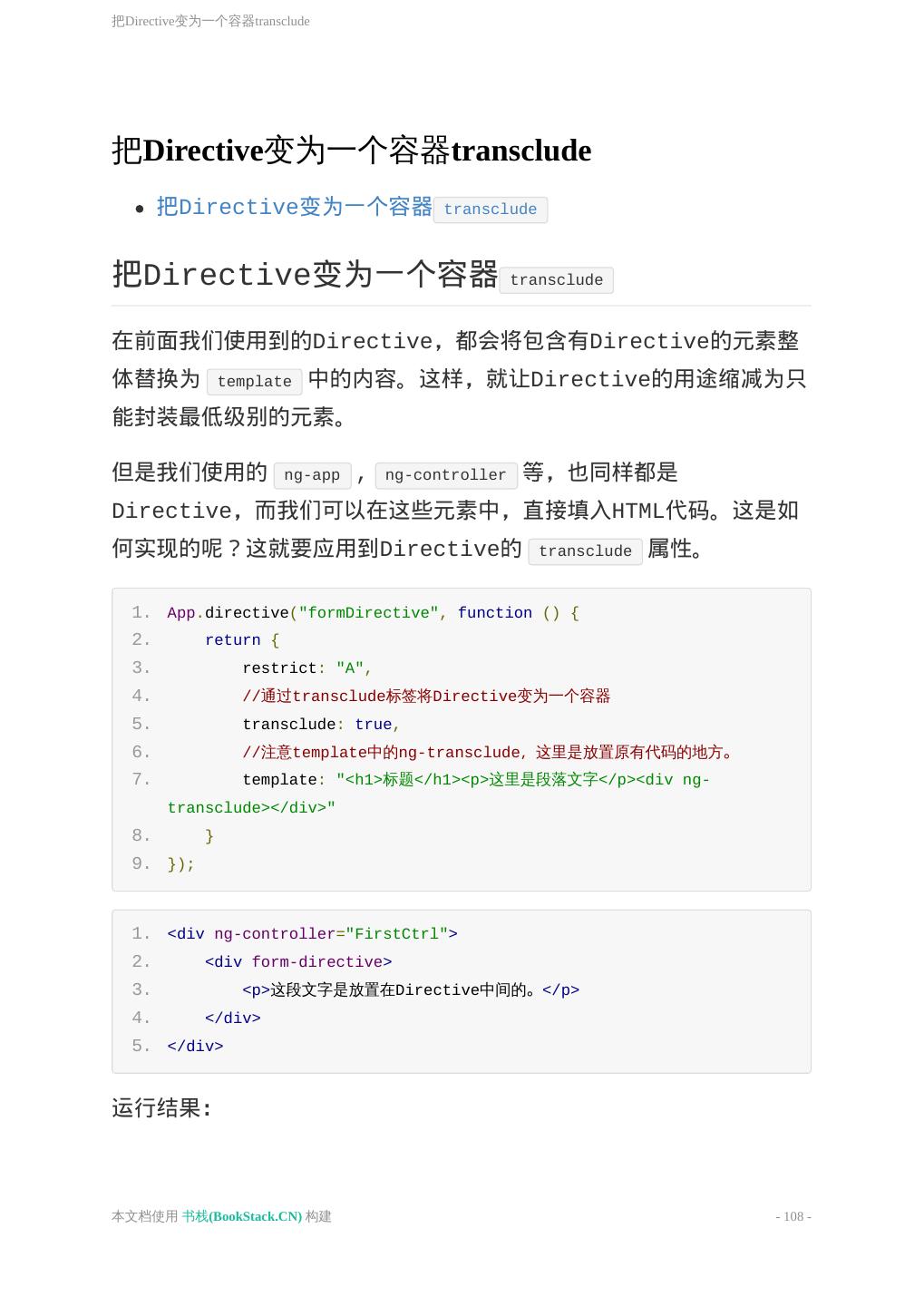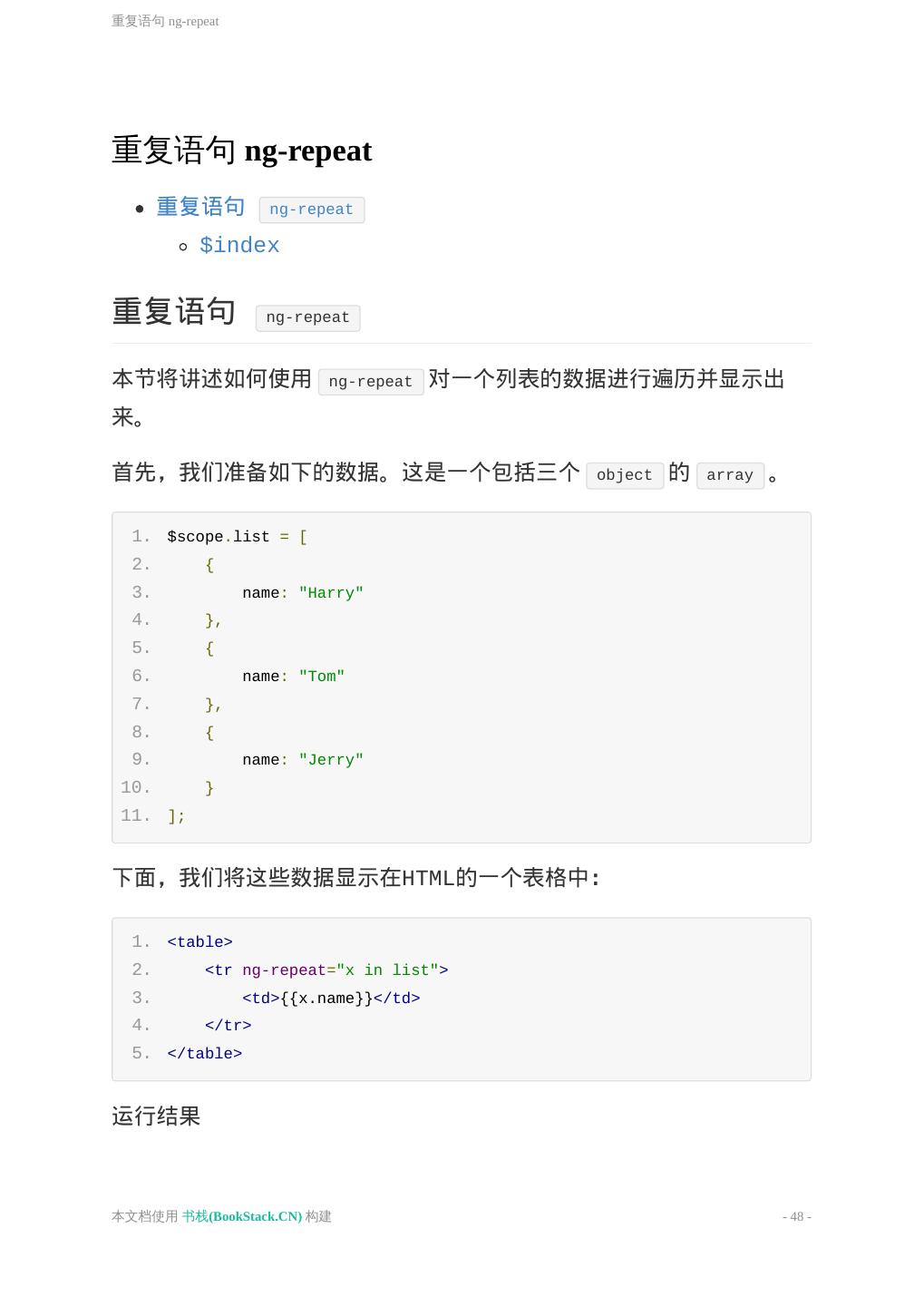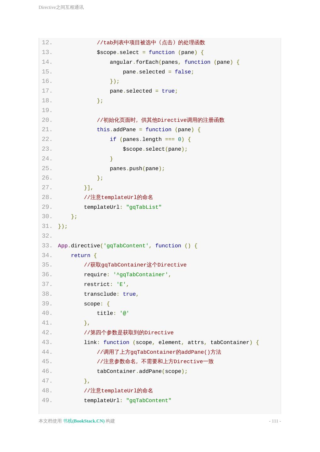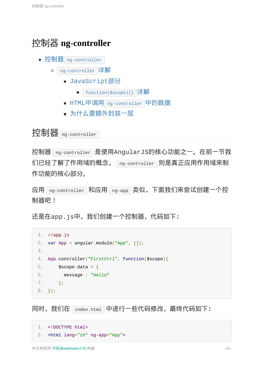 1 . 目 录 致谢 简介 环境的准备 项目的创建和配置 AngularJS的第一步 学习和使用AngularJS 基本表达式 AngularJS初始化 ng-app 控制器 ng-controller 数据绑定 data-binding 条件判断 ng-if / ng-show / ng-hide 重复语句 ng-repeat 过滤器 filter 样式选择器 ng-class/ng-style 下拉列表选项 ng-options 引入ng-include和模板ng-template 本章总结 深入学习AngularJS - Directive 制作一个自定义的Directive Directive的命名和使用规则 让Directive支持传入数据 使用templateUrl获取模板 让Directive动起来link() 把Directive变为一个容器transclude Directive之间互相通讯 本章总结 本文档使用 书栈(BookStack.CN) 构建 - 1 -