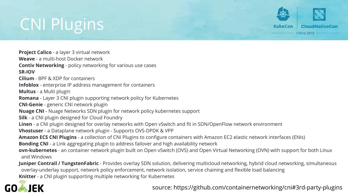 6 .CNI Plugins Project Calico - a layer 3 virtual network Weave - a multi-host Docker network Contiv Networking - policy networking for various use cases SR-IOV Cilium - BPF & XDP for containers Infoblox - enterprise IP address management for containers Multus - a Multi plugin Romana - Layer 3 CNI plugin supporting network policy for Kubernetes CNI-Genie - generic CNI network plugin Nuage CNI - Nuage Networks SDN plugin for network policy kubernetes support Silk - a CNI plugin designed for Cloud Foundry Linen - a CNI plugin designed for overlay networks with Open vSwitch and fit in SDN/OpenFlow network environment Vhostuser - a Dataplane network plugin - Supports OVS-DPDK & VPP Amazon ECS CNI Plugins - a collection of CNI Plugins to configure containers with Amazon EC2 elastic network interfaces (ENIs) Bonding CNI - a Link aggregating plugin to address failover and high availability network ovn-kubernetes - an container network plugin built on Open vSwitch (OVS) and Open Virtual Networking (OVN) with support for both Linux and Windows Juniper Contrail / TungstenFabric - Provides overlay SDN solution, delivering multicloud networking, hybrid cloud networking, simultaneous overlay-underlay support, network policy enforcement, network isolation, service chaining and flexible load balancing Knitter - a CNI plugin supporting multiple networking for Kubernetes source: https://github.com/containernetworking/cni#3rd-party-plugins