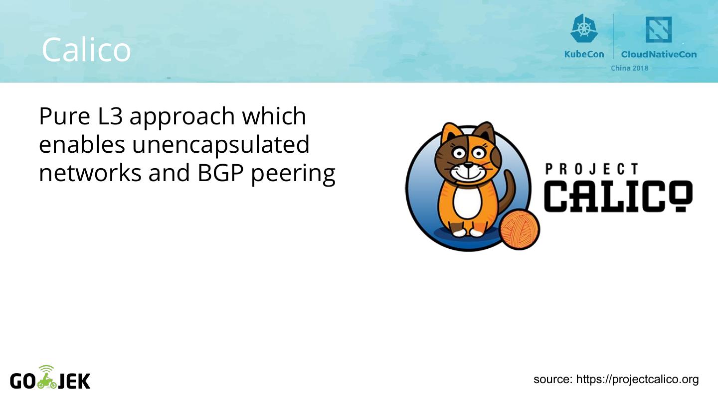9 .Calico Pure L3 approach which enables unencapsulated networks and BGP peering source: https://projectcalico.org