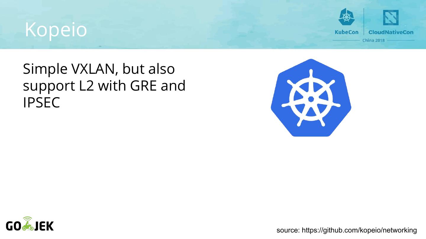 14 .Kopeio Simple VXLAN, but also support L2 with GRE and IPSEC source: https://github.com/kopeio/networking
