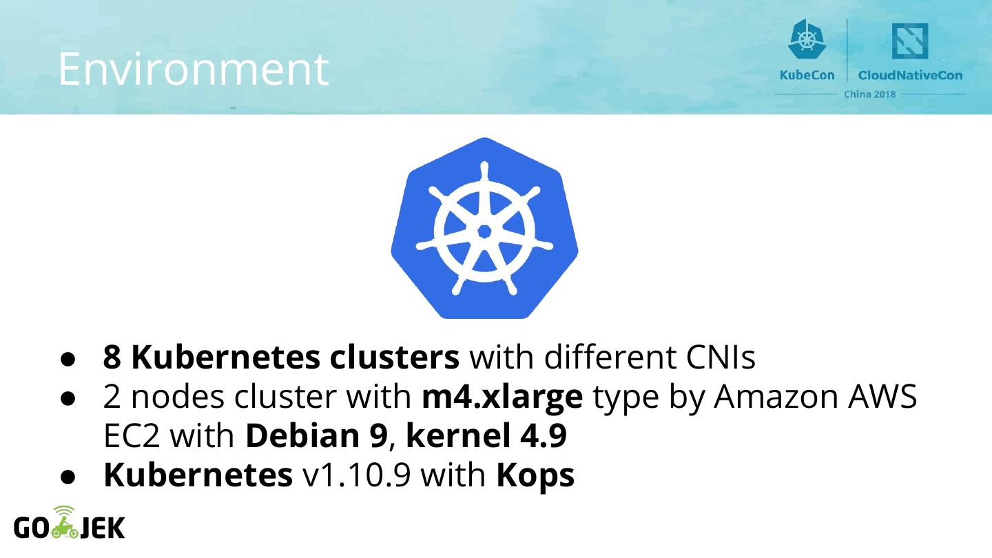 18 .Environment ● 8 Kubernetes clusters with different CNIs ● 2 nodes cluster with m4.xlarge type by Amazon AWS EC2 with Debian 9, kernel 4.9 ● Kubernetes v1.10.9 with Kops