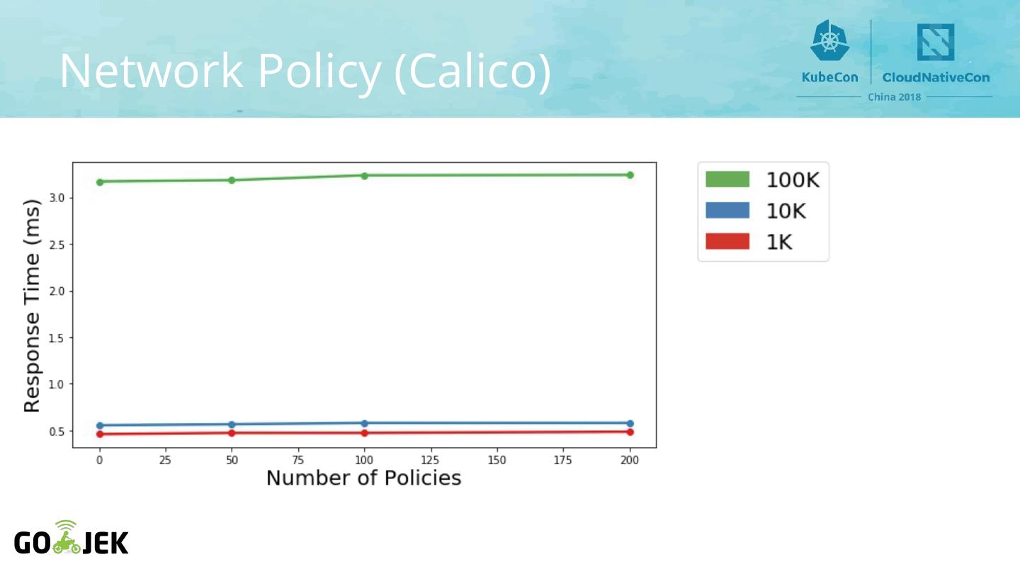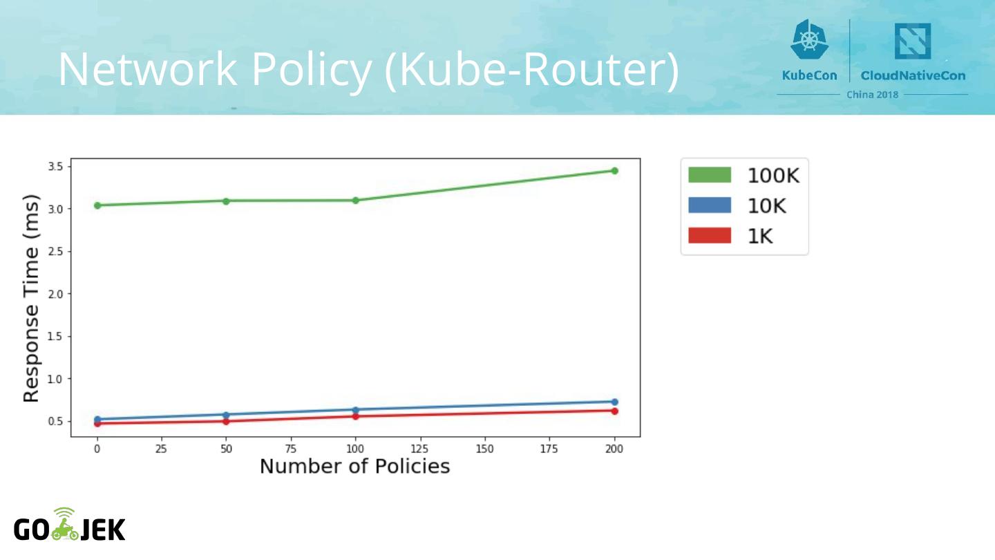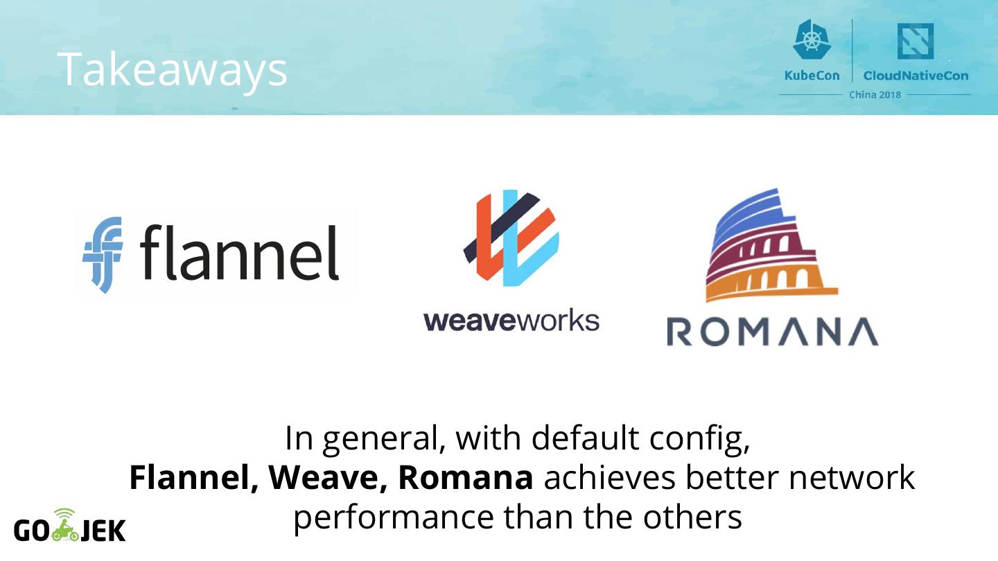 19 .Environment ● All CNI plugins deployed with default config in Kops ○ No tuning or custom configuration ○ Flannel v0.10.0 ○ Kube-Router v0.1.0 ○ Calico v2.6.7 ○ AWS CNI v1.0.0 ○ Weave v2.4.0 ○ Kopeio v1.0.20180319 ○ Cilium v1.0 ○ Romana v2.0.2