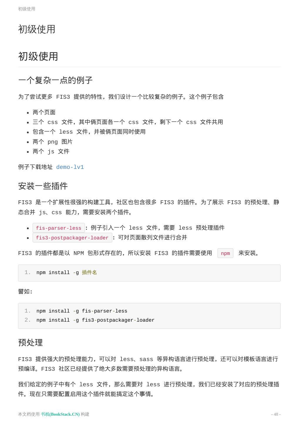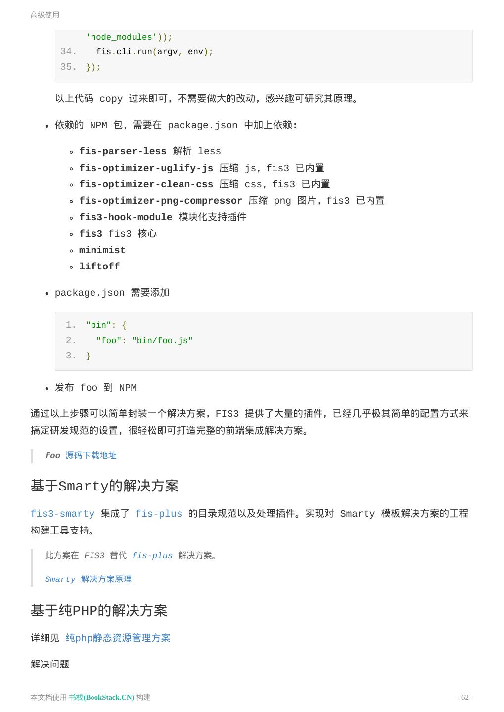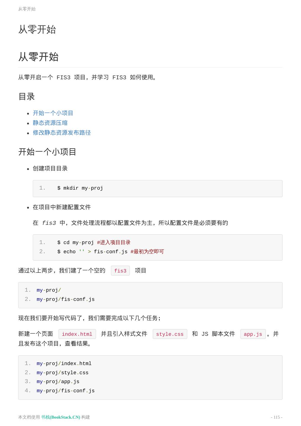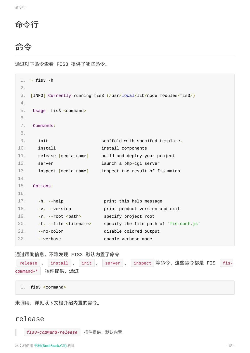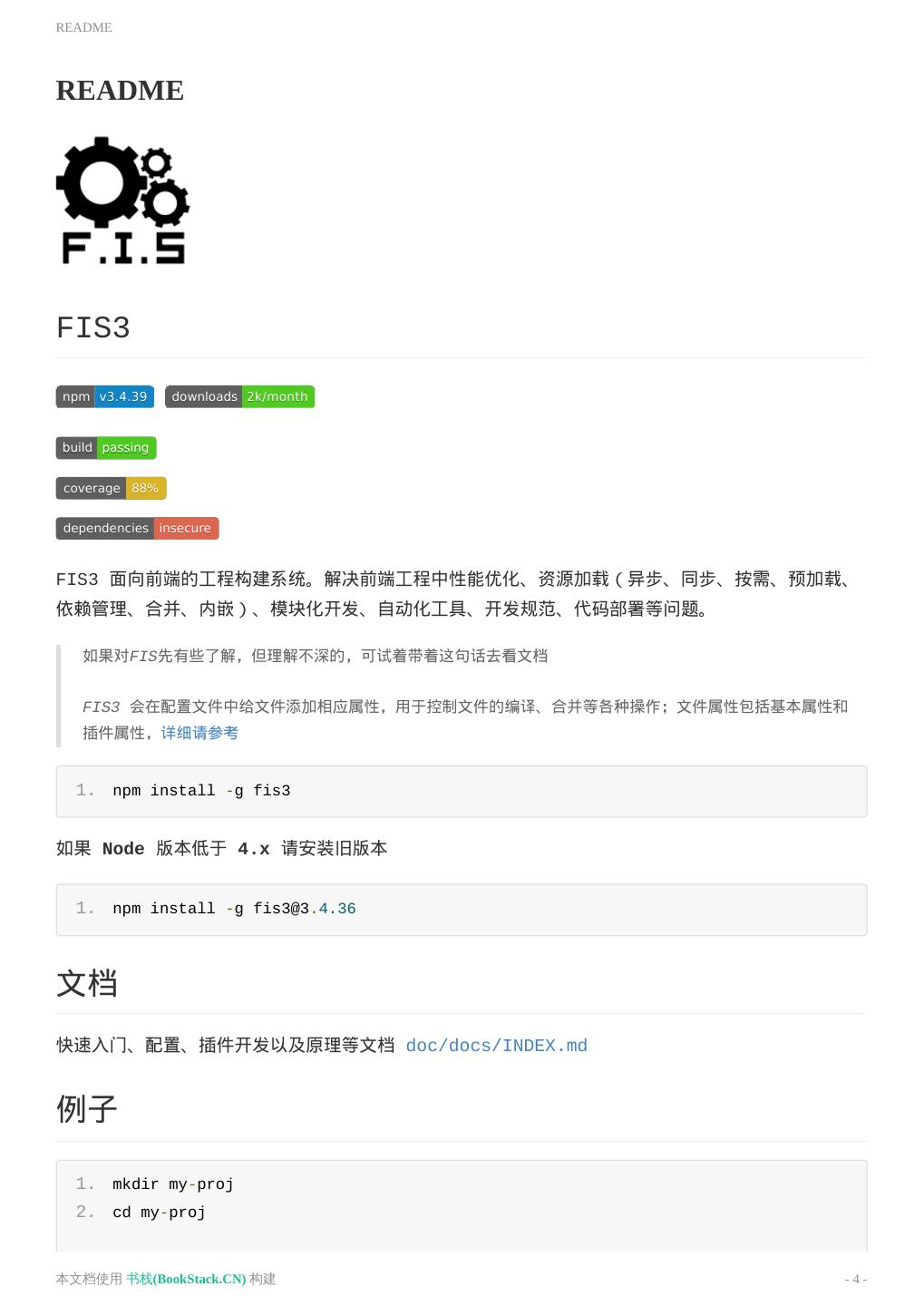 4 .README README FIS3 npm v3.4.39 downloads 2k/month build passing coverage 88% dependencies insecure FIS3 面向前端的工程构建系统。解决前端工程中性能优化、资源加载(异步、同步、按需、预加载、 依赖管理、合并、内嵌)、模块化开发、自动化工具、开发规范、代码部署等问题。 如果对FIS先有些了解,但理解不深的,可试着带着这句话去看文档 FIS3 会在配置文件中给文件添加相应属性,用于控制文件的编译、合并等各种操作;文件属性包括基本属性和 插件属性,详细请参考 1. npm install -g fis3 如果 Node 版本低于 4.x 请安装旧版本 1. npm install -g fis3@3.4.36 文档 快速入门、配置、插件开发以及原理等文档 doc/docs/INDEX.md 例子 1. mkdir my-proj 2. cd my-proj 本文档使用 书栈(BookStack.CN) 构建 - 4 -