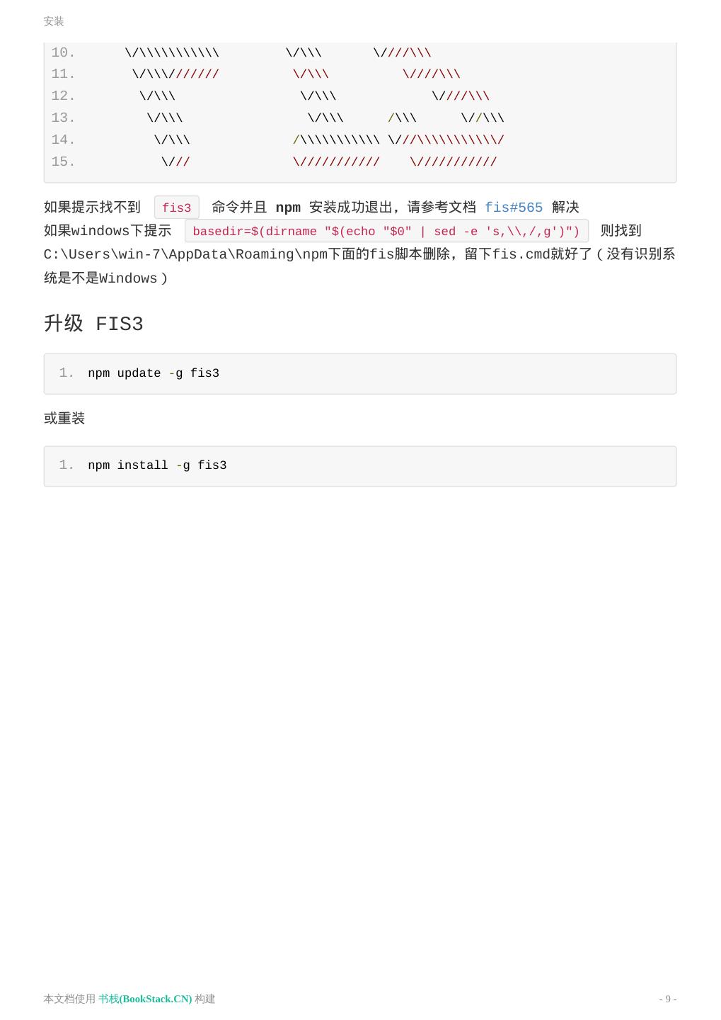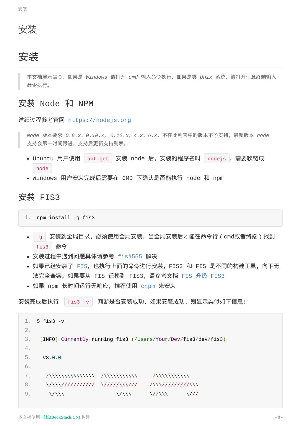 9 .安装 10. \/\\\\\\\\\\\ \/\\\ \////\\\ 11. \/\\\/////// \/\\\ \////\\\ 12. \/\\\ \/\\\ \////\\\ 13. \/\\\ \/\\\ /\\\ \//\\\ 14. \/\\\ /\\\\\\\\\\\ \///\\\\\\\\\\\/ 15. \/// \/////////// \/////////// 如果提示找不到 fis3 命令并且 npm 安装成功退出,请参考文档 fis#565 解决 如果windows下提示 basedir=$(dirname "$(echo "$0" | sed -e 's,\\,/,g')") 则找到 C:\Users\win-7\AppData\Roaming\npm下面的fis脚本删除,留下fis.cmd就好了(没有识别系 统是不是Windows) 升级 FIS3 1. npm update -g fis3 或重装 1. npm install -g fis3 本文档使用 书栈(BookStack.CN) 构建 - 9 -