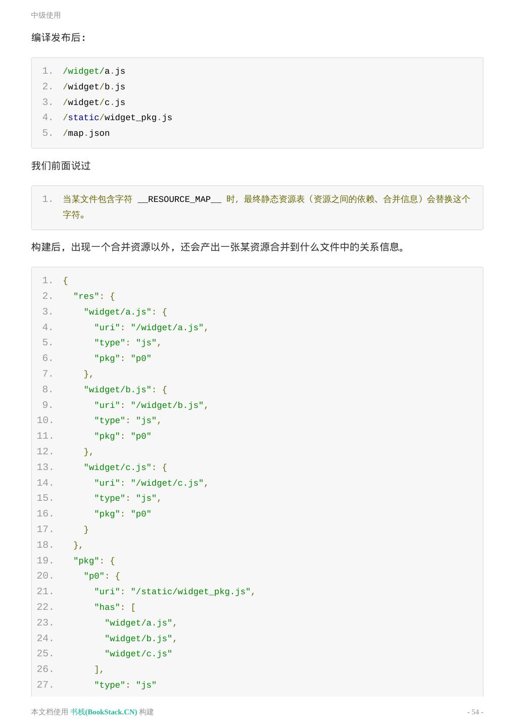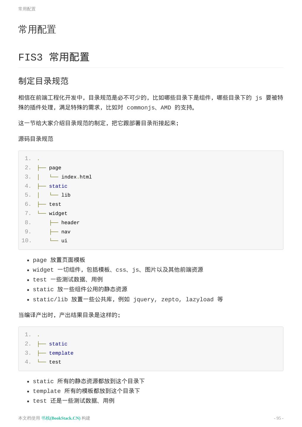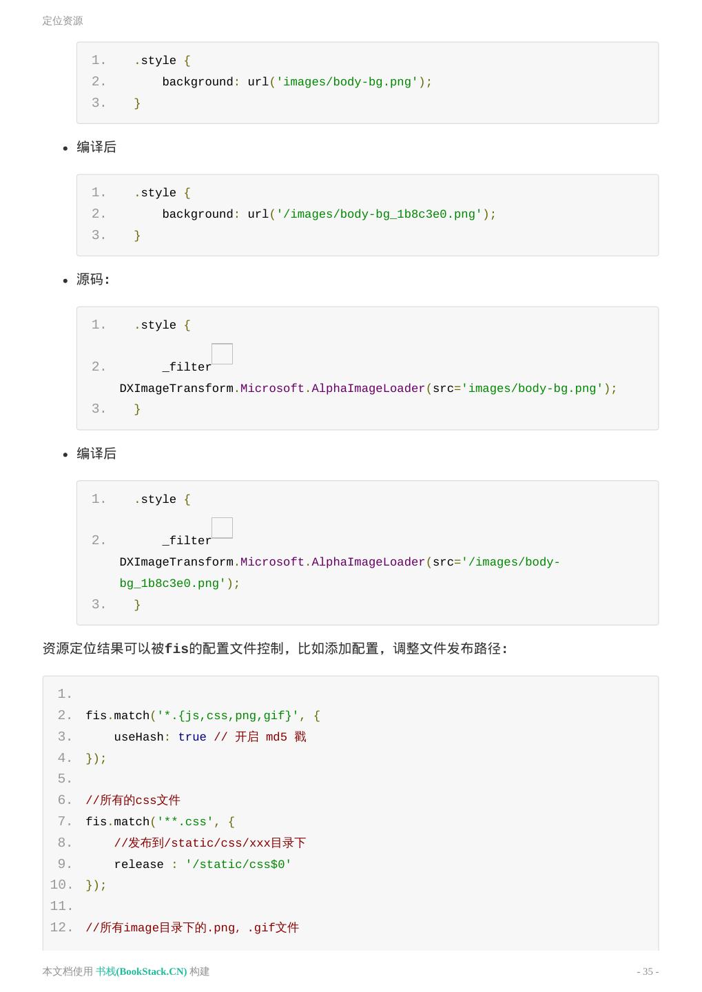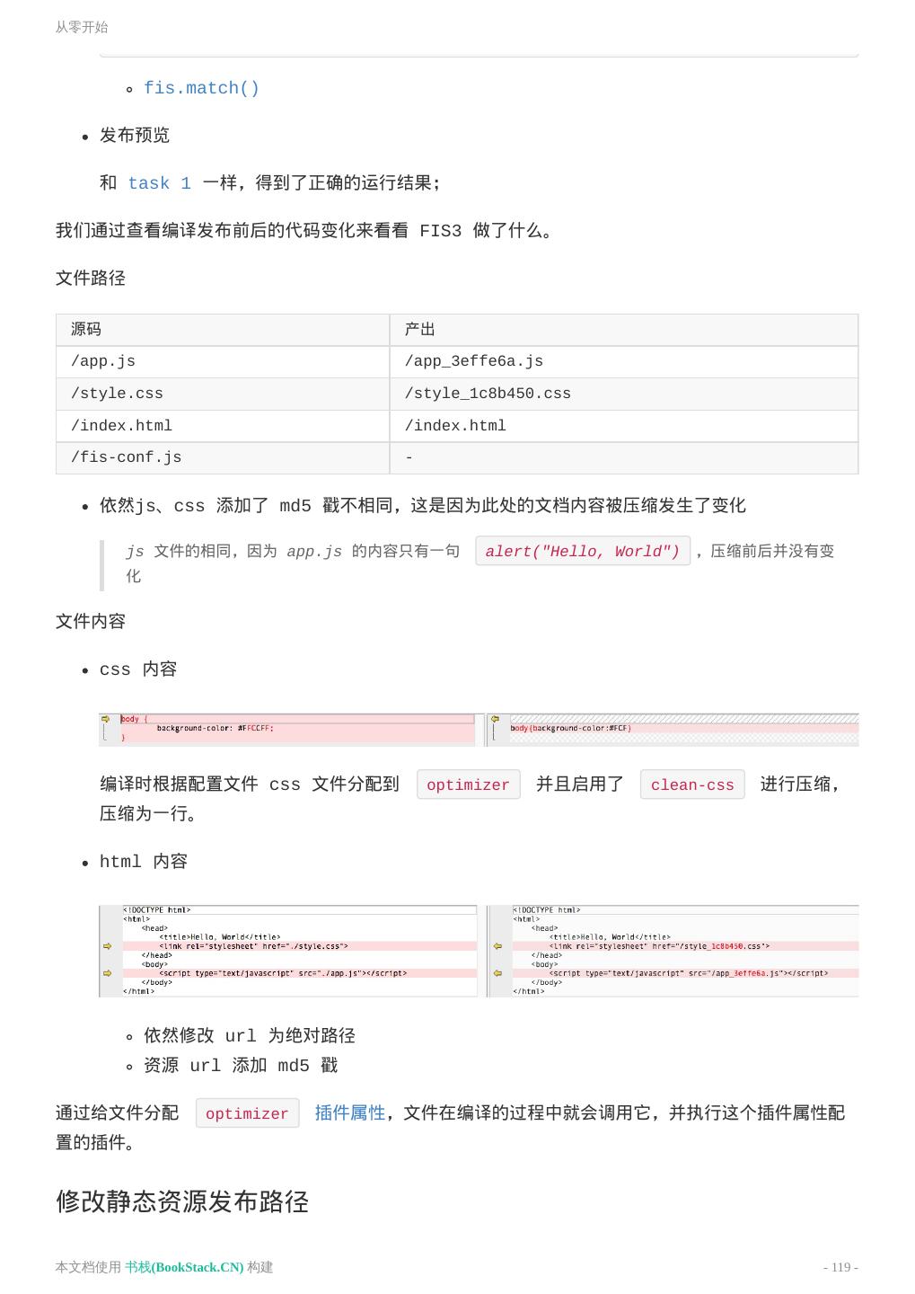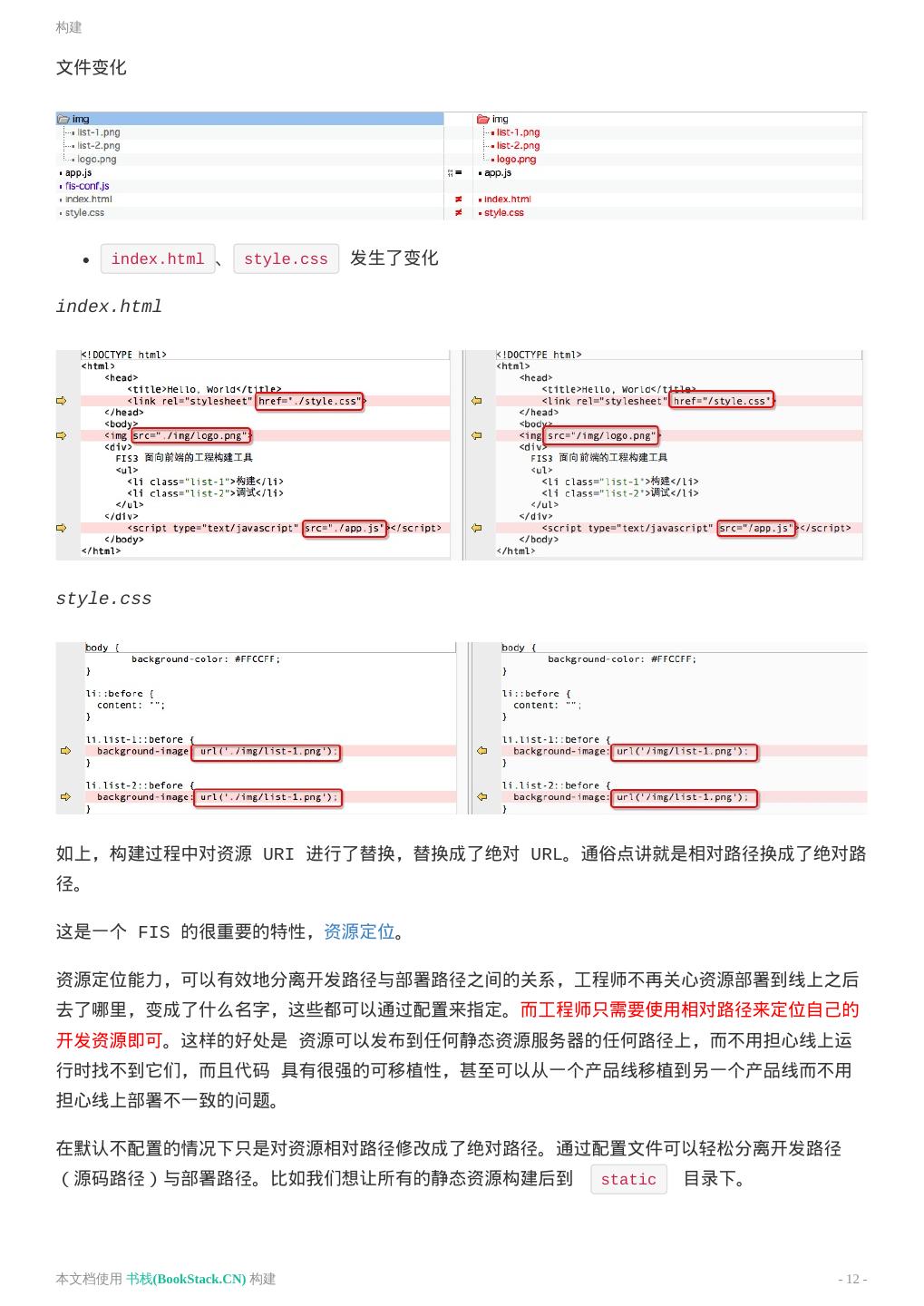 12 .构建 文件变化 index.html 、 style.css 发生了变化 index.html style.css 如上,构建过程中对资源 URI 进行了替换,替换成了绝对 URL。通俗点讲就是相对路径换成了绝对路 径。 这是一个 FIS 的很重要的特性,资源定位。 资源定位能力,可以有效地分离开发路径与部署路径之间的关系,工程师不再关心资源部署到线上之后 去了哪里,变成了什么名字,这些都可以通过配置来指定。而工程师只需要使用相对路径来定位自己的 开发资源即可。这样的好处是 资源可以发布到任何静态资源服务器的任何路径上,而不用担心线上运 行时找不到它们,而且代码 具有很强的可移植性,甚至可以从一个产品线移植到另一个产品线而不用 担心线上部署不一致的问题。 在默认不配置的情况下只是对资源相对路径修改成了绝对路径。通过配置文件可以轻松分离开发路径 (源码路径)与部署路径。比如我们想让所有的静态资源构建后到 static 目录下。 本文档使用 书栈(BookStack.CN) 构建 - 12 -