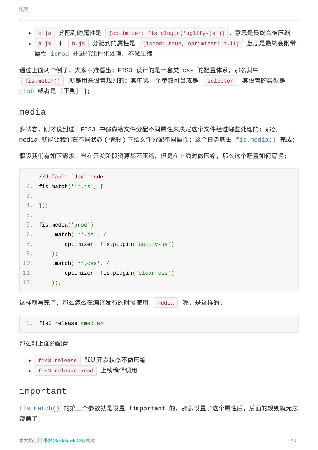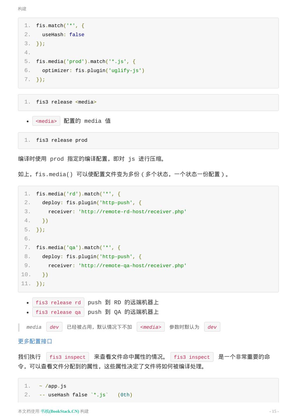 15 .构建 1. fis.match('*', { 2. useHash: false 3. }); 4. 5. fis.media('prod').match('*.js', { 6. optimizer: fis.plugin('uglify-js') 7. }); 1. fis3 release <media> <media> 配置的 media 值 1. fis3 release prod 编译时使用 prod 指定的编译配置,即对 js 进行压缩。 如上,fis.media() 可以使配置文件变为多份(多个状态,一个状态一份配置)。 1. fis.media('rd').match('*', { 2. deploy: fis.plugin('http-push', { 3. receiver: 'http://remote-rd-host/receiver.php' 4. }) 5. }); 6. 7. fis.media('qa').match('*', { 8. deploy: fis.plugin('http-push', { 9. receiver: 'http://remote-qa-host/receiver.php' 10. }) 11. }); fis3 release rd push 到 RD 的远端机器上 fis3 release qa push 到 QA 的远端机器上 media dev 已经被占用,默认情况下不加 <media> 参数时默认为 dev 更多配置接口 我们执行 fis3 inspect 来查看文件命中属性的情况。 fis3 inspect 是一个非常重要的命 令,可以查看文件分配到的属性,这些属性决定了文件将如何被编译处理。 1. ~ /app.js 2. -- useHash false `*.js` (0th) 本文档使用 书栈(BookStack.CN) 构建 - 15 -