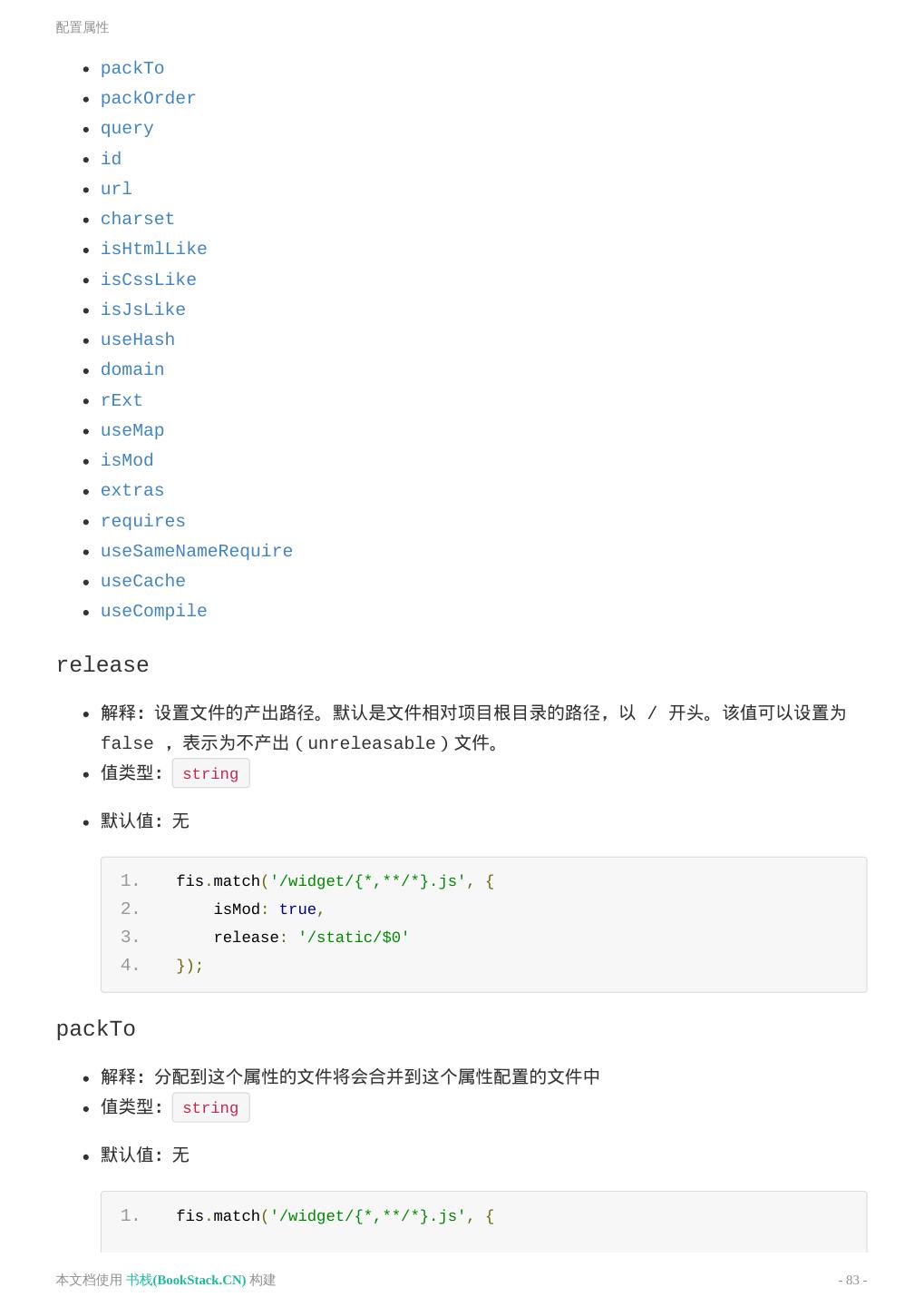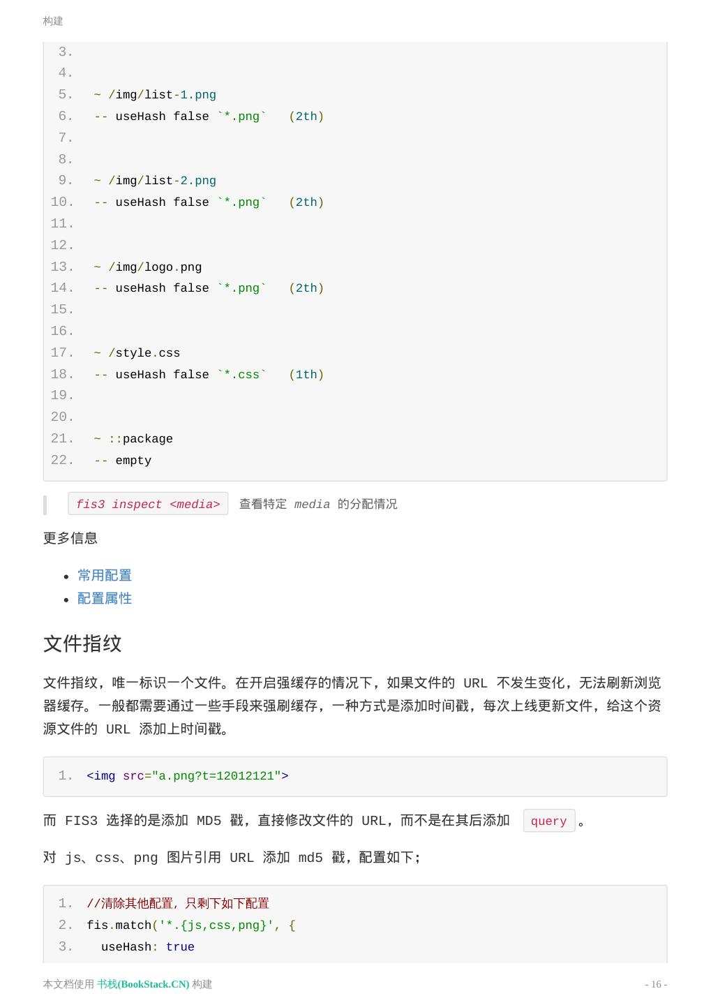 16 .构建 3. 4. 5. ~ /img/list-1.png 6. -- useHash false `*.png` (2th) 7. 8. 9. ~ /img/list-2.png 10. -- useHash false `*.png` (2th) 11. 12. 13. ~ /img/logo.png 14. -- useHash false `*.png` (2th) 15. 16. 17. ~ /style.css 18. -- useHash false `*.css` (1th) 19. 20. 21. ~ ::package 22. -- empty fis3 inspect <media> 查看特定 media 的分配情况 更多信息 常用配置 配置属性 文件指纹 文件指纹,唯一标识一个文件。在开启强缓存的情况下,如果文件的 URL 不发生变化,无法刷新浏览 器缓存。一般都需要通过一些手段来强刷缓存,一种方式是添加时间戳,每次上线更新文件,给这个资 源文件的 URL 添加上时间戳。 1. <img src="a.png?t=12012121"> 而 FIS3 选择的是添加 MD5 戳,直接修改文件的 URL,而不是在其后添加 query 。 对 js、css、png 图片引用 URL 添加 md5 戳,配置如下; 1. //清除其他配置,只剩下如下配置 2. fis.match('*.{js,css,png}', { 3. useHash: true 本文档使用 书栈(BookStack.CN) 构建 - 16 -