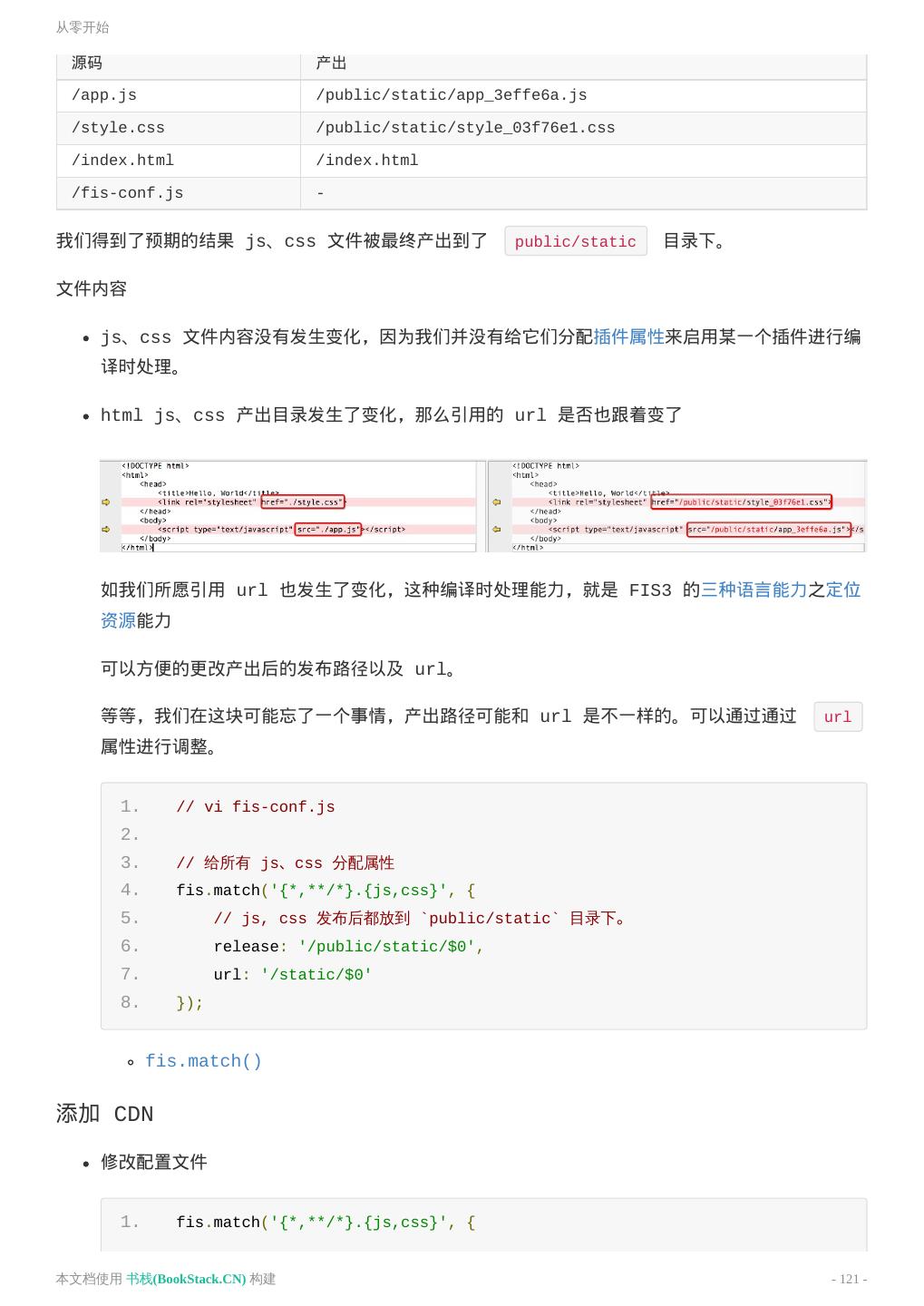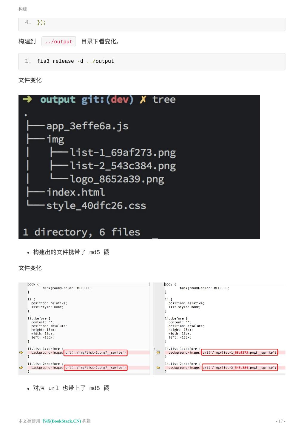 17 .构建 4. }); 构建到 ../output 目录下看变化。 1. fis3 release -d ../output 文件变化 构建出的文件携带了 md5 戳 文件变化 对应 url 也带上了 md5 戳 本文档使用 书栈(BookStack.CN) 构建 - 17 -