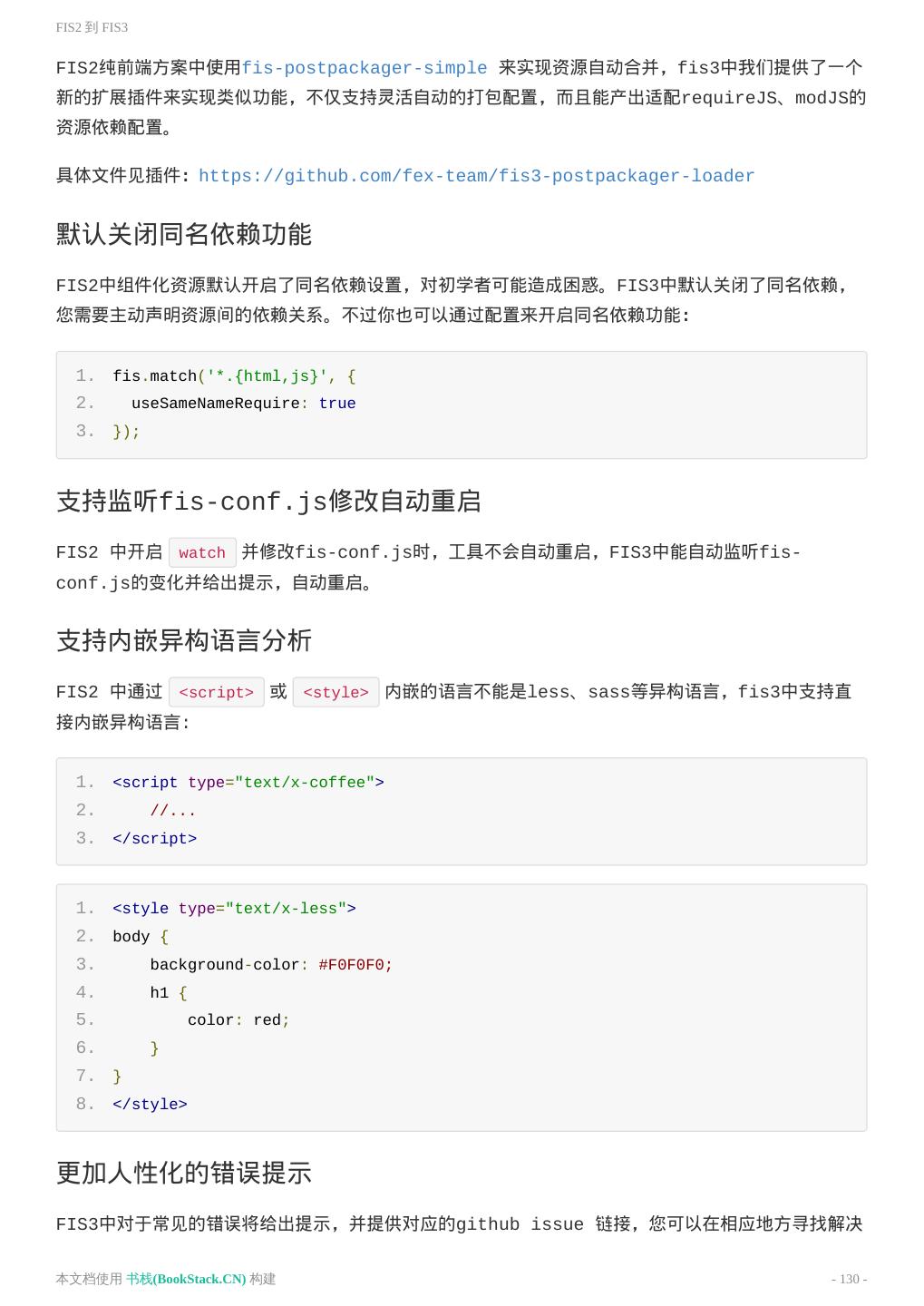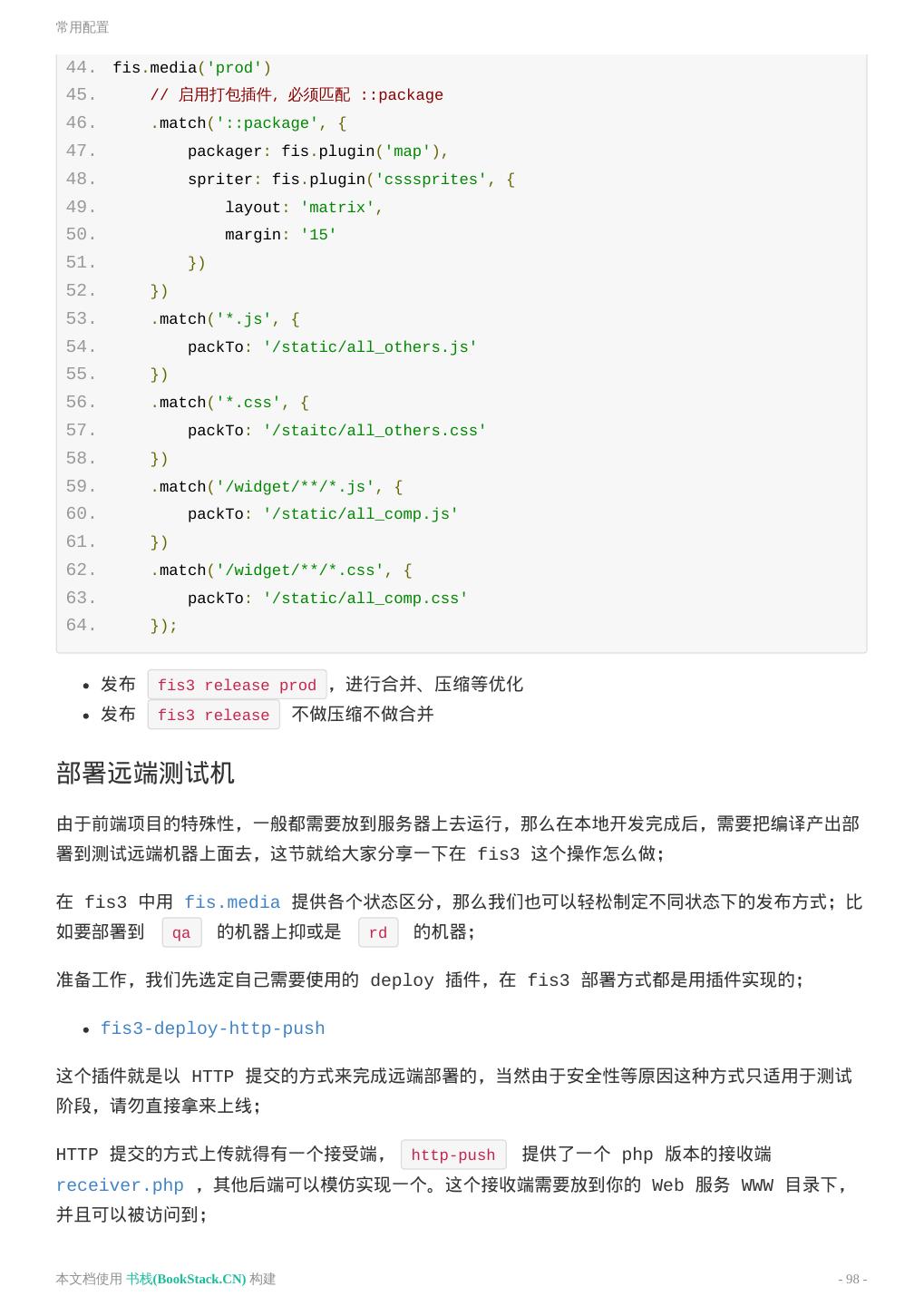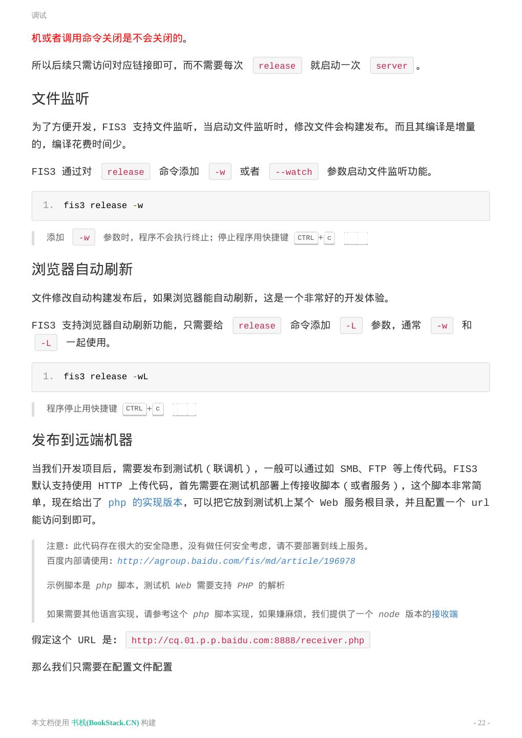 22 .调试 机或者调用命令关闭是不会关闭的。 所以后续只需访问对应链接即可,而不需要每次 release 就启动一次 server 。 文件监听 为了方便开发,FIS3 支持文件监听,当启动文件监听时,修改文件会构建发布。而且其编译是增量 的,编译花费时间少。 FIS3 通过对 release 命令添加 -w 或者 --watch 参数启动文件监听功能。 1. fis3 release -w 添加 -w 参数时,程序不会执行终止;停止程序用快捷键 CTRL + c 浏览器自动刷新 文件修改自动构建发布后,如果浏览器能自动刷新,这是一个非常好的开发体验。 FIS3 支持浏览器自动刷新功能,只需要给 release 命令添加 -L 参数,通常 -w 和 -L 一起使用。 1. fis3 release -wL 程序停止用快捷键 CTRL + c 发布到远端机器 当我们开发项目后,需要发布到测试机(联调机),一般可以通过如 SMB、FTP 等上传代码。FIS3 默认支持使用 HTTP 上传代码,首先需要在测试机部署上传接收脚本(或者服务),这个脚本非常简 单,现在给出了 php 的实现版本,可以把它放到测试机上某个 Web 服务根目录,并且配置一个 url 能访问到即可。 注意:此代码存在很大的安全隐患,没有做任何安全考虑,请不要部署到线上服务。 百度内部请使用:http://agroup.baidu.com/fis/md/article/196978 示例脚本是 php 脚本,测试机 Web 需要支持 PHP 的解析 如果需要其他语言实现,请参考这个 php 脚本实现,如果嫌麻烦,我们提供了一个 node 版本的接收端 假定这个 URL 是: http://cq.01.p.p.baidu.com:8888/receiver.php 那么我们只需要在配置文件配置 本文档使用 书栈(BookStack.CN) 构建 - 22 -