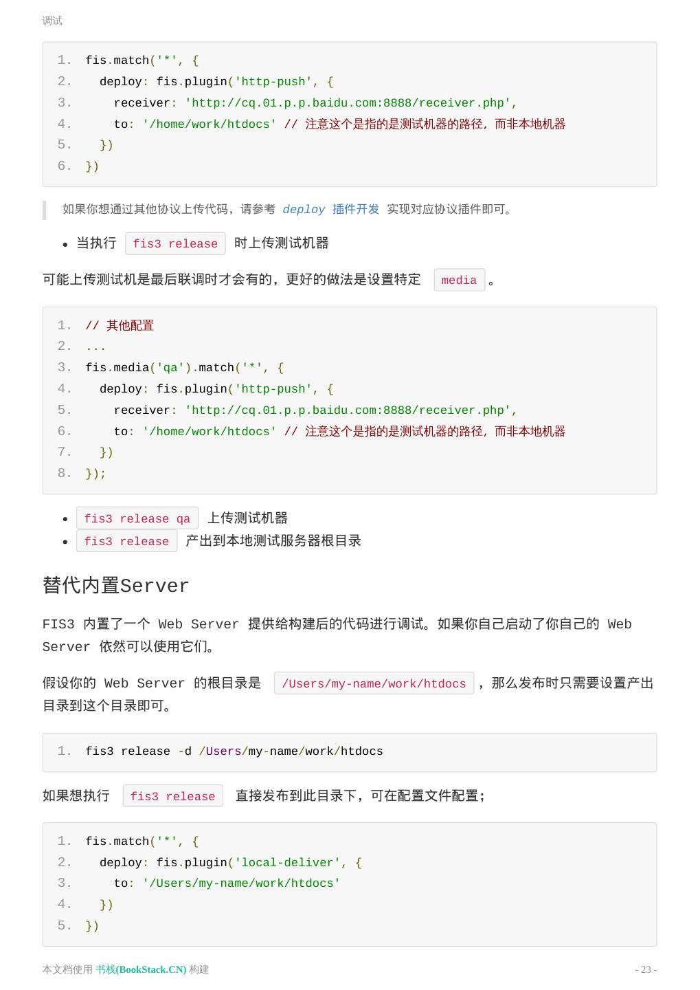 23 .调试 1. fis.match('*', { 2. deploy: fis.plugin('http-push', { 3. receiver: 'http://cq.01.p.p.baidu.com:8888/receiver.php', 4. to: '/home/work/htdocs' // 注意这个是指的是测试机器的路径,而非本地机器 5. }) 6. }) 如果你想通过其他协议上传代码,请参考 deploy 插件开发 实现对应协议插件即可。 当执行 fis3 release 时上传测试机器 可能上传测试机是最后联调时才会有的,更好的做法是设置特定 media 。 1. // 其他配置 2. ... 3. fis.media('qa').match('*', { 4. deploy: fis.plugin('http-push', { 5. receiver: 'http://cq.01.p.p.baidu.com:8888/receiver.php', 6. to: '/home/work/htdocs' // 注意这个是指的是测试机器的路径,而非本地机器 7. }) 8. }); fis3 release qa 上传测试机器 fis3 release 产出到本地测试服务器根目录 替代内置Server FIS3 内置了一个 Web Server 提供给构建后的代码进行调试。如果你自己启动了你自己的 Web Server 依然可以使用它们。 假设你的 Web Server 的根目录是 /Users/my-name/work/htdocs ,那么发布时只需要设置产出 目录到这个目录即可。 1. fis3 release -d /Users/my-name/work/htdocs 如果想执行 fis3 release 直接发布到此目录下,可在配置文件配置; 1. fis.match('*', { 2. deploy: fis.plugin('local-deliver', { 3. to: '/Users/my-name/work/htdocs' 4. }) 5. }) 本文档使用 书栈(BookStack.CN) 构建 - 23 -