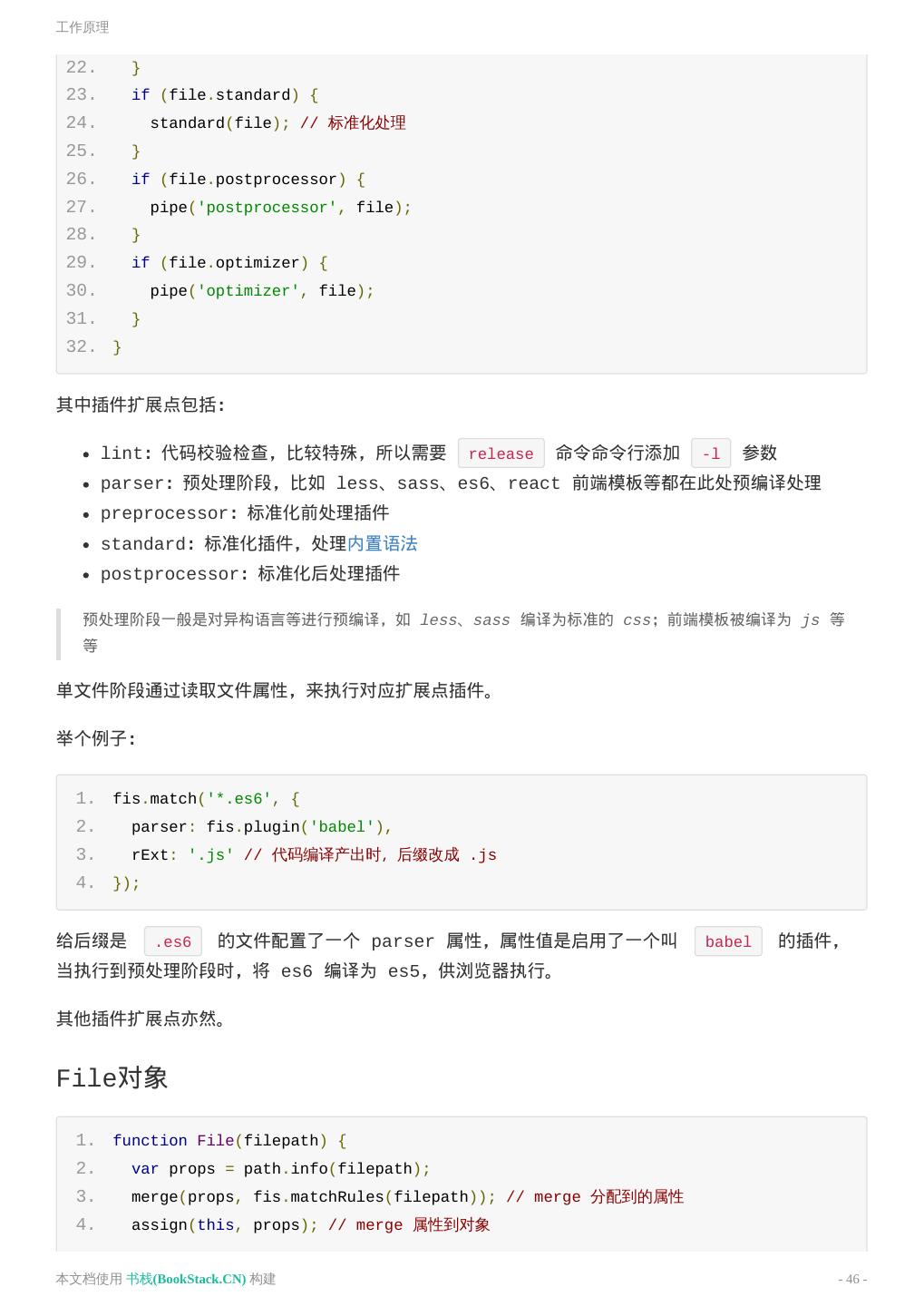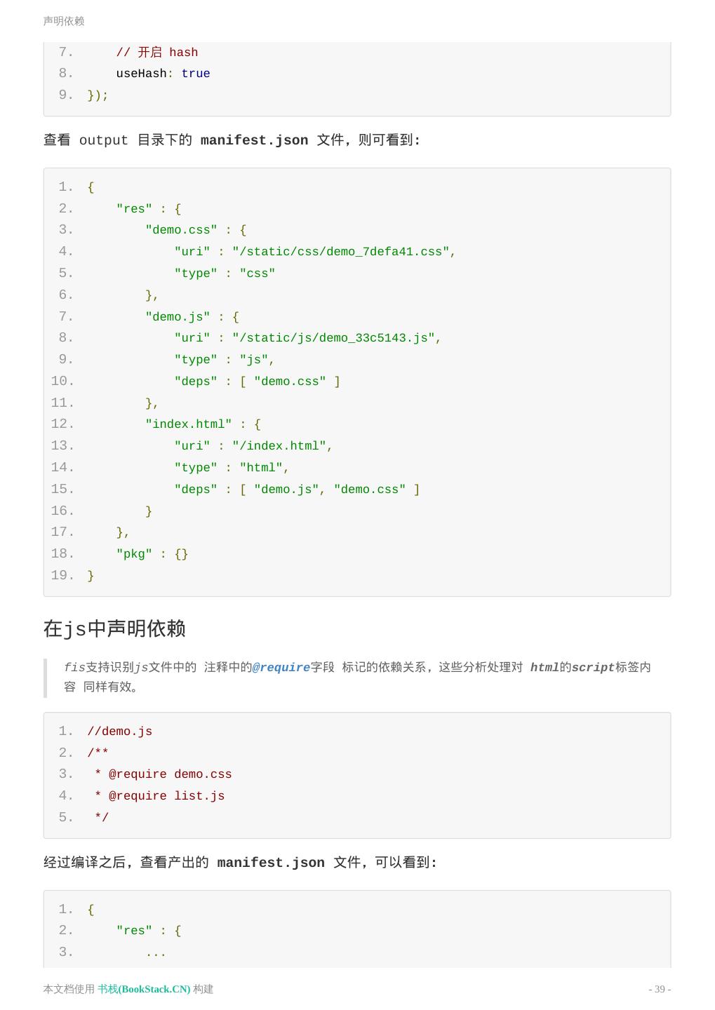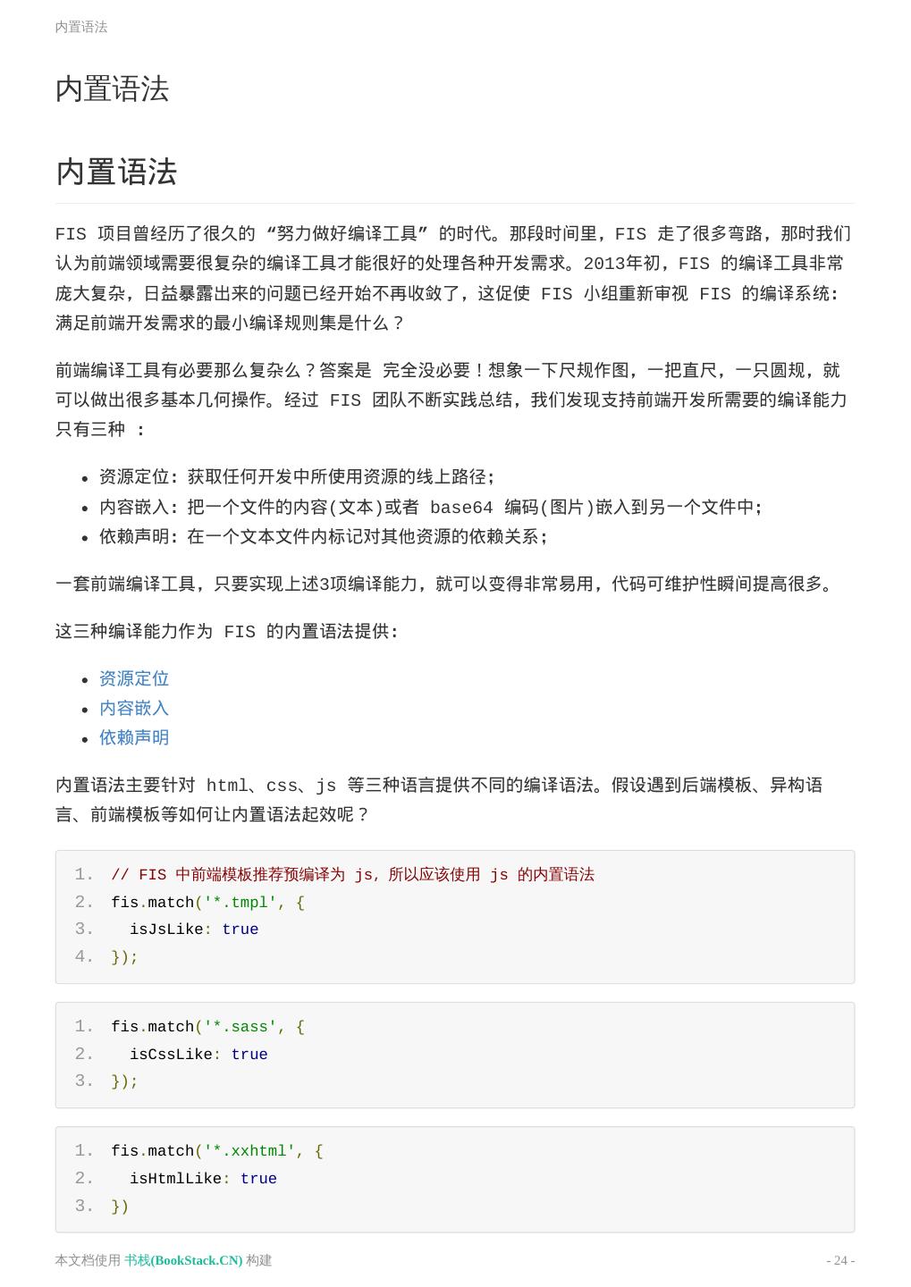 24 .内置语法 内置语法 内置语法 FIS 项目曾经历了很久的 “努力做好编译工具” 的时代。那段时间里,FIS 走了很多弯路,那时我们 认为前端领域需要很复杂的编译工具才能很好的处理各种开发需求。2013年初,FIS 的编译工具非常 庞大复杂,日益暴露出来的问题已经开始不再收敛了,这促使 FIS 小组重新审视 FIS 的编译系统: 满足前端开发需求的最小编译规则集是什么? 前端编译工具有必要那么复杂么?答案是 完全没必要!想象一下尺规作图,一把直尺,一只圆规,就 可以做出很多基本几何操作。经过 FIS 团队不断实践总结,我们发现支持前端开发所需要的编译能力 只有三种 : 资源定位:获取任何开发中所使用资源的线上路径; 内容嵌入:把一个文件的内容(文本)或者 base64 编码(图片)嵌入到另一个文件中; 依赖声明:在一个文本文件内标记对其他资源的依赖关系; 一套前端编译工具,只要实现上述3项编译能力,就可以变得非常易用,代码可维护性瞬间提高很多。 这三种编译能力作为 FIS 的内置语法提供: 资源定位 内容嵌入 依赖声明 内置语法主要针对 html、css、js 等三种语言提供不同的编译语法。假设遇到后端模板、异构语 言、前端模板等如何让内置语法起效呢? 1. // FIS 中前端模板推荐预编译为 js,所以应该使用 js 的内置语法 2. fis.match('*.tmpl', { 3. isJsLike: true 4. }); 1. fis.match('*.sass', { 2. isCssLike: true 3. }); 1. fis.match('*.xxhtml', { 2. isHtmlLike: true 3. }) 本文档使用 书栈(BookStack.CN) 构建 - 24 -