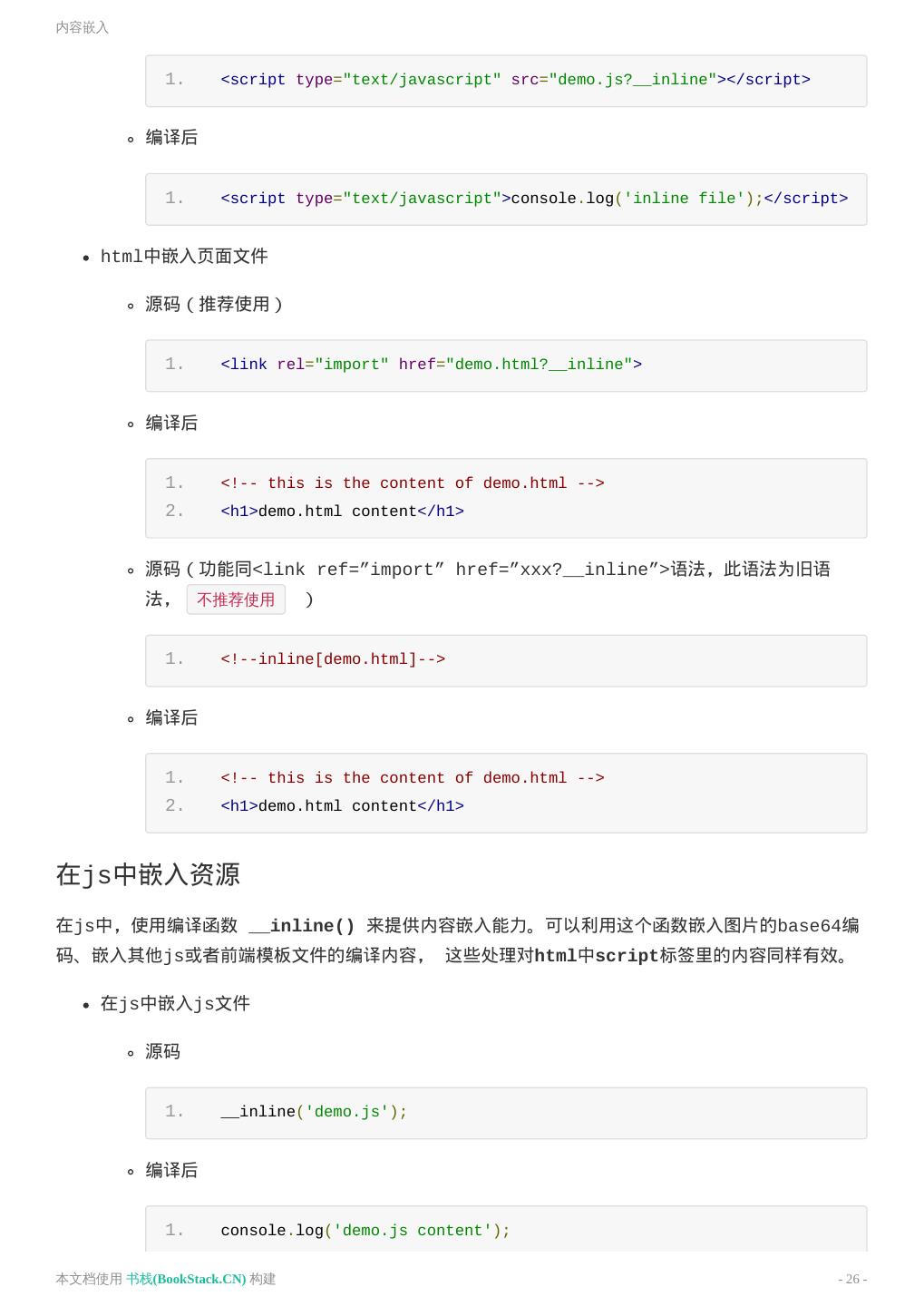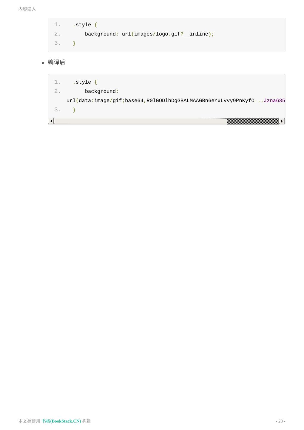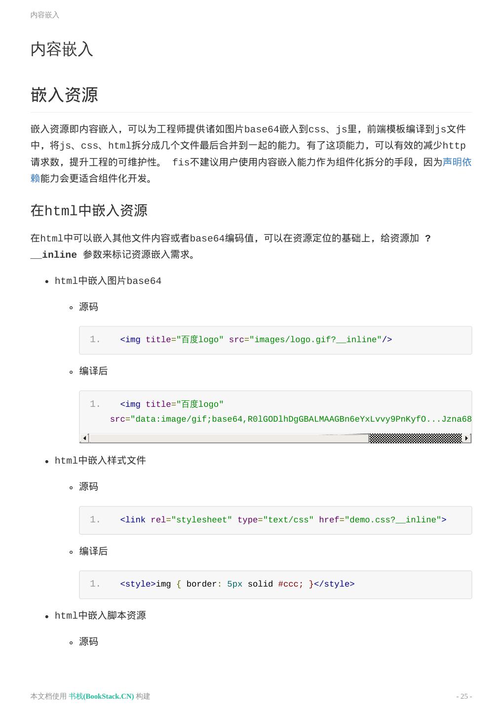 26 .内容嵌入 1. <script type="text/javascript" src="demo.js?__inline"></script> 编译后 1. <script type="text/javascript">console.log('inline file');</script> html中嵌入页面文件 源码(推荐使用) 1. <link rel="import" href="demo.html?__inline"> 编译后 1. <!-- this is the content of demo.html --> 2. <h1>demo.html content</h1> 源码(功能同<link ref=”import” href=”xxx?__inline”>语法,此语法为旧语 法, 不推荐使用 ) 1. <!--inline[demo.html]--> 编译后 1. <!-- this is the content of demo.html --> 2. <h1>demo.html content</h1> 在js中嵌入资源 在js中,使用编译函数 __inline() 来提供内容嵌入能力。可以利用这个函数嵌入图片的base64编 码、嵌入其他js或者前端模板文件的编译内容, 这些处理对html中script标签里的内容同样有效。 在js中嵌入js文件 源码 1. __inline('demo.js'); 编译后 1. console.log('demo.js content'); 本文档使用 书栈(BookStack.CN) 构建 - 26 -