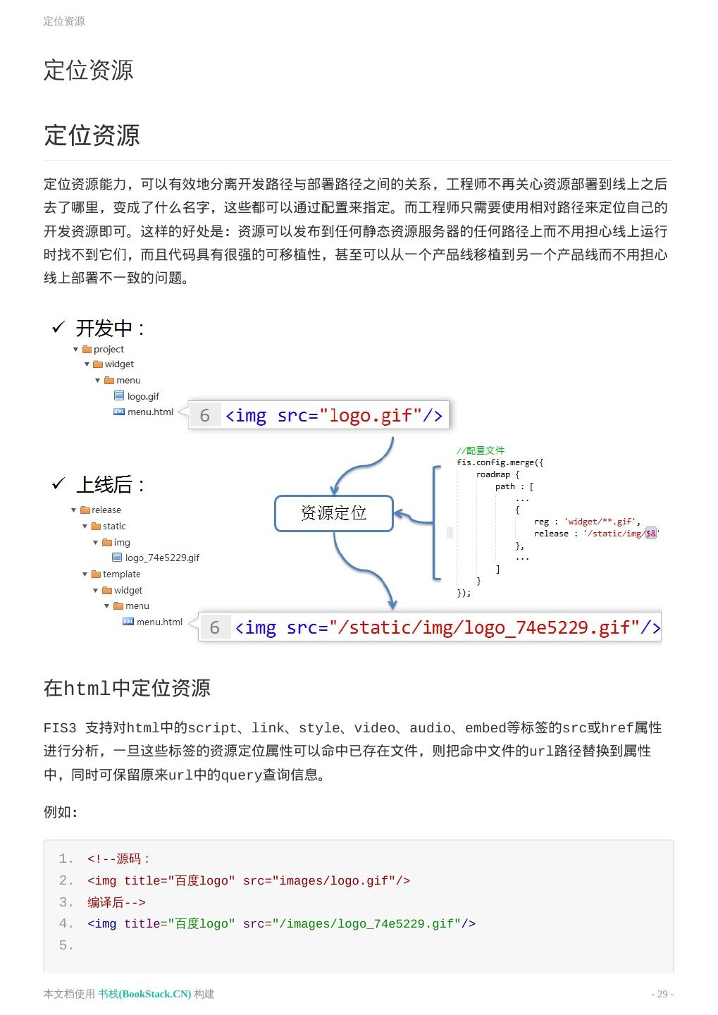 29 .定位资源 定位资源 定位资源 定位资源能力,可以有效地分离开发路径与部署路径之间的关系,工程师不再关心资源部署到线上之后 去了哪里,变成了什么名字,这些都可以通过配置来指定。而工程师只需要使用相对路径来定位自己的 开发资源即可。这样的好处是:资源可以发布到任何静态资源服务器的任何路径上而不用担心线上运行 时找不到它们,而且代码具有很强的可移植性,甚至可以从一个产品线移植到另一个产品线而不用担心 线上部署不一致的问题。 在html中定位资源 FIS3 支持对html中的script、link、style、video、audio、embed等标签的src或href属性 进行分析,一旦这些标签的资源定位属性可以命中已存在文件,则把命中文件的url路径替换到属性 中,同时可保留原来url中的query查询信息。 例如: 1. <!--源码: 2. <img title="百度logo" src="images/logo.gif"/> 3. 编译后--> 4. <img title="百度logo" src="/images/logo_74e5229.gif"/> 5. 本文档使用 书栈(BookStack.CN) 构建 - 29 -