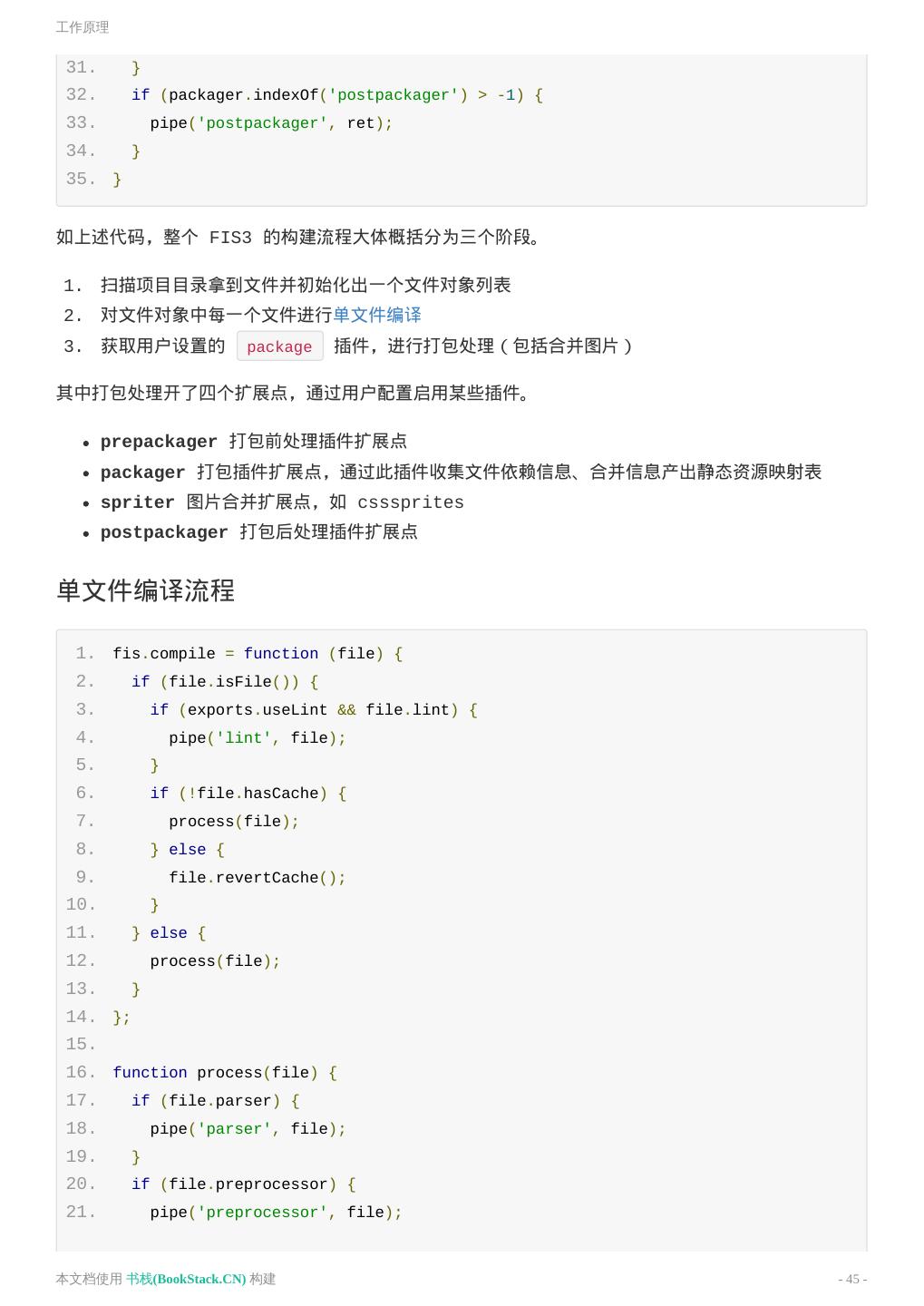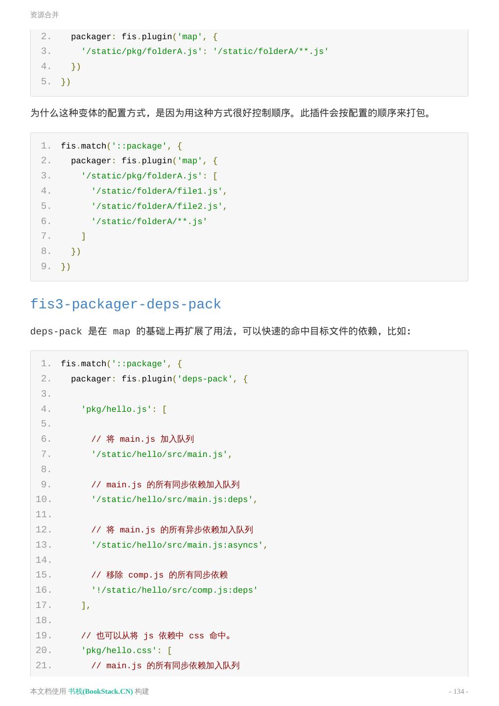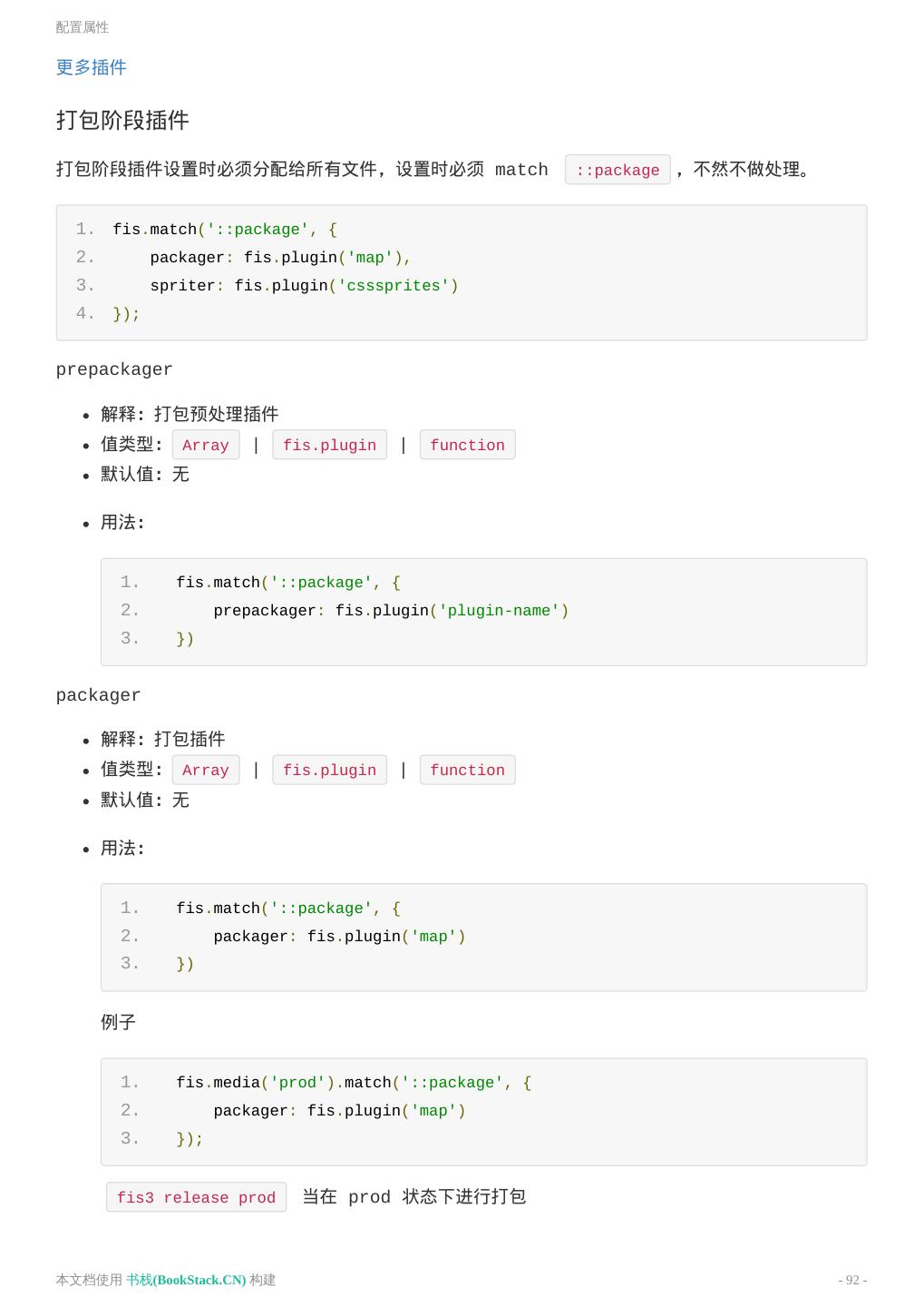 20 .构建 2. fis.match('*.{js,css,png}', { 3. useHash: true 4. }); 5. 6. // 启用 fis-spriter-csssprites 插件 7. fis.match('::package', { 8. spriter: fis.plugin('csssprites') 9. }); 10. 11. // 对 CSS 进行图片合并 12. fis.match('*.css', { 13. // 给匹配到的文件分配属性 `useSprite` 14. useSprite: true 15. }); 16. 17. fis.match('*.js', { 18. // fis-optimizer-uglify-js 插件进行压缩,已内置 19. optimizer: fis.plugin('uglify-js') 20. }); 21. 22. fis.match('*.css', { 23. // fis-optimizer-clean-css 插件进行压缩,已内置 24. optimizer: fis.plugin('clean-css') 25. }); 26. 27. fis.match('*.png', { 28. // fis-optimizer-png-compressor 插件进行压缩,已内置 29. optimizer: fis.plugin('png-compressor') 30. }); fis3 release 时添加 md5、静态资源压缩、css 文件引用图片进行合并 可能有时候开发的时候不需要压缩、合并图片、也不需要 hash。那么给上面配置追加如下配置; 1. fis.media('debug').match('*.{js,css,png}', { 2. useHash: false, 3. useSprite: false, 4. optimizer: null 5. }) fis3 release debug 启用 media debug 的配置,覆盖上面的配置,把诸多功能关掉。 本文档使用 书栈(BookStack.CN) 构建 - 20 -