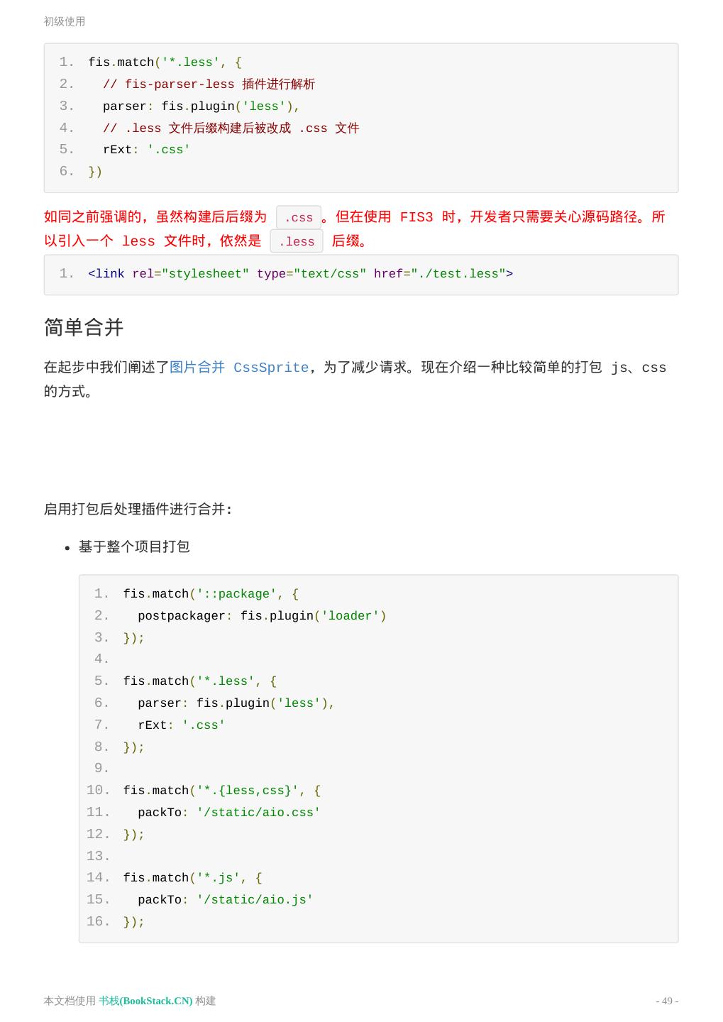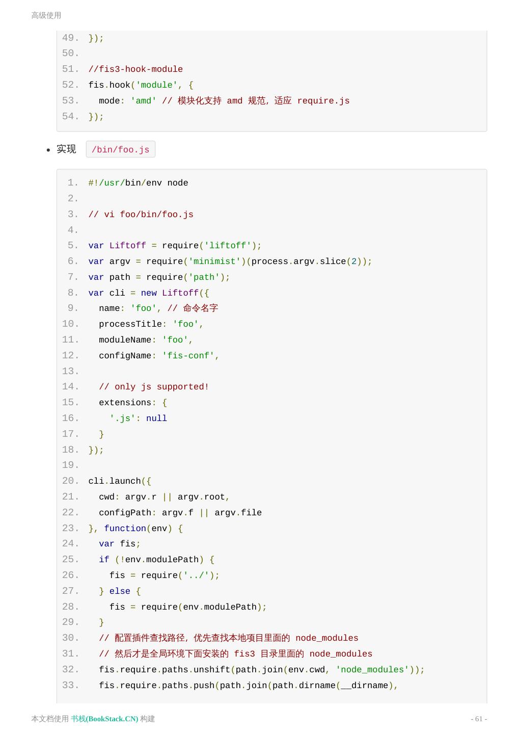 5 .README 3. fis3 init 4. fis3 release 5. fis3 server start --type node fis-conf.js 的例子 1. // default settings. fis3 release 2. 3. // Global start 4. fis.match('*.{js,css}', { 5. useHash: true 6. }); 7. 8. fis.match('::image', { 9. useHash: true 10. }); 11. 12. fis.match('*.js', { 13. optimizer: fis.plugin('uglify-js') // js 压缩 14. }); 15. 16. fis.match('*.css', { 17. optimizer: fis.plugin('clean-css') // css 压缩 18. }); 19. 20. fis.match('*.png', { 21. optimizer: fis.plugin('png-compressor') // png 图片压缩 22. }); 23. 24. // Global end 25. 26. // default media is `dev` 27. fis.media('dev') 28. .match('*', { 29. useHash: false, 30. optimizer: null 31. }); 32. 33. // extends GLOBAL config 34. fis.media('production'); 本文档使用 书栈(BookStack.CN) 构建 - 5 -