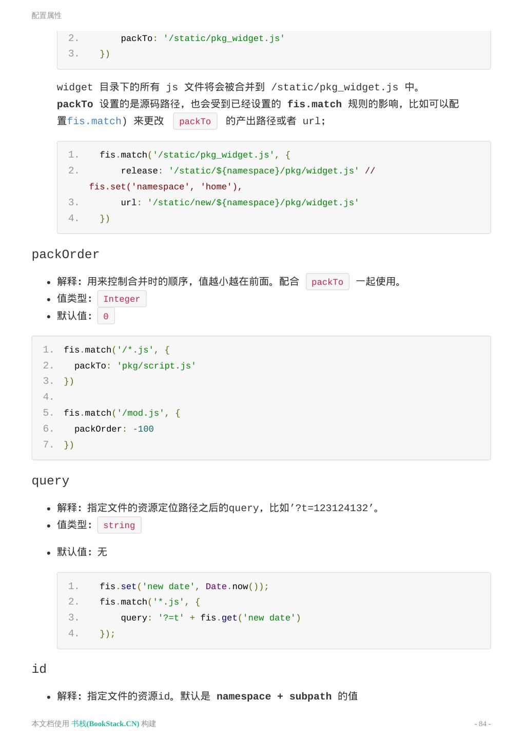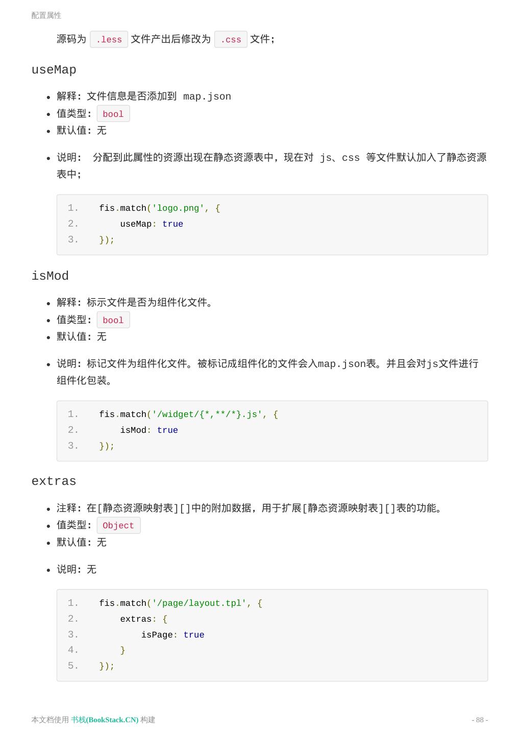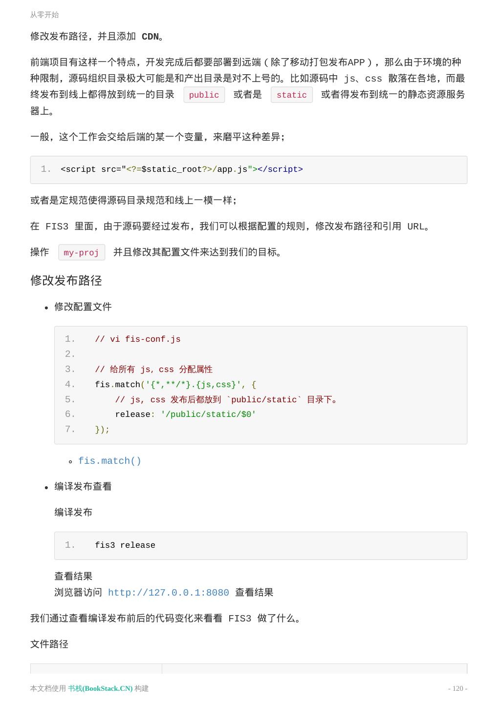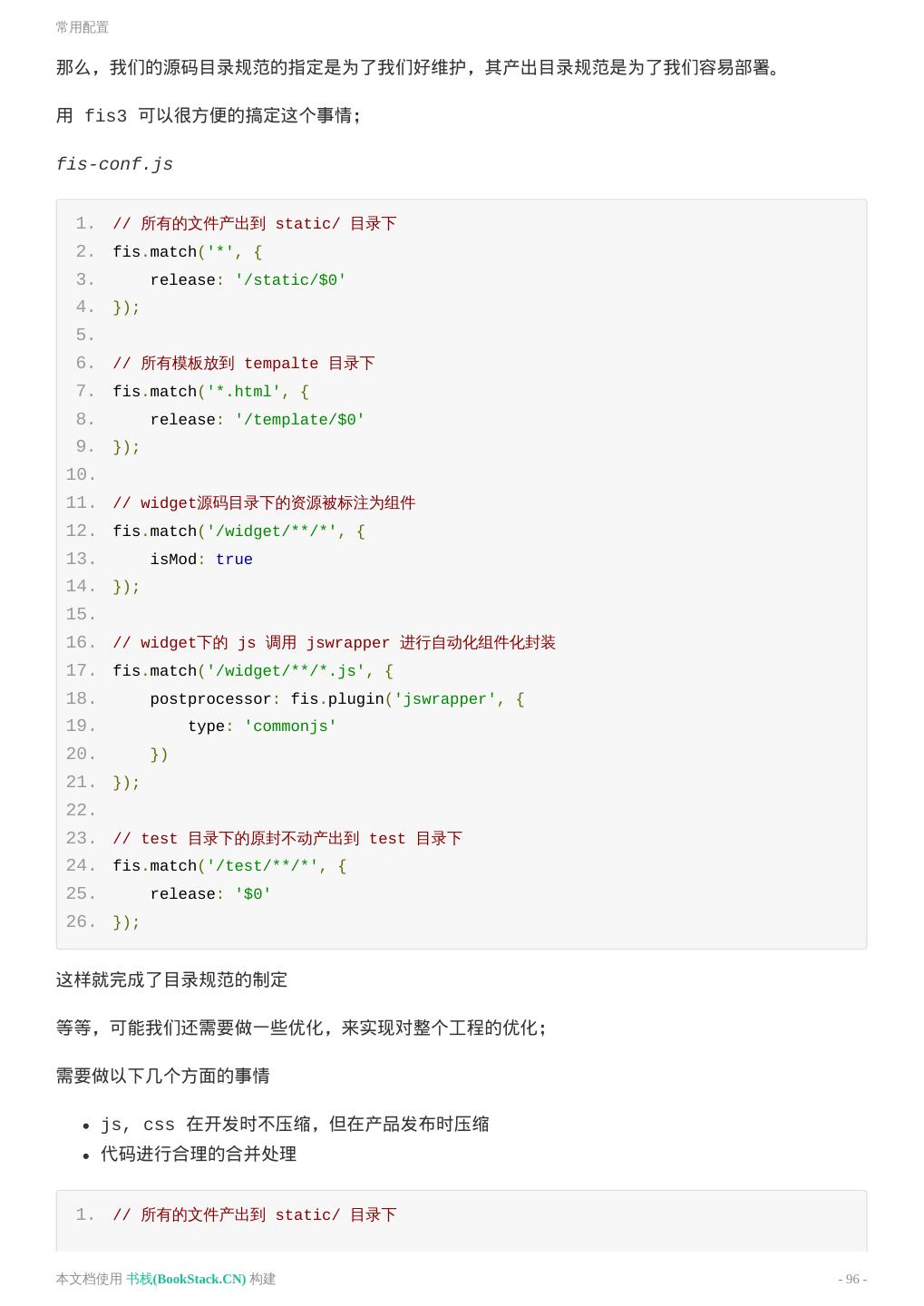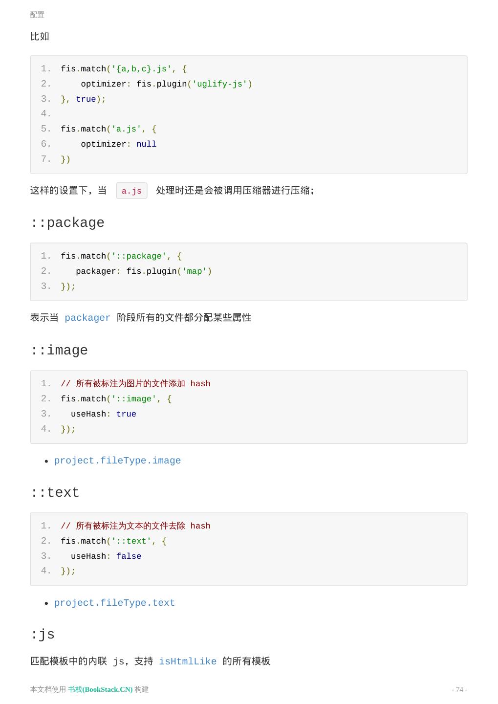 13 .构建 1. // 配置配置文件,注意,清空所有的配置,只留下以下代码即可。 2. fis.match('*.{png,js,css}', { 3. release: '/static/$0' 4. }); 同样构建到 ../output 目录下看变化。 1. fis3 release -d ../output 以上示例只是更改部署路径,还可以给 url 添加 CDN domain 或者添加文件指纹(时间戳或 者md5戳)。 再次强调,FIS3 的构建是不会对源码做修改的,而是构建产出到了另外一个目录,并且构建的结果才 是用来上线使用的。 可能有人会疑惑,修改成了绝对路径,本地如何调试开发?下一节介绍调试的方法。 配置文件 默认配置文件为 fis-conf.js ,FIS3 编译的整个流程都是通过配置来控制的。FIS3 定义了一种 类似 CSS 的配置方式。固化了构建流程,让工程构建变得简单。 fis.match() 首先介绍设置规则的配置接口 1. fis.match(selector, props); selector :FIS3 把匹配文件路径的路径作为selector,匹配到的文件会分配给它设置的 props 。关于 selector 语法,请参看 Glob 说明 props :编译规则属性,包括文件属性和插件属性,更多属性 我们修改例子的配置文件 fis-conf.js ,添加以下内容 本文档使用 书栈(BookStack.CN) 构建 - 13 -