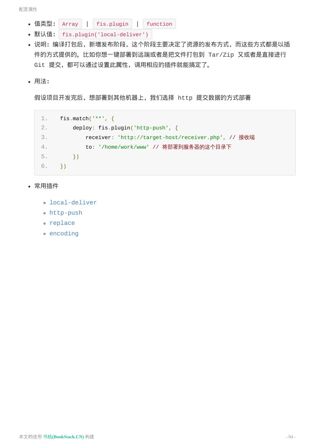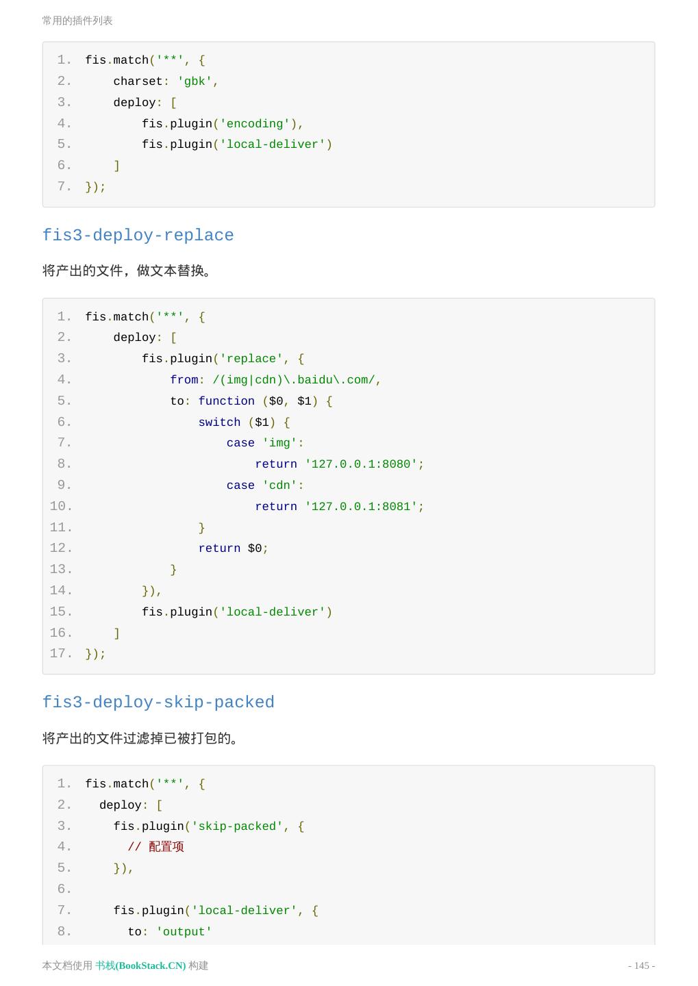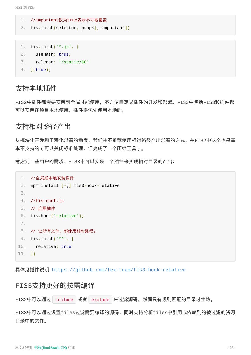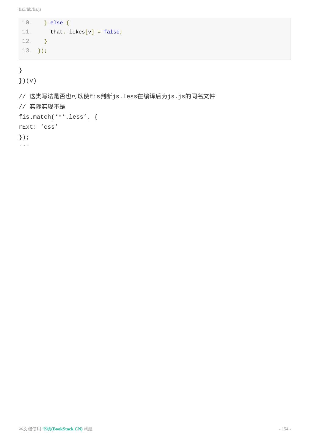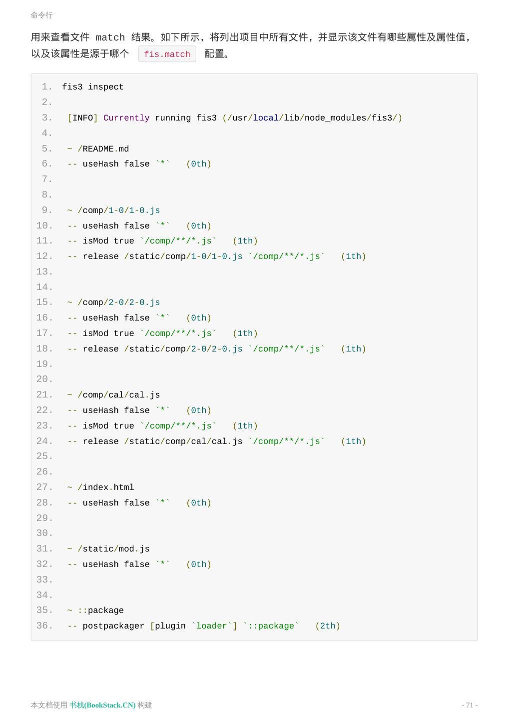 13 .构建 1. // 配置配置文件,注意,清空所有的配置,只留下以下代码即可。 2. fis.match('*.{png,js,css}', { 3. release: '/static/$0' 4. }); 同样构建到 ../output 目录下看变化。 1. fis3 release -d ../output 以上示例只是更改部署路径,还可以给 url 添加 CDN domain 或者添加文件指纹(时间戳或 者md5戳)。 再次强调,FIS3 的构建是不会对源码做修改的,而是构建产出到了另外一个目录,并且构建的结果才 是用来上线使用的。 可能有人会疑惑,修改成了绝对路径,本地如何调试开发?下一节介绍调试的方法。 配置文件 默认配置文件为 fis-conf.js ,FIS3 编译的整个流程都是通过配置来控制的。FIS3 定义了一种 类似 CSS 的配置方式。固化了构建流程,让工程构建变得简单。 fis.match() 首先介绍设置规则的配置接口 1. fis.match(selector, props); selector :FIS3 把匹配文件路径的路径作为selector,匹配到的文件会分配给它设置的 props 。关于 selector 语法,请参看 Glob 说明 props :编译规则属性,包括文件属性和插件属性,更多属性 我们修改例子的配置文件 fis-conf.js ,添加以下内容 本文档使用 书栈(BookStack.CN) 构建 - 13 -