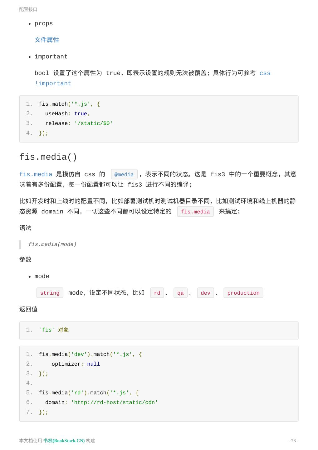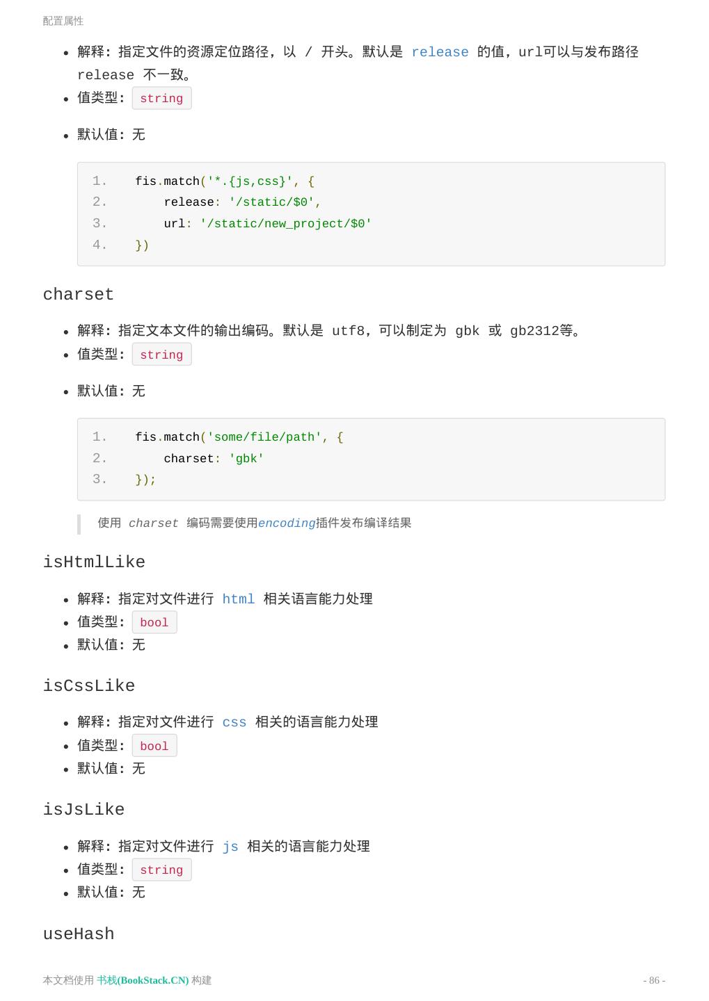 14 .构建 1. fis.match('*.js', { 2. useHash: false 3. }); 4. 5. fis.match('*.css', { 6. useHash: false 7. }); 8. 9. fis.match('*.png', { 10. useHash: false 11. }); 重要特性 规则覆盖 假设有两条规则 A 和 B,它俩同时命中了文件 test.js ,如果 A 在 B 前面,B 的属性会 覆盖 A 的同名属性。不同名属性追加到 test.js 的 File 对象上。 1. // A 2. fis.match('*', { 3. release: '/dist/$0' 4. }); 5. 6. // B 7. fis.match('test.js', { 8. useHash: true, 9. release: '/dist/js/$0' 10. }) 那么 test.js 分配到的属性 1. { 2. useHash: true, // B 3. release: '/dist/js/$0' // B 4. } fis.media() fis.media() 接口提供多种状态功能,比如有些配置是仅供开发环境下使用,有些则是仅供生产环 境使用的。 本文档使用 书栈(BookStack.CN) 构建 - 14 -