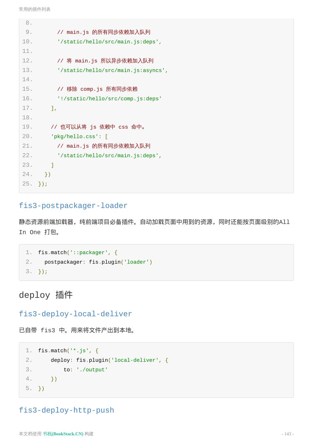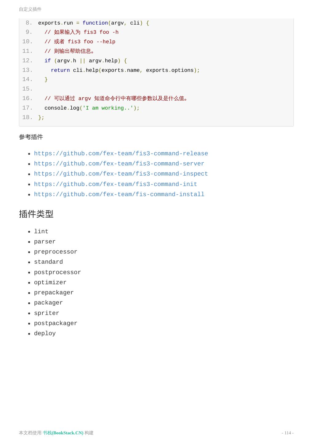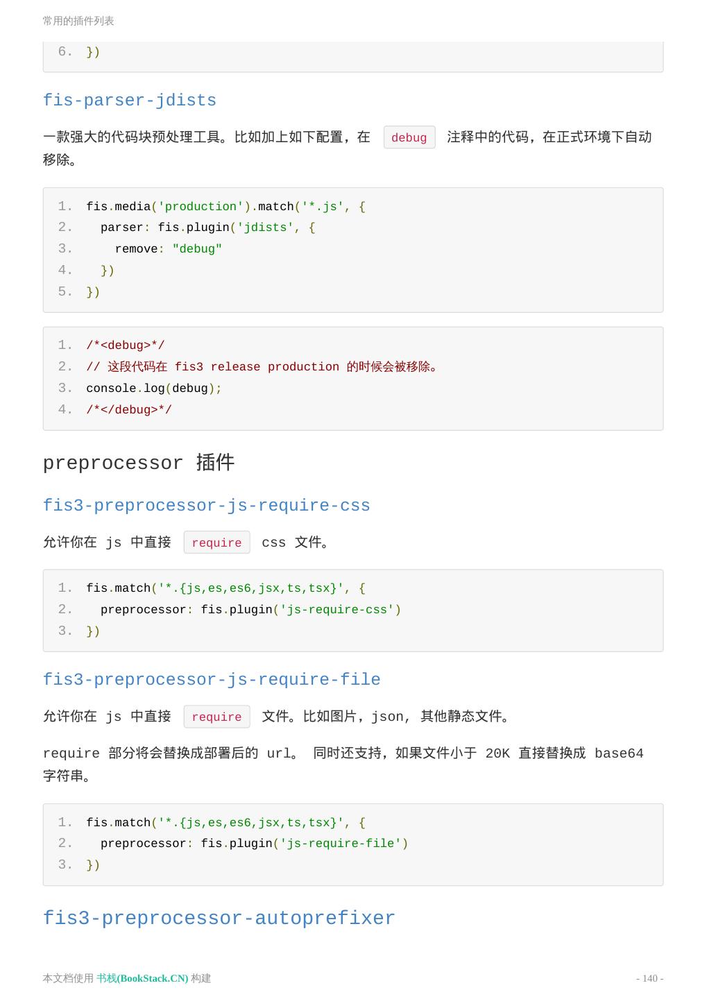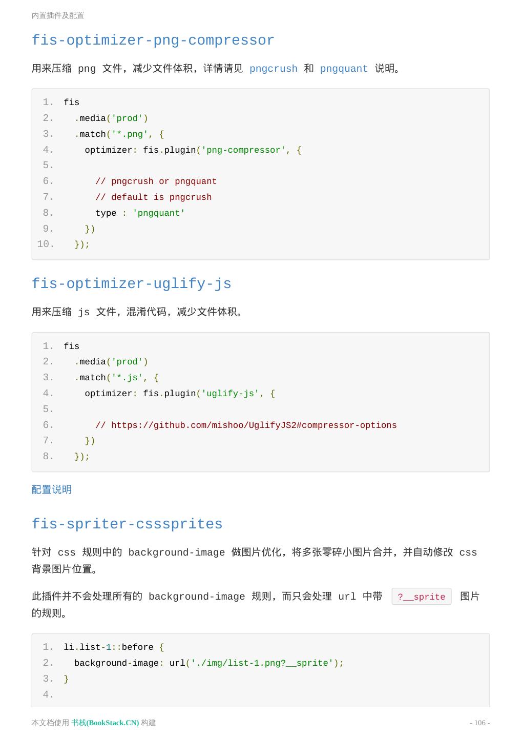 6 .README 其他例子 https://github.com/fex-team/fis3-demo 常用插件 优化类(插件属性:optimizer) fis-optimizer-uglify-js UglifyJS2 压缩插件 fis-optimizer-clean-css CleanCss 压缩插件 fis-optimizer-png-compressor PNG 压缩插件 预处理类(插件属性:parser) fis-parser-less less 解析插件 fis-parser-node-sass sass / scss 解析插件 fis-parser-handlebars handlebars 解析插件 来源(书栈小编注) https://github.com/fex-team/fis3 本文档使用 书栈(BookStack.CN) 构建 - 6 -