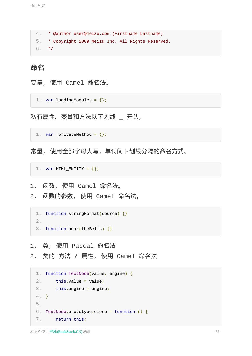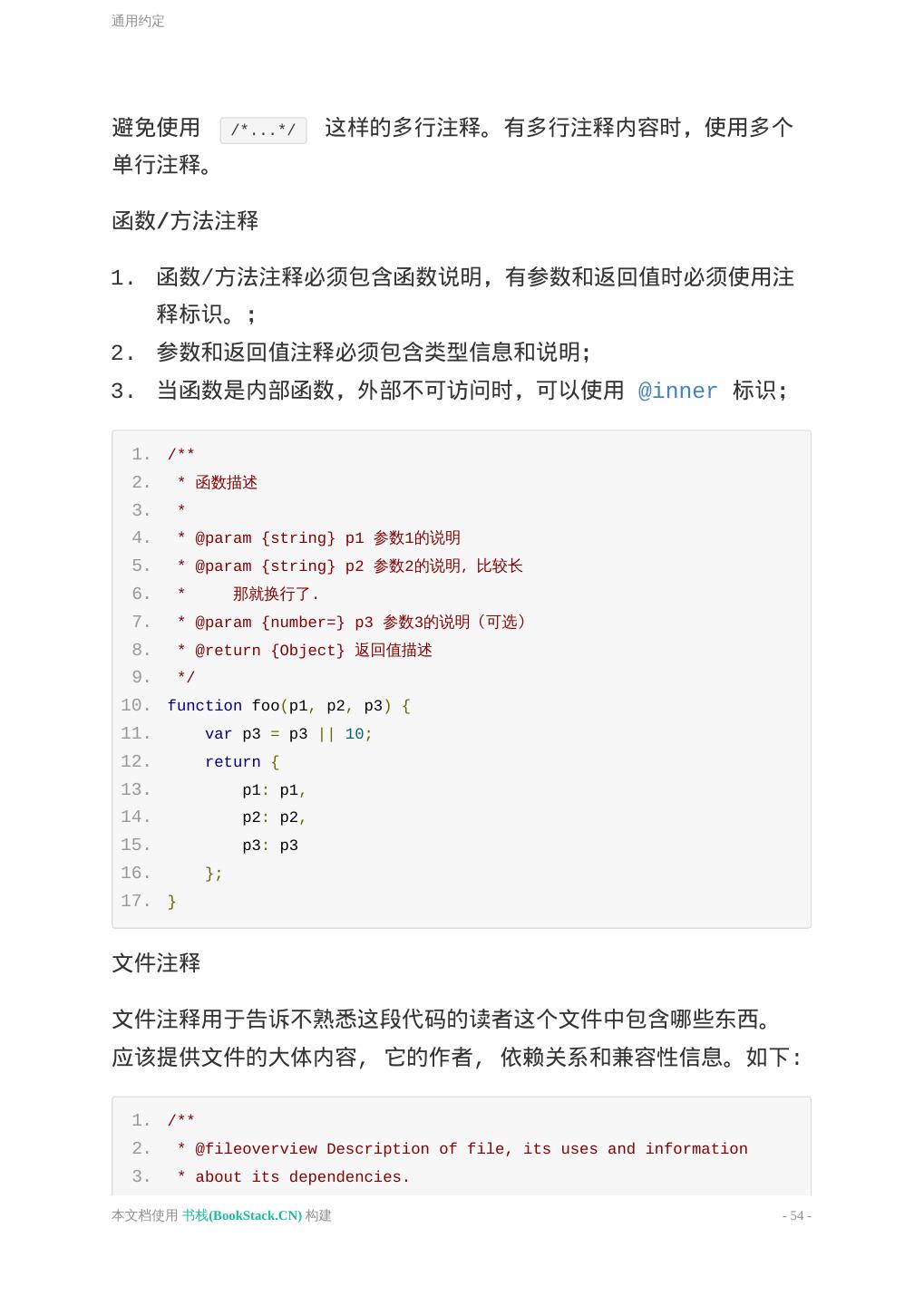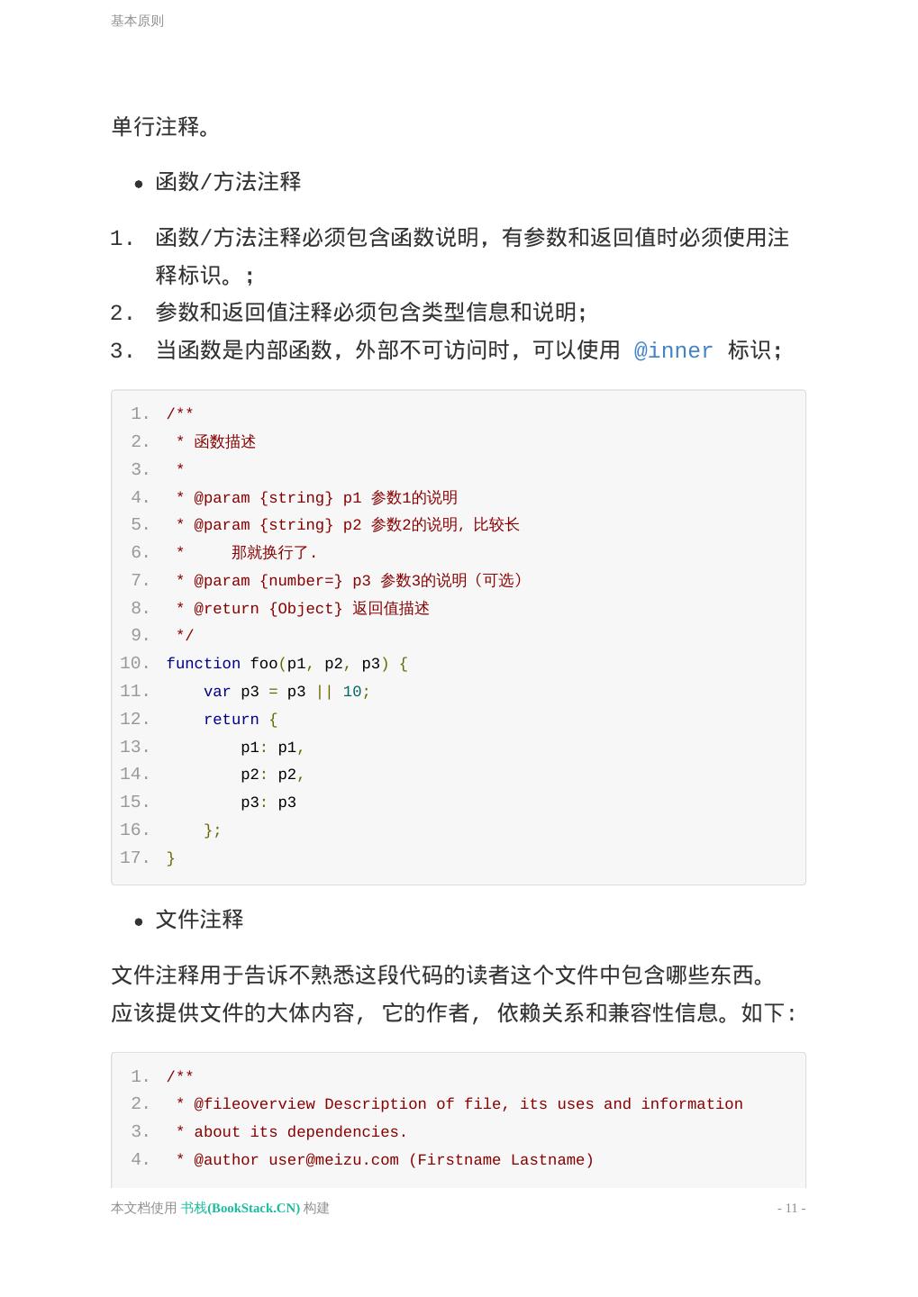 11 .基本原则 单行注释。 函数/方法注释 1. 函数/方法注释必须包含函数说明,有参数和返回值时必须使用注 释标识。; 2. 参数和返回值注释必须包含类型信息和说明; 3. 当函数是内部函数,外部不可访问时,可以使用 @inner 标识; 1. /** 2. * 函数描述 3. * 4. * @param {string} p1 参数1的说明 5. * @param {string} p2 参数2的说明,比较长 6. * 那就换行了. 7. * @param {number=} p3 参数3的说明(可选) 8. * @return {Object} 返回值描述 9. */ 10. function foo(p1, p2, p3) { 11. var p3 = p3 || 10; 12. return { 13. p1: p1, 14. p2: p2, 15. p3: p3 16. }; 17. } 文件注释 文件注释用于告诉不熟悉这段代码的读者这个文件中包含哪些东西。 应该提供文件的大体内容, 它的作者, 依赖关系和兼容性信息。如下: 1. /** 2. * @fileoverview Description of file, its uses and information 3. * about its dependencies. 4. * @author user@meizu.com (Firstname Lastname) 本文档使用 书栈(BookStack.CN) 构建 - 11 -