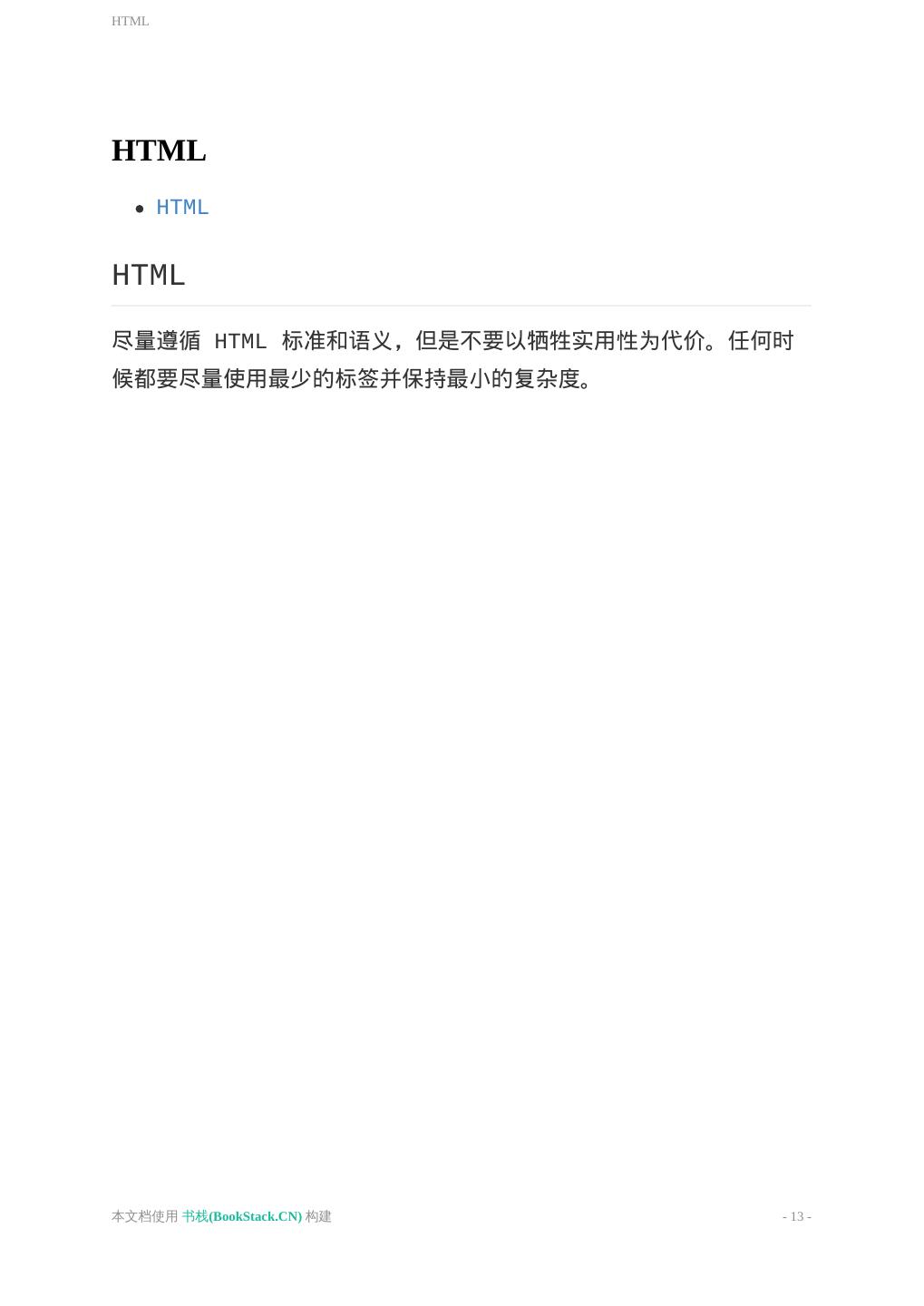13 .HTML HTML HTML HTML 尽量遵循 HTML 标准和语义,但是不要以牺牲实用性为代价。任何时 候都要尽量使用最少的标签并保持最小的复杂度。 本文档使用 书栈(BookStack.CN) 构建 - 13 -