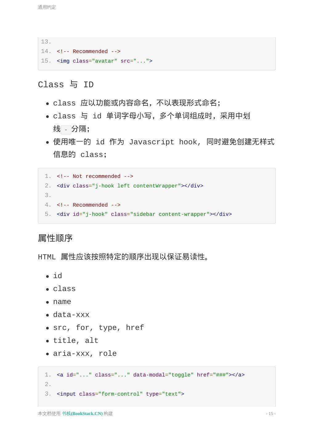 14 .通用约定 通用约定 通用约定 标签 Class 与 ID 属性顺序 引号 嵌套 布尔值属性 通用约定 标签 自闭合(self-closing)标签,无需闭合 ( 例如: img input br hr 等 ); 可选的闭合标签(closing tag),需闭合 ( 例如: </li> 或 </body> ); 尽量减少标签数量; 1. <img src="images/google.png" alt="Google"> 2. <input type="text" name="title"> 3. 4. <ul> 5. <li>Style</li> 6. <li>Guide</li> 7. </ul> 8. 9. <!-- Not recommended --> 10. <span class="avatar"> 11. <img src="..."> 12. </span> 本文档使用 书栈(BookStack.CN) 构建 - 14 -
