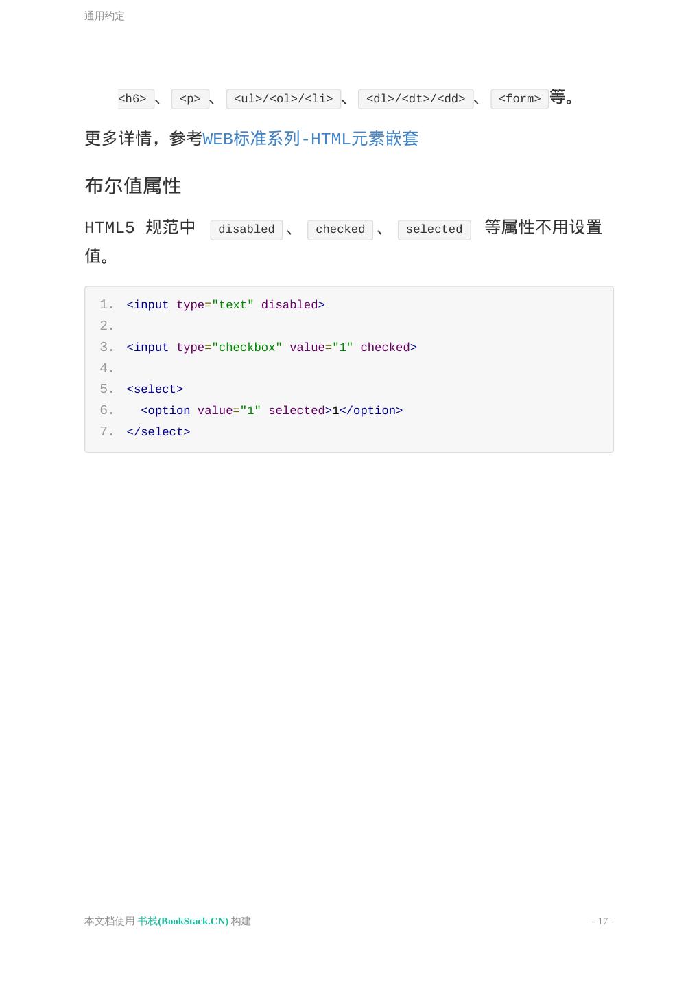 17 .通用约定 <h6> 、 <p> 、 <ul>/<ol>/<li> 、 <dl>/<dt>/<dd> 、 <form> 等。 更多详情,参考WEB标准系列-HTML元素嵌套 布尔值属性 HTML5 规范中 disabled 、 checked 、 selected 等属性不用设置 值。 1. <input type="text" disabled> 2. 3. <input type="checkbox" value="1" checked> 4. 5. <select> 6. <option value="1" selected>1</option> 7. </select> 本文档使用 书栈(BookStack.CN) 构建 - 17 -