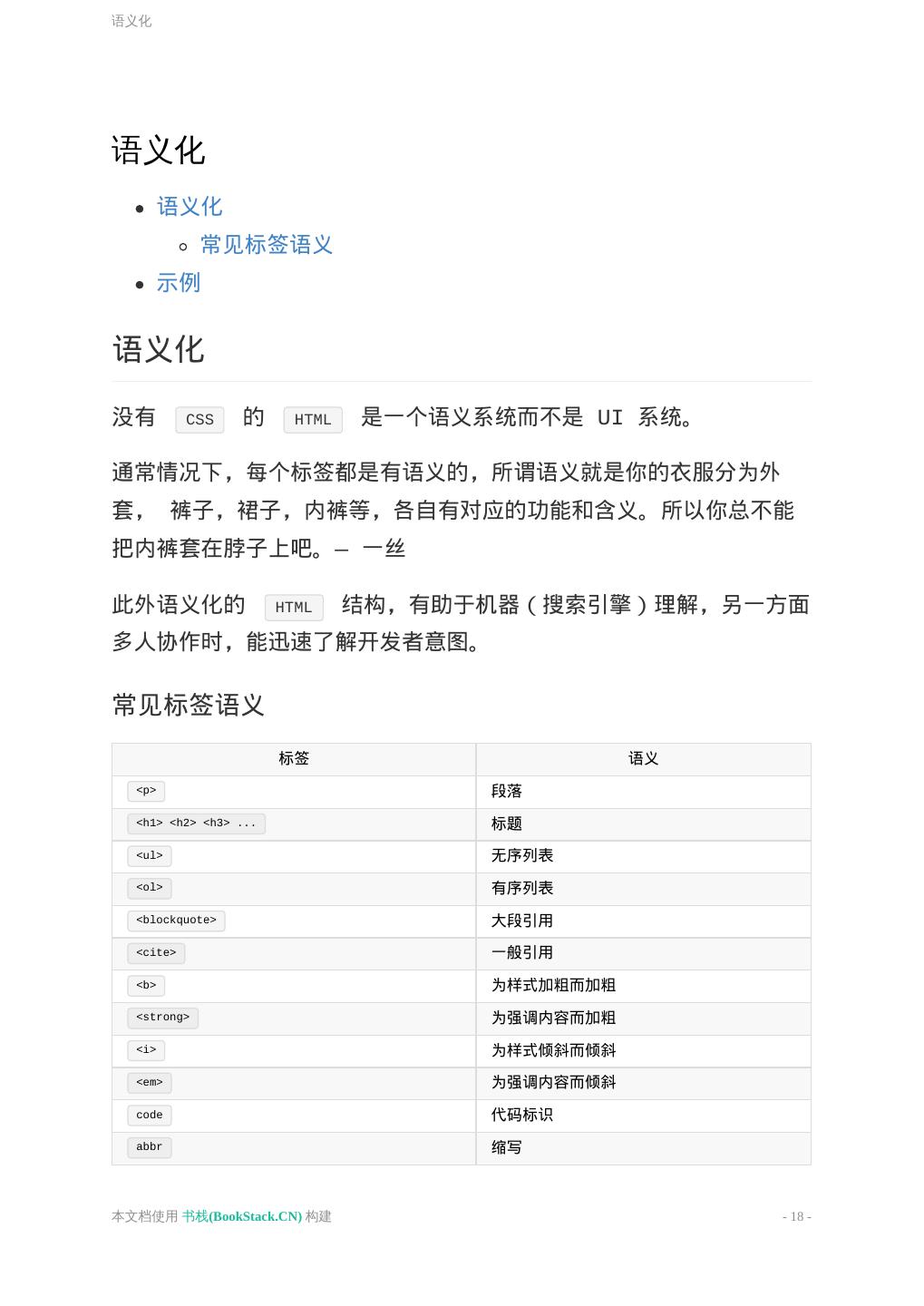 18 .语义化 语义化 语义化 常见标签语义 示例 语义化 没有 CSS 的 HTML 是一个语义系统而不是 UI 系统。 通常情况下,每个标签都是有语义的,所谓语义就是你的衣服分为外 套, 裤子,裙子,内裤等,各自有对应的功能和含义。所以你总不能 把内裤套在脖子上吧。— 一丝 此外语义化的 HTML 结构,有助于机器(搜索引擎)理解,另一方面 多人协作时,能迅速了解开发者意图。 常见标签语义 标签 语义 <p> 段落 <h1> <h2> <h3> ... 标题 <ul> 无序列表 <ol> 有序列表 <blockquote> 大段引用 <cite> 一般引用 <b> 为样式加粗而加粗 <strong> 为强调内容而加粗 <i> 为样式倾斜而倾斜 <em> 为强调内容而倾斜 code 代码标识 abbr 缩写 本文档使用 书栈(BookStack.CN) 构建 - 18 -