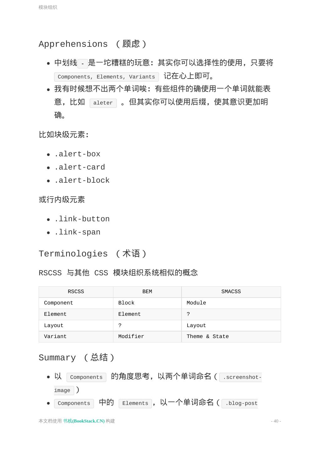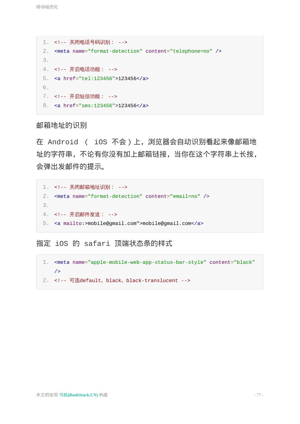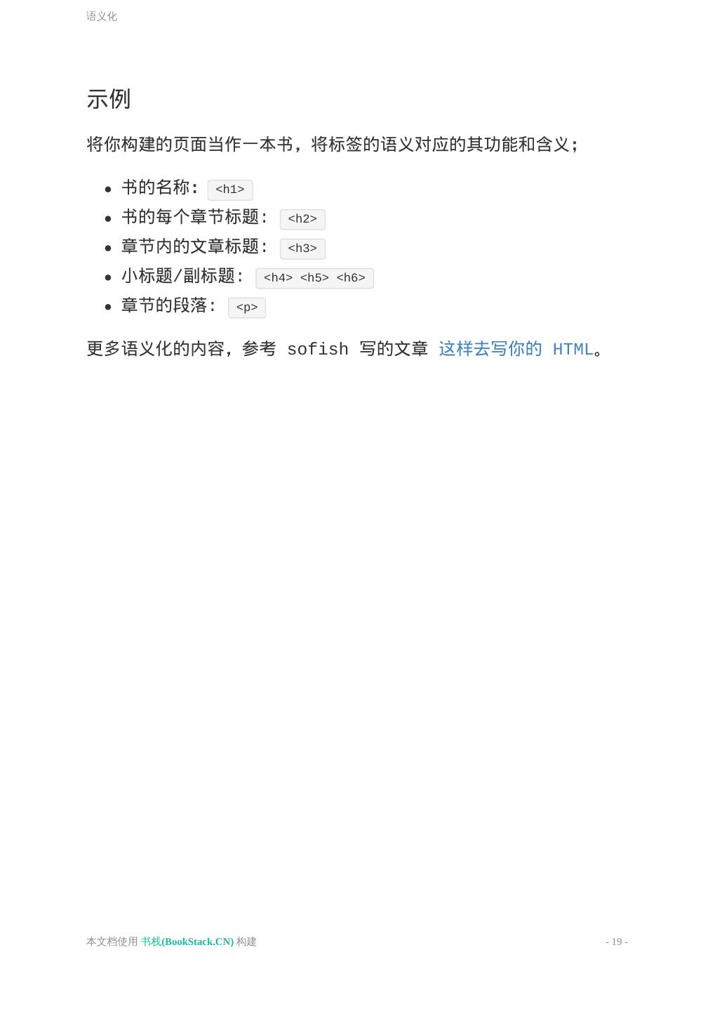 19 .语义化 示例 将你构建的页面当作一本书,将标签的语义对应的其功能和含义; 书的名称: <h1> 书的每个章节标题: <h2> 章节内的文章标题: <h3> 小标题/副标题: <h4> <h5> <h6> 章节的段落: <p> 更多语义化的内容,参考 sofish 写的文章 这样去写你的 HTML。 本文档使用 书栈(BookStack.CN) 构建 - 19 -