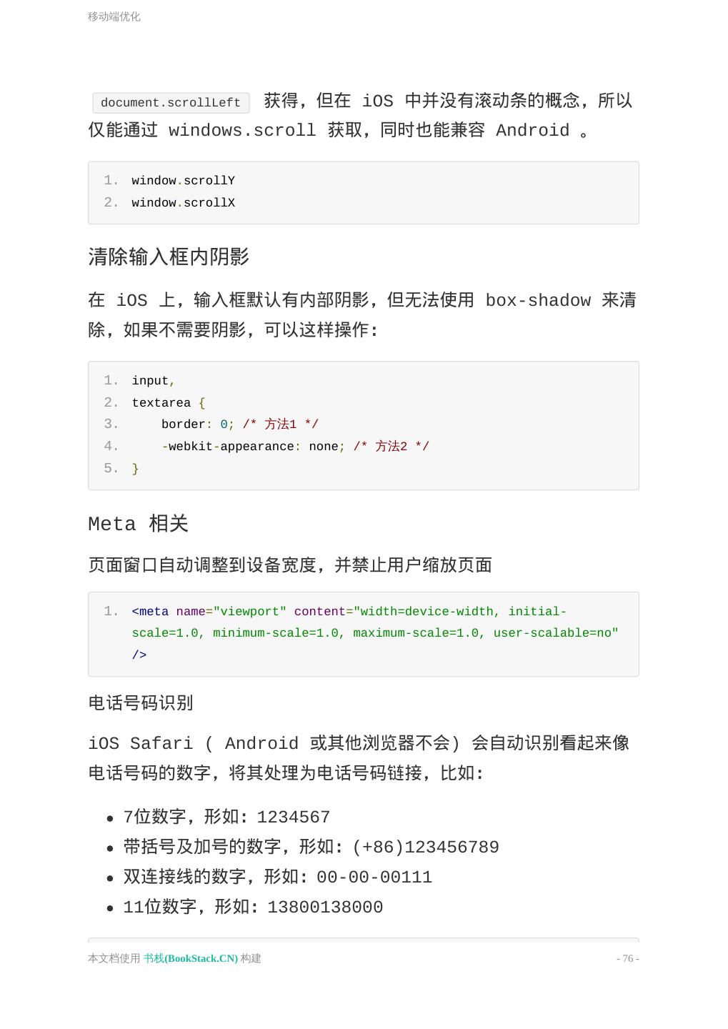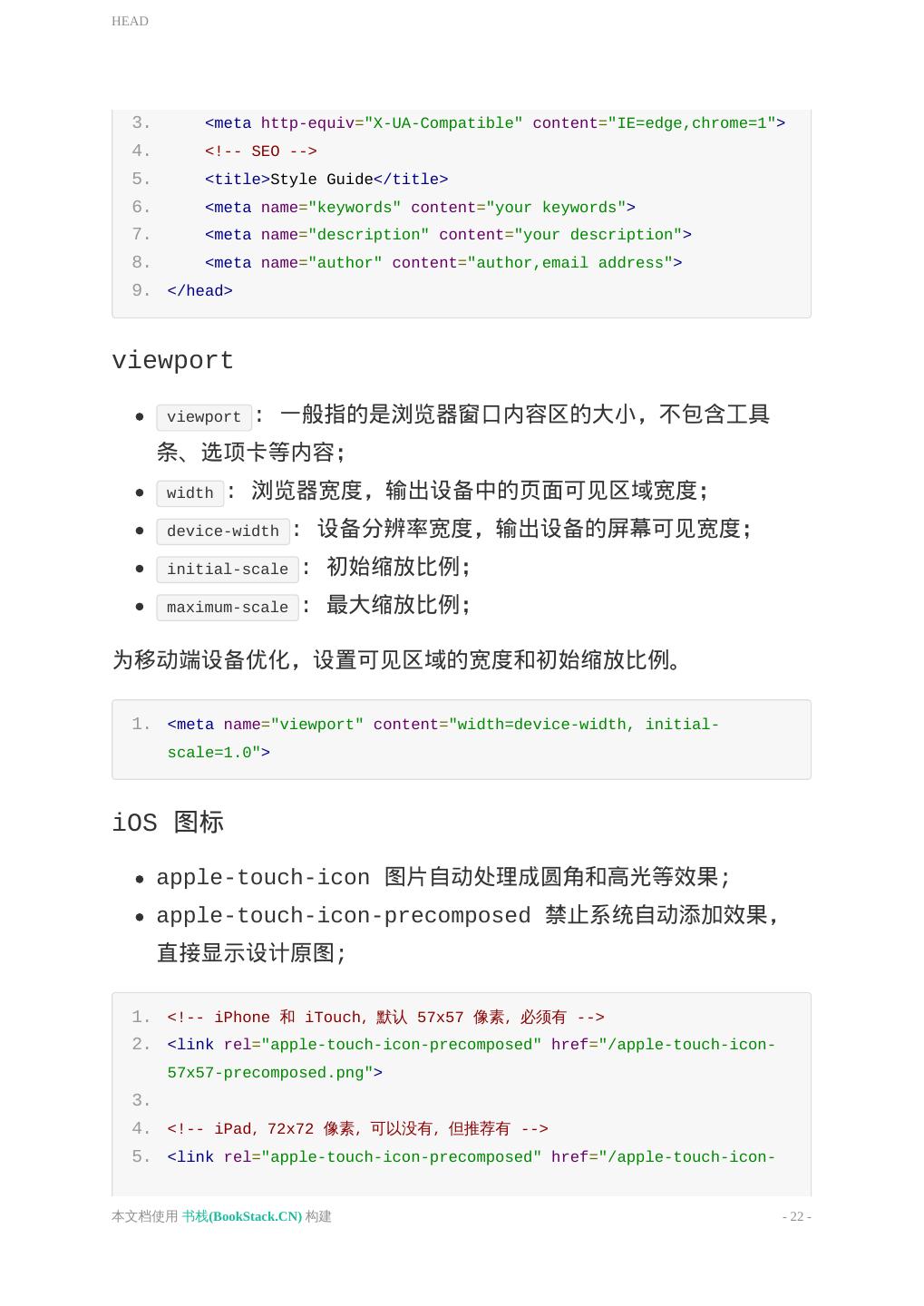 22 .HEAD 3. <meta http-equiv="X-UA-Compatible" content="IE=edge,chrome=1"> 4. <!-- SEO --> 5. <title>Style Guide</title> 6. <meta name="keywords" content="your keywords"> 7. <meta name="description" content="your description"> 8. <meta name="author" content="author,email address"> 9. </head> viewport viewport : 一般指的是浏览器窗口内容区的大小,不包含工具 条、选项卡等内容; width : 浏览器宽度,输出设备中的页面可见区域宽度; device-width : 设备分辨率宽度,输出设备的屏幕可见宽度; initial-scale : 初始缩放比例; maximum-scale : 最大缩放比例; 为移动端设备优化,设置可见区域的宽度和初始缩放比例。 1. <meta name="viewport" content="width=device-width, initial- scale=1.0"> iOS 图标 apple-touch-icon 图片自动处理成圆角和高光等效果; apple-touch-icon-precomposed 禁止系统自动添加效果, 直接显示设计原图; 1. <!-- iPhone 和 iTouch,默认 57x57 像素,必须有 --> 2. <link rel="apple-touch-icon-precomposed" href="/apple-touch-icon- 57x57-precomposed.png"> 3. 4. <!-- iPad,72x72 像素,可以没有,但推荐有 --> 5. <link rel="apple-touch-icon-precomposed" href="/apple-touch-icon- 本文档使用 书栈(BookStack.CN) 构建 - 22 -
