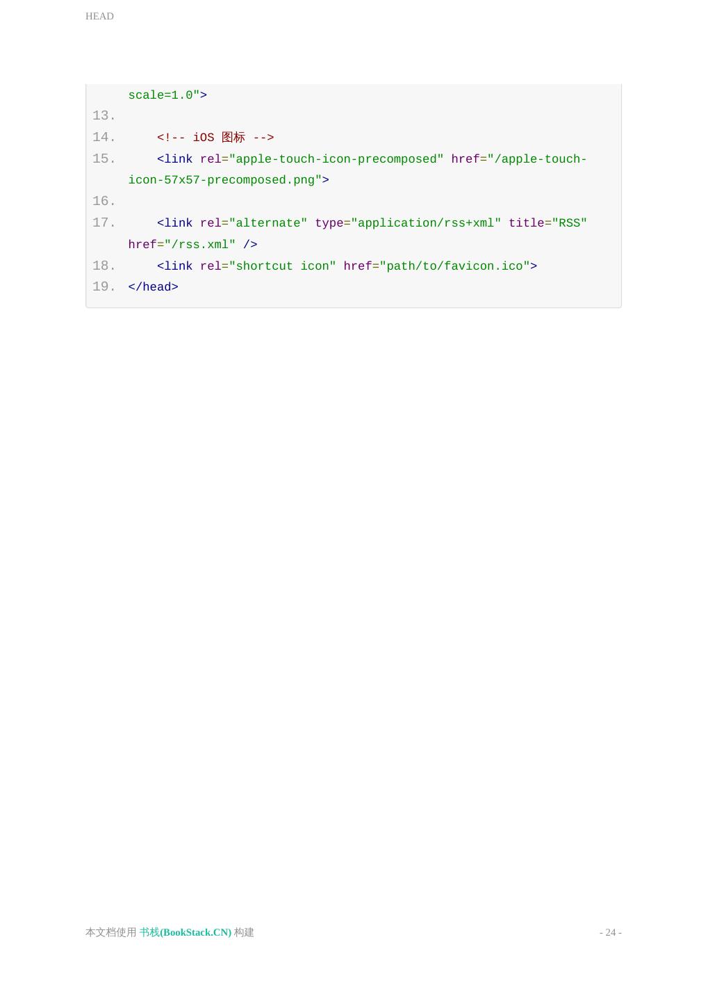 24 .HEAD scale=1.0"> 13. 14. <!-- iOS 图标 --> 15. <link rel="apple-touch-icon-precomposed" href="/apple-touch- icon-57x57-precomposed.png"> 16. 17. <link rel="alternate" type="application/rss+xml" title="RSS" href="/rss.xml" /> 18. <link rel="shortcut icon" href="path/to/favicon.ico"> 19. </head> 本文档使用 书栈(BookStack.CN) 构建 - 24 -