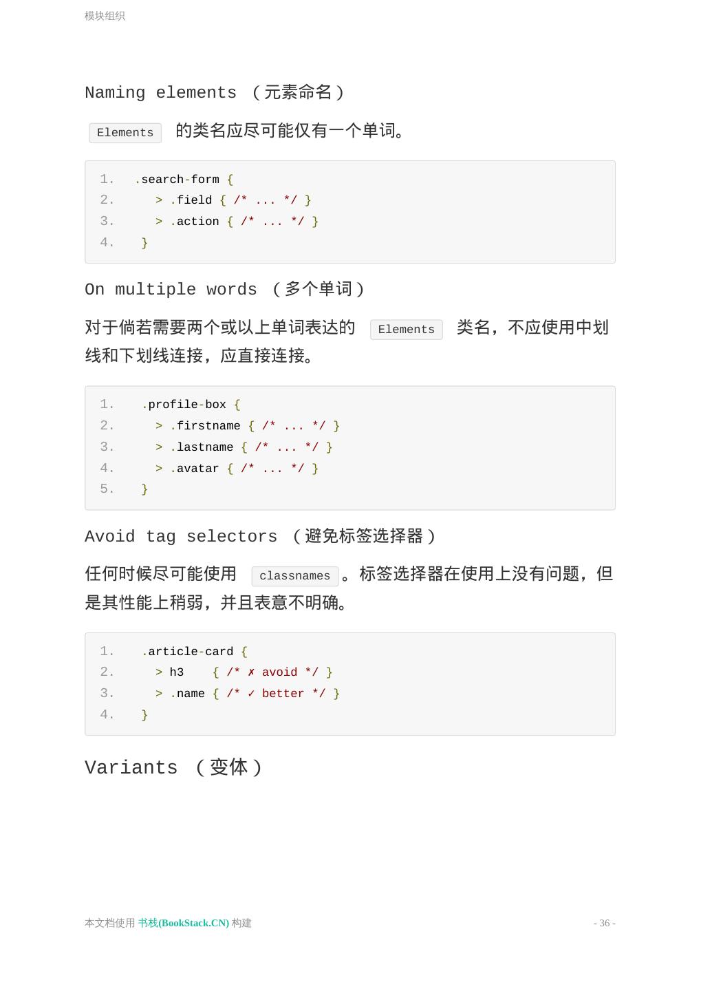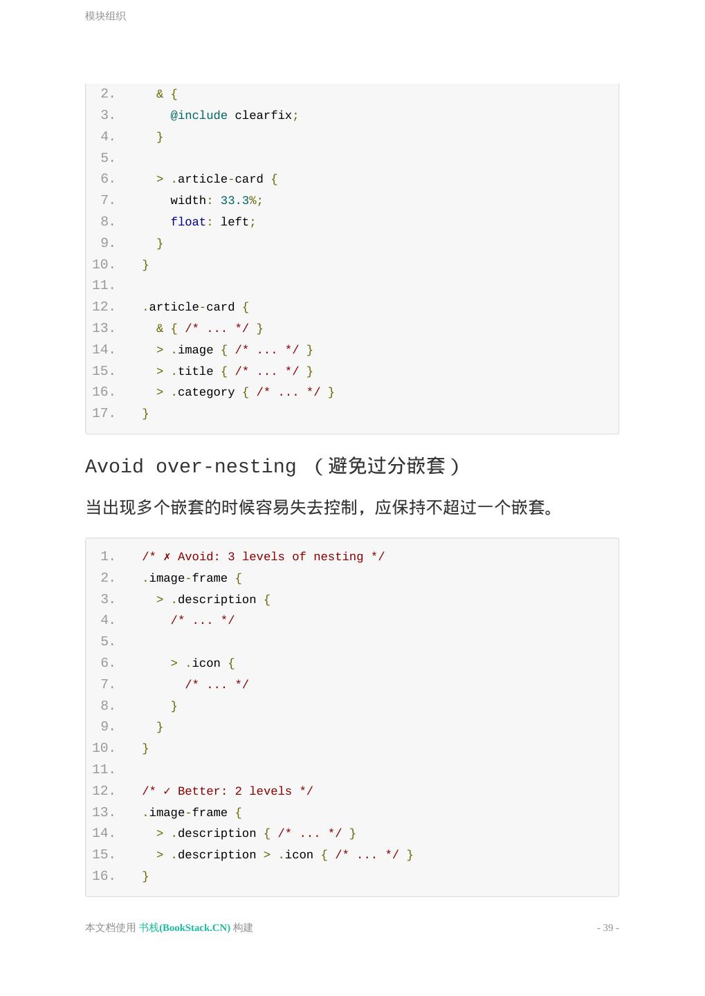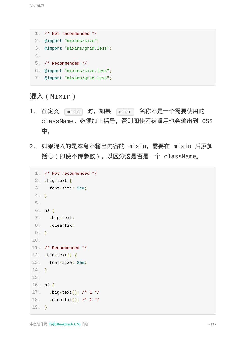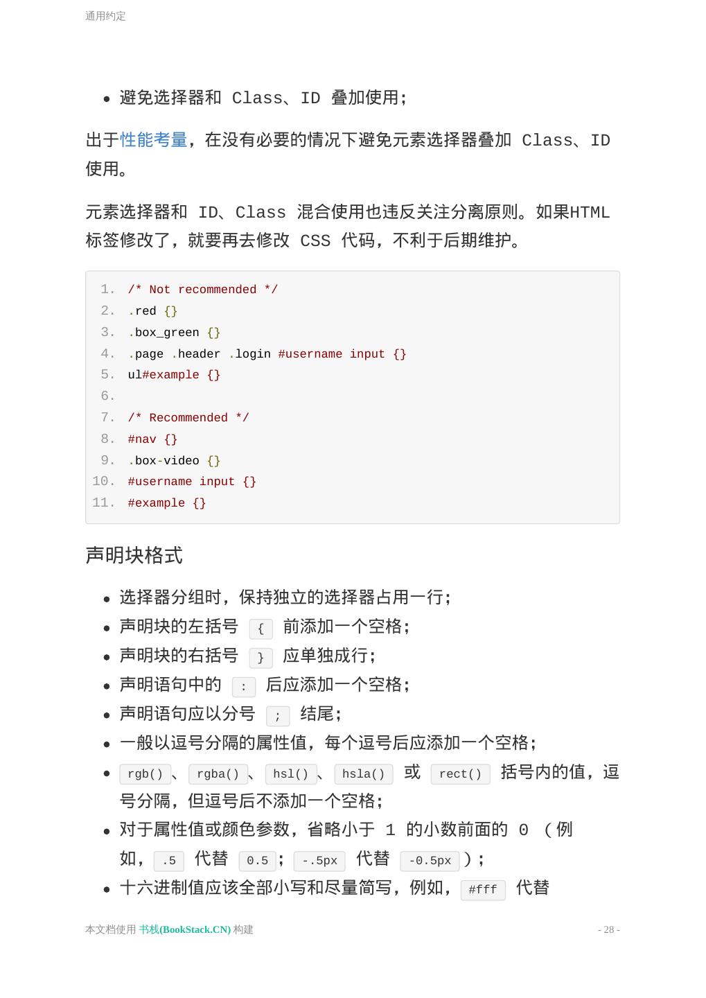 28 .通用约定 避免选择器和 Class、ID 叠加使用; 出于性能考量,在没有必要的情况下避免元素选择器叠加 Class、ID 使用。 元素选择器和 ID、Class 混合使用也违反关注分离原则。如果HTML 标签修改了,就要再去修改 CSS 代码,不利于后期维护。 1. /* Not recommended */ 2. .red {} 3. .box_green {} 4. .page .header .login #username input {} 5. ul#example {} 6. 7. /* Recommended */ 8. #nav {} 9. .box-video {} 10. #username input {} 11. #example {} 声明块格式 选择器分组时,保持独立的选择器占用一行; 声明块的左括号 { 前添加一个空格; 声明块的右括号 } 应单独成行; 声明语句中的 : 后应添加一个空格; 声明语句应以分号 ; 结尾; 一般以逗号分隔的属性值,每个逗号后应添加一个空格; rgb() 、 rgba() 、 hsl() 、 hsla() 或 rect() 括号内的值,逗 号分隔,但逗号后不添加一个空格; 对于属性值或颜色参数,省略小于 1 的小数前面的 0 (例 如, .5 代替 0.5 ; -.5px 代替 -0.5px ); 十六进制值应该全部小写和尽量简写,例如, #fff 代替 本文档使用 书栈(BookStack.CN) 构建 - 28 -