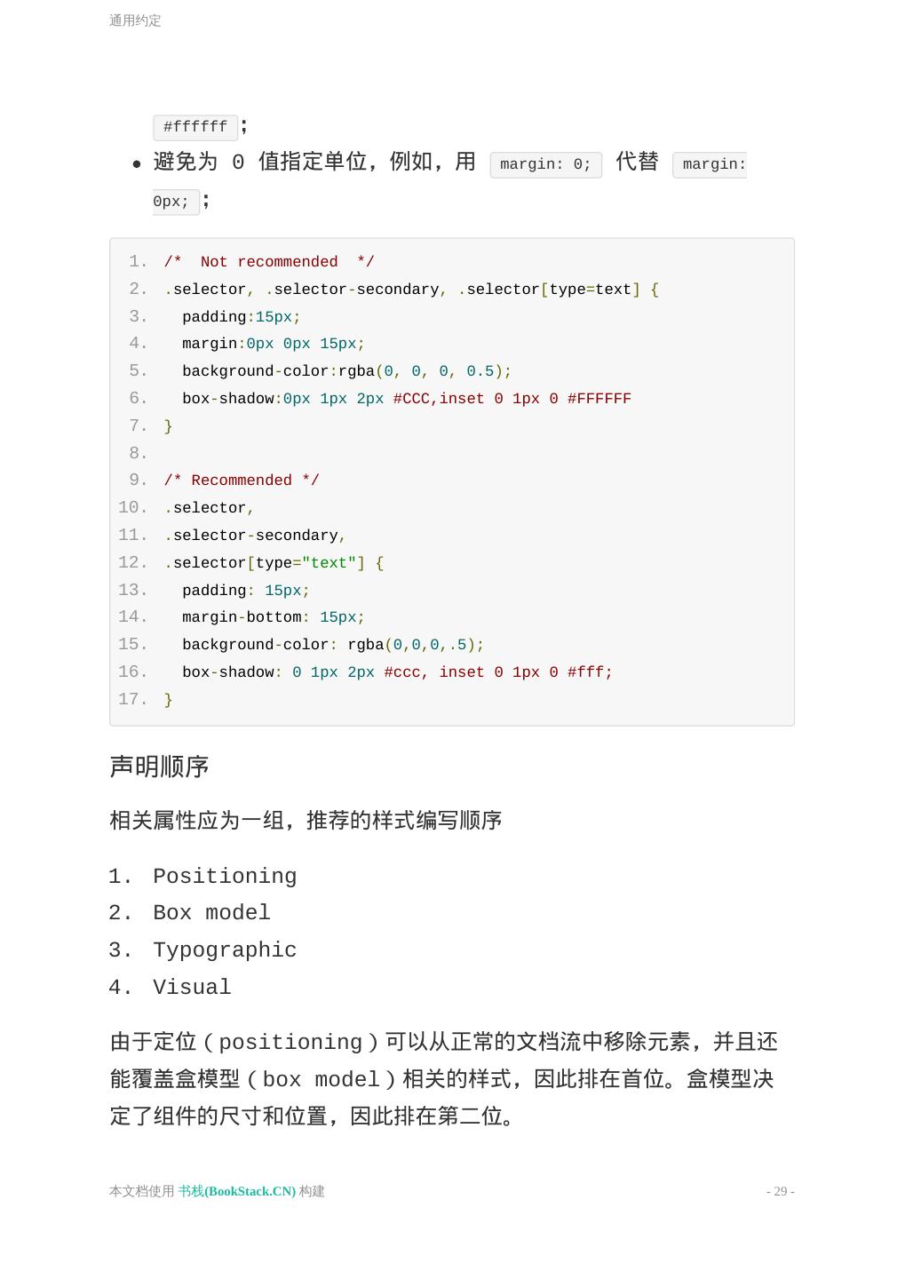 29 .通用约定 #ffffff ; 避免为 0 值指定单位,例如,用 margin: 0; 代替 margin: 0px; ; 1. /* Not recommended */ 2. .selector, .selector-secondary, .selector[type=text] { 3. padding:15px; 4. margin:0px 0px 15px; 5. background-color:rgba(0, 0, 0, 0.5); 6. box-shadow:0px 1px 2px #CCC,inset 0 1px 0 #FFFFFF 7. } 8. 9. /* Recommended */ 10. .selector, 11. .selector-secondary, 12. .selector[type="text"] { 13. padding: 15px; 14. margin-bottom: 15px; 15. background-color: rgba(0,0,0,.5); 16. box-shadow: 0 1px 2px #ccc, inset 0 1px 0 #fff; 17. } 声明顺序 相关属性应为一组,推荐的样式编写顺序 1. Positioning 2. Box model 3. Typographic 4. Visual 由于定位(positioning)可以从正常的文档流中移除元素,并且还 能覆盖盒模型(box model)相关的样式,因此排在首位。盒模型决 定了组件的尺寸和位置,因此排在第二位。 本文档使用 书栈(BookStack.CN) 构建 - 29 -