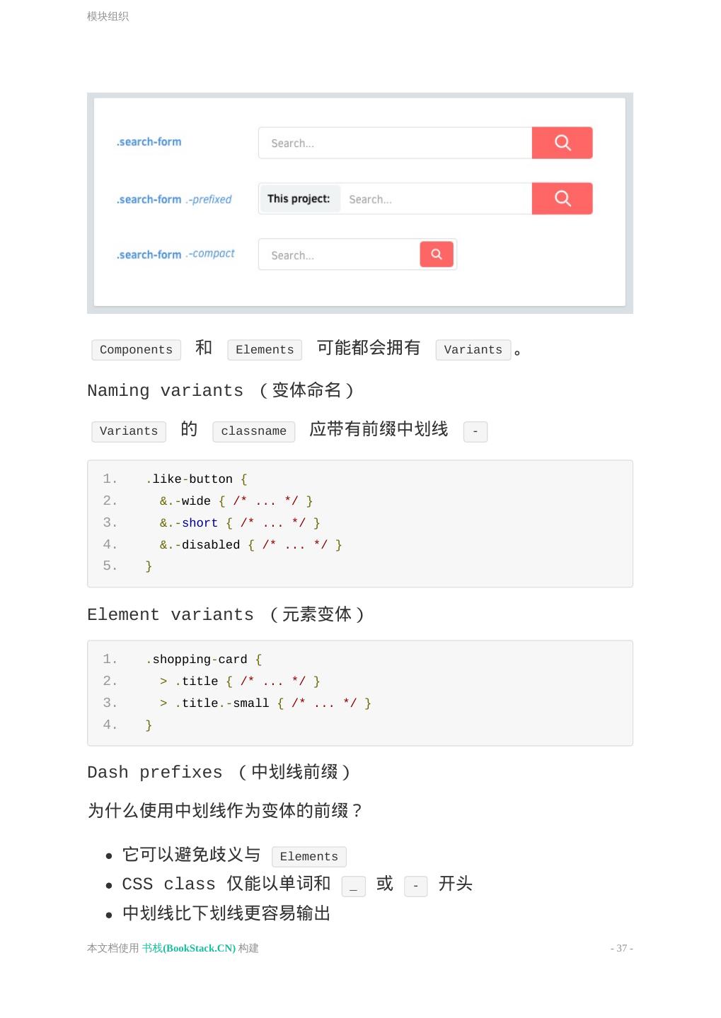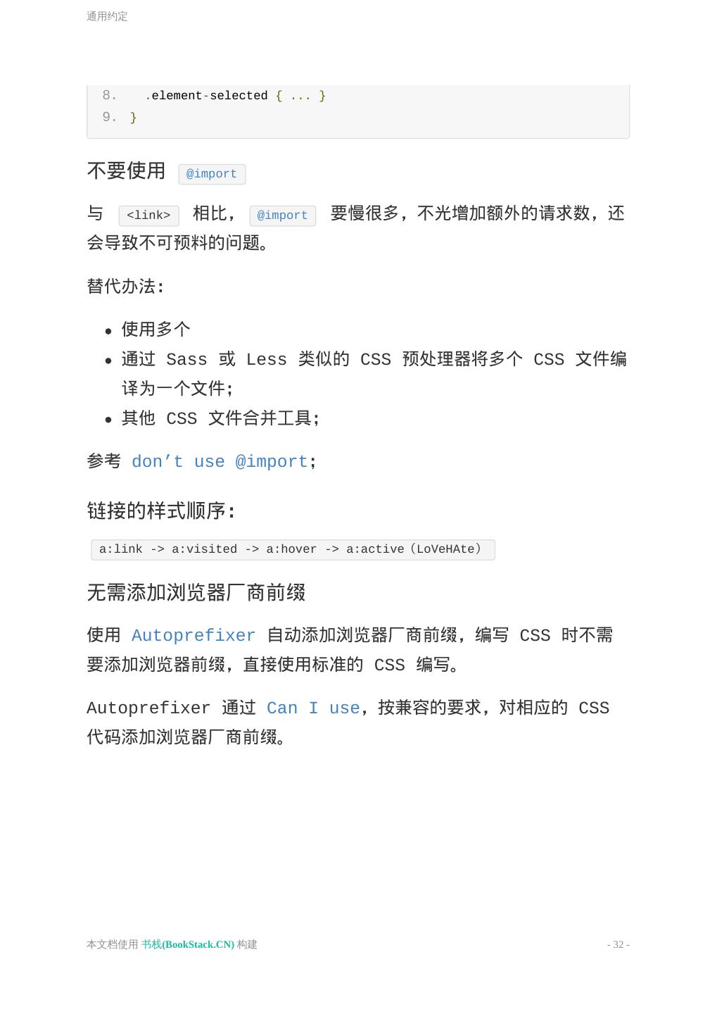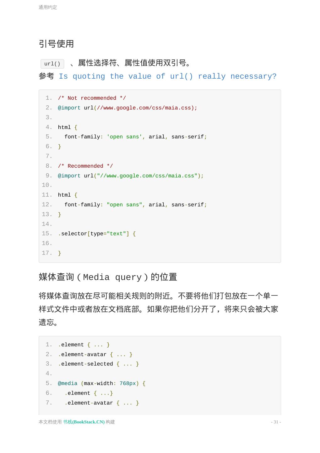 26 .通用约定 通用约定 通用约定 代码组织 Class 和 ID 声明块格式 声明顺序 引号使用 媒体查询(Media query)的位置 不要使用 @import 链接的样式顺序: 无需添加浏览器厂商前缀 通用约定 代码组织 以组件为单位组织代码段; 制定一致的注释规范; 组件块和子组件块 以及 声明块 之间使用一空行分隔, 子组件块 之间三 空行分隔; 如果使用了多个 CSS 文件,将其按照组件而非页面的形式分拆, 因为页面会被重组,而组件只会被移动; 良好的注释是非常重要的。请留出时间来描述组件(component)的 工作方式、局限性和构建它们的方法。不要让你的团队其它成员 来猜 测一段不通用或不明显的代码的目的。 提示:通过配置编辑器,可以提供快捷键来输出一致认可的注释模式。 本文档使用 书栈(BookStack.CN) 构建 - 26 -